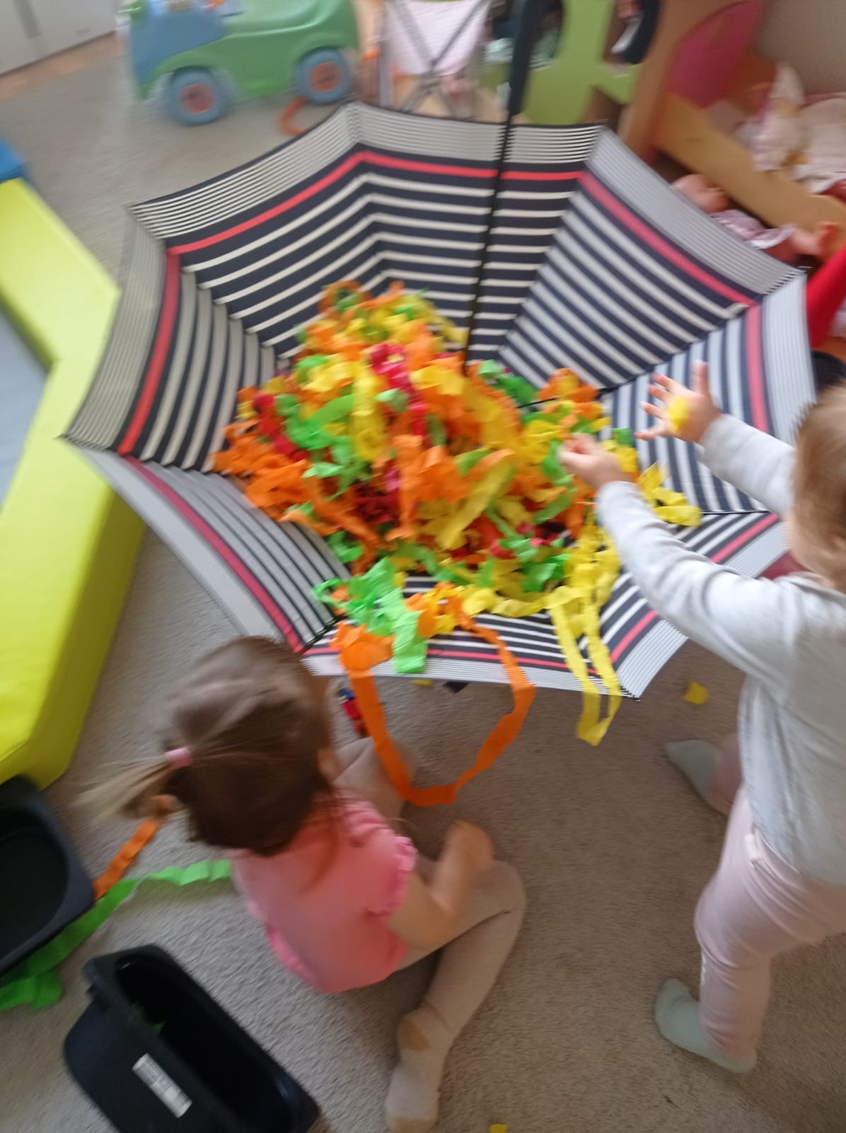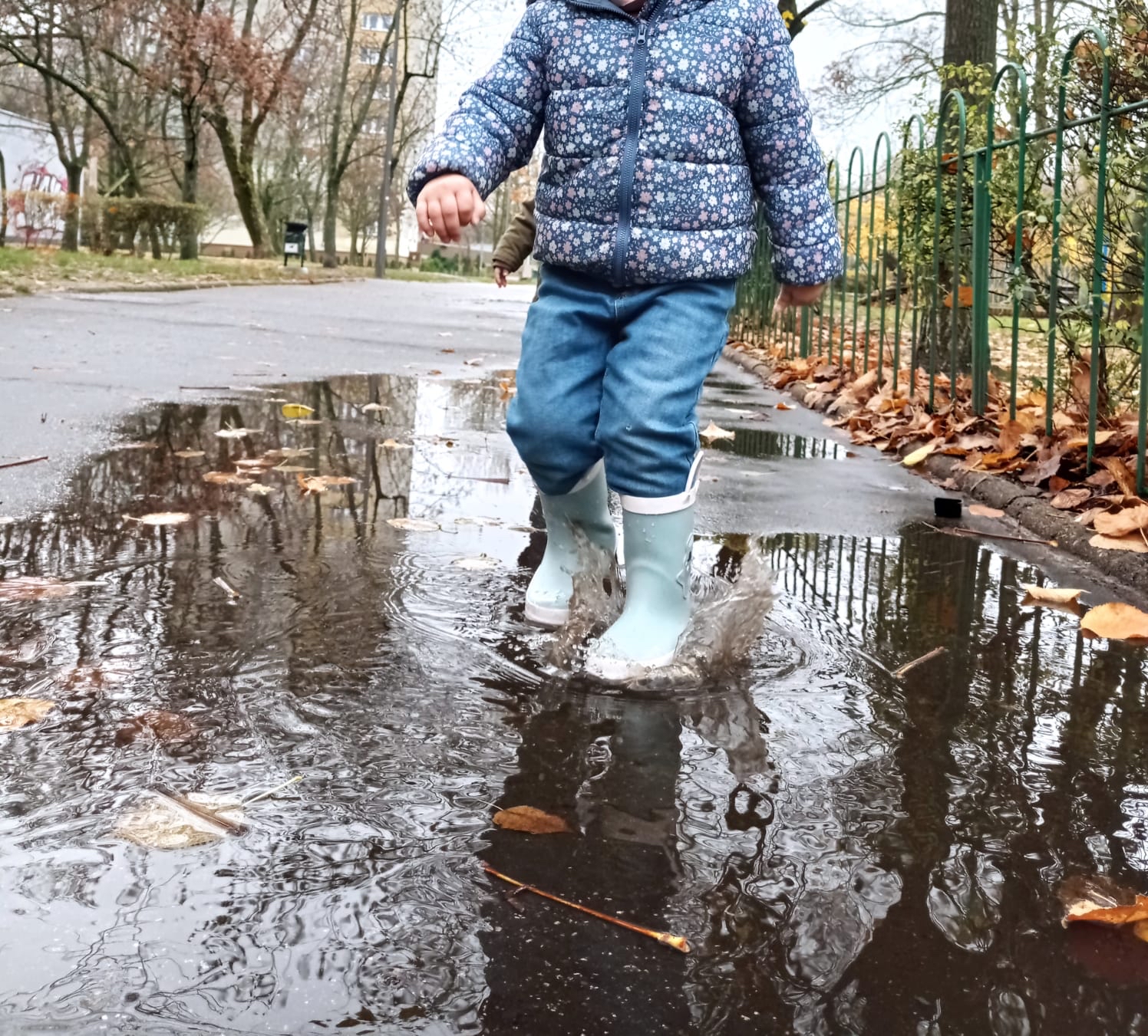 Listopad, jak to zwykle bywa, przyniósł deszczową aurę, a dzięki niej dzieci mogły biegać po kałużach, skakać, chlapać i oglądać odbicia drzew. To najlepsze warunki do ćwiczenia koordynacji ruchowej i jednocześnie do wzbudzania dziecięcej ciekawości.