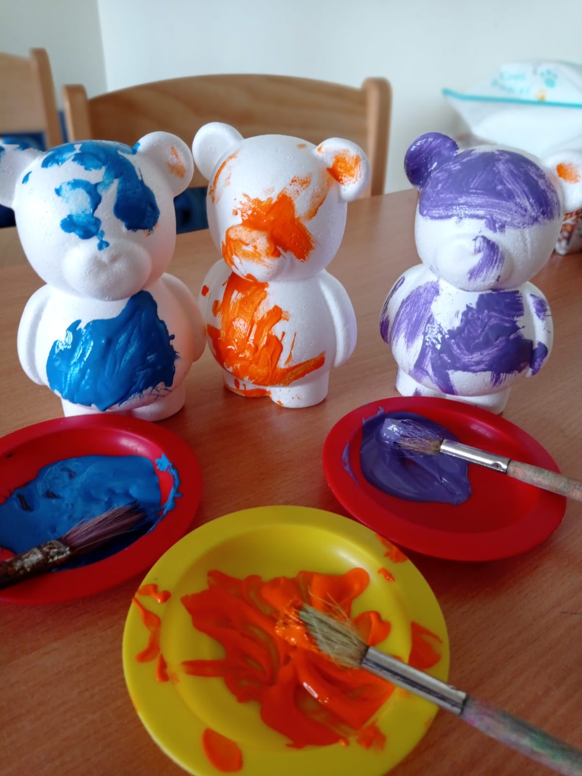 25 listopada obchodziliśmy również Święto Misia. Tym razem czekała na nas wspólna kolorowanka, którą malowaliśmy… stopami! Miś wyszedł uroczy i teraz codziennie wita dzieci w korytarzu.