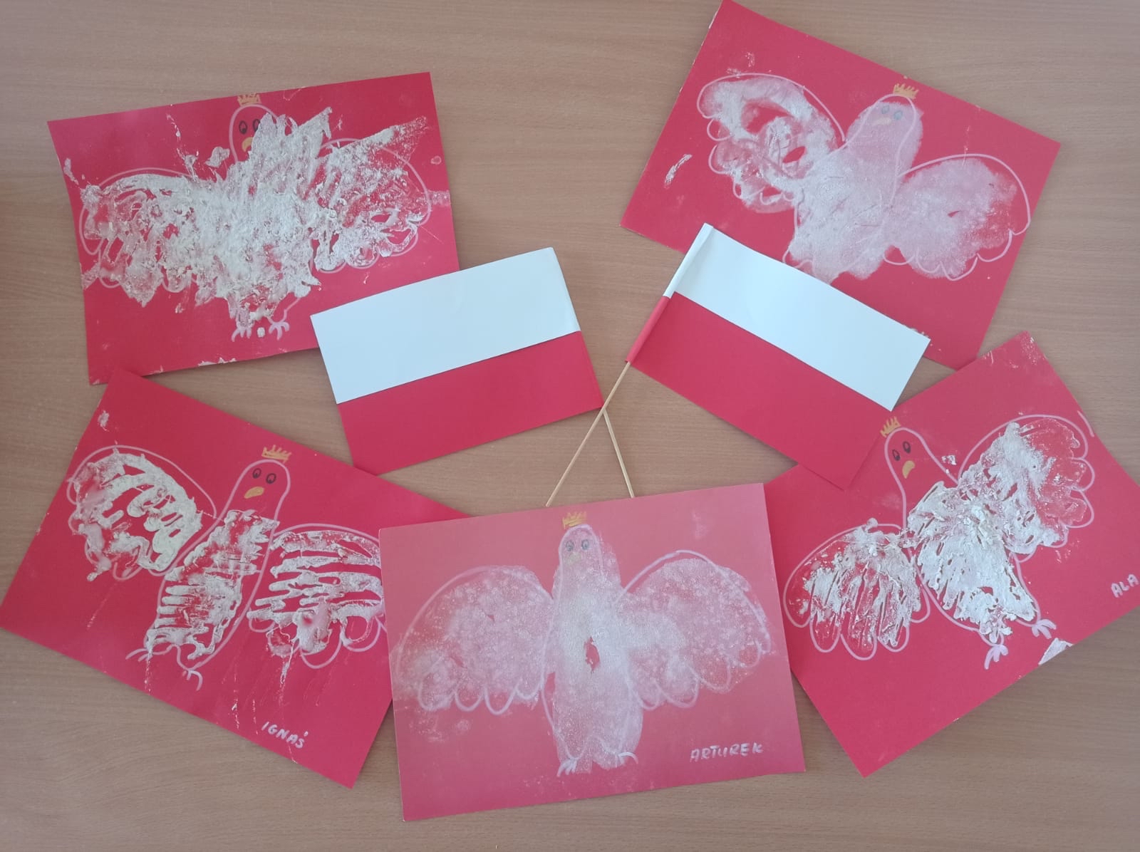 Przygotowaliśmy także prace patriotyczne z okazji 11 listopada. Orły prawie odfrunęły niczym mąka, którą sypaliśmy skrzydła. 😉
