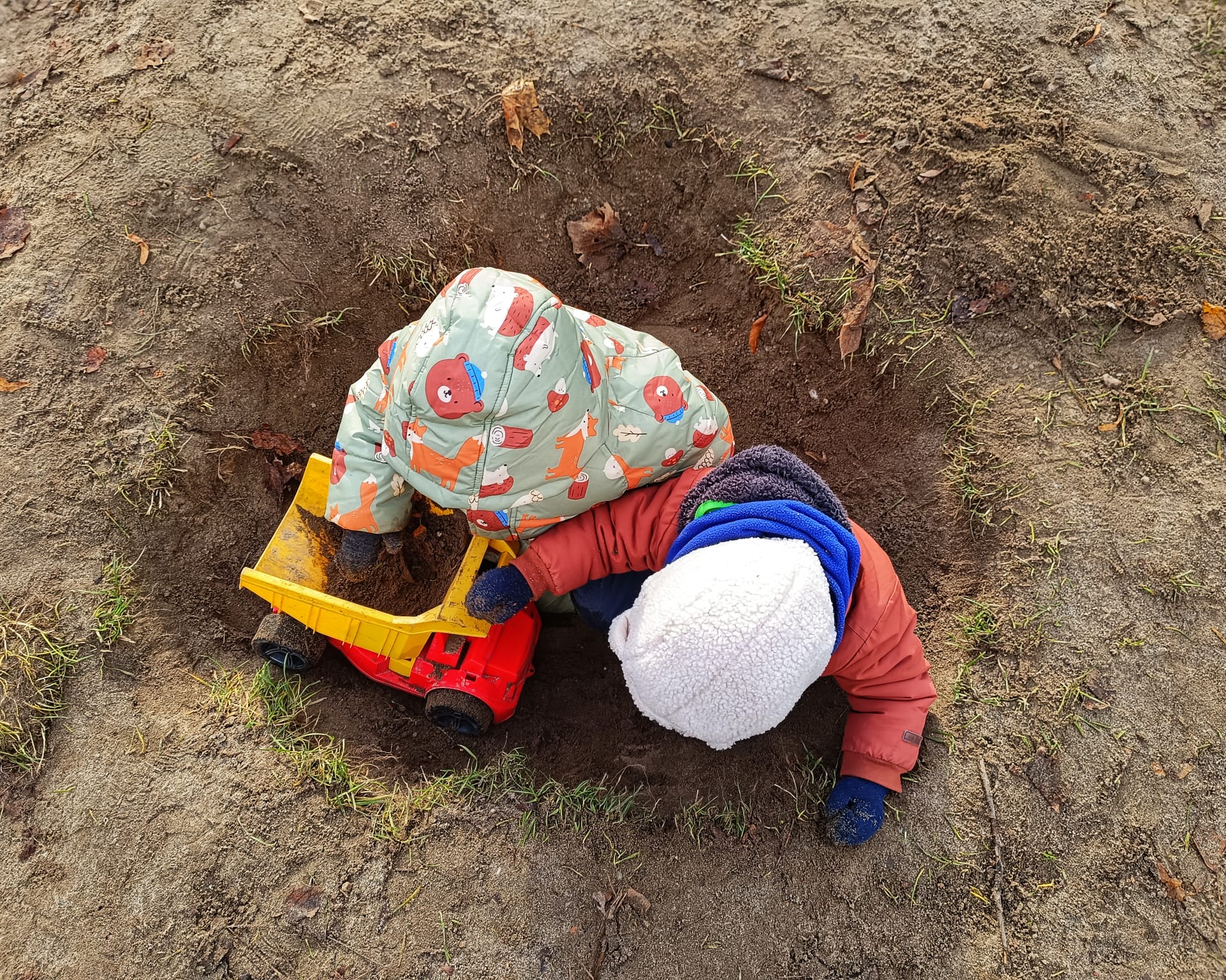 Na placu zabaw mali odkrywcy tworzyli własne konstrukcje, kopiąc wielkie doły – przy tym nie brakowało śmiechu i wspólnej pracy.🙂