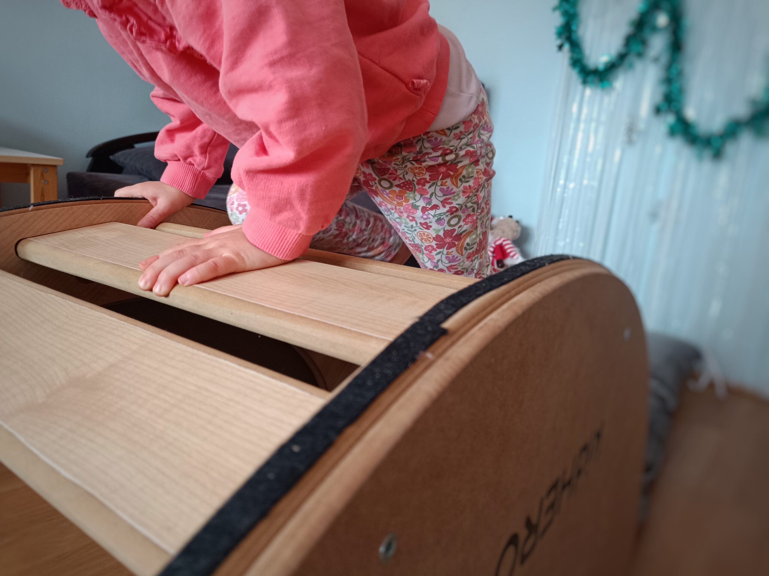 W czasie niepogody dzieci korzystały z przygotowanej w sali ścieżki sensorycznej oraz drewnianego mostka do wspinania, rozwijając równowagę i ćwicząc koordynację.