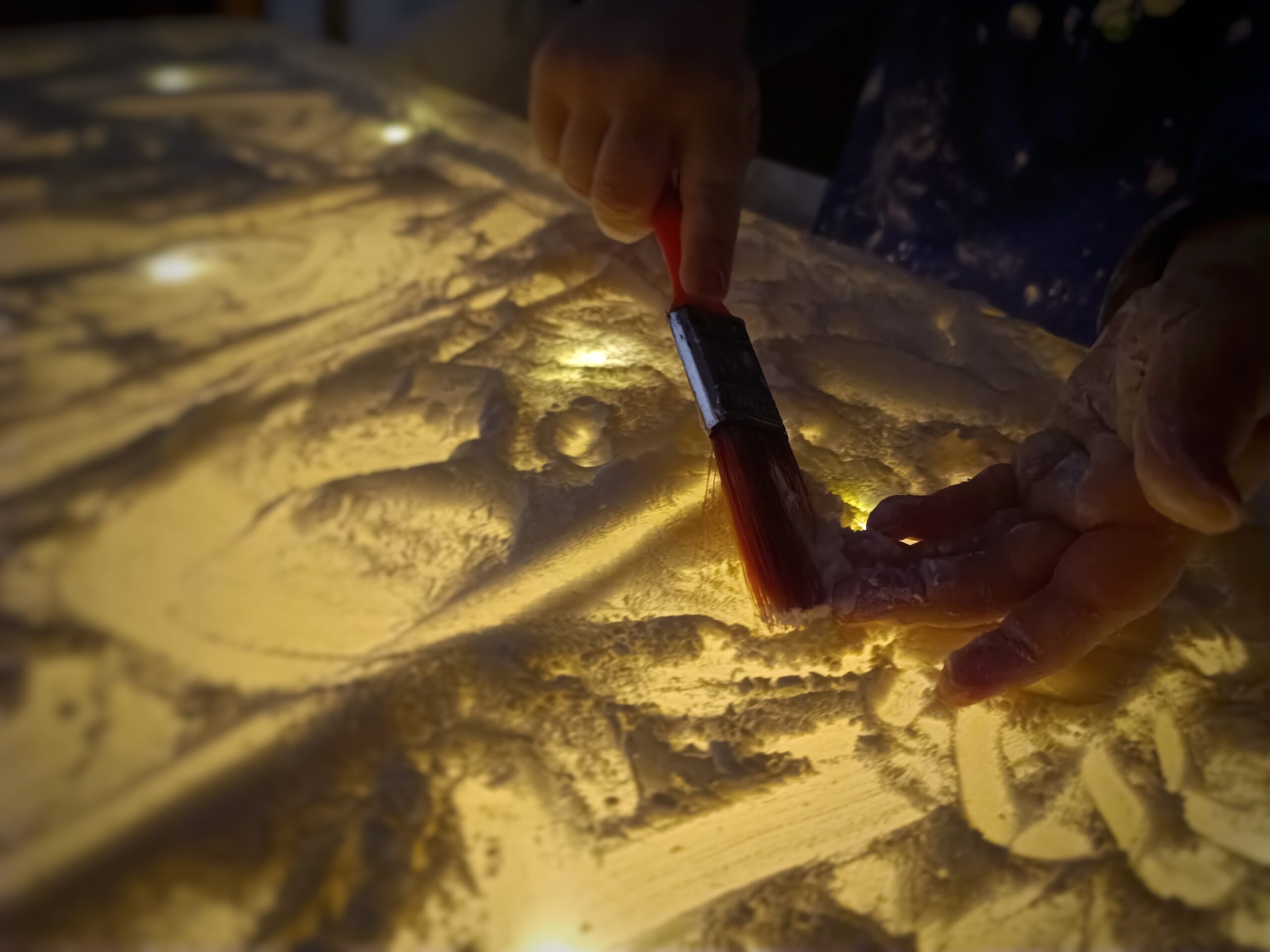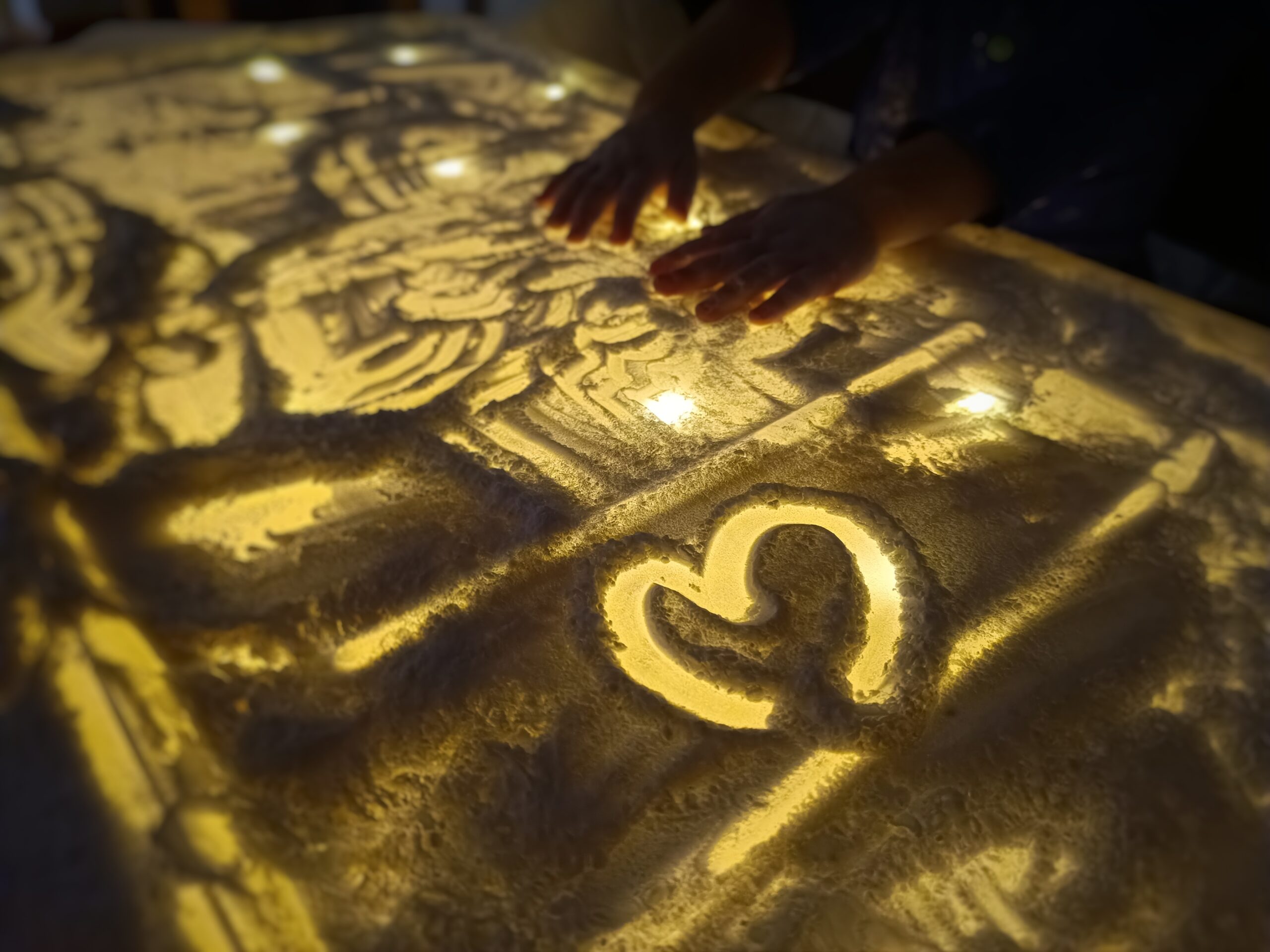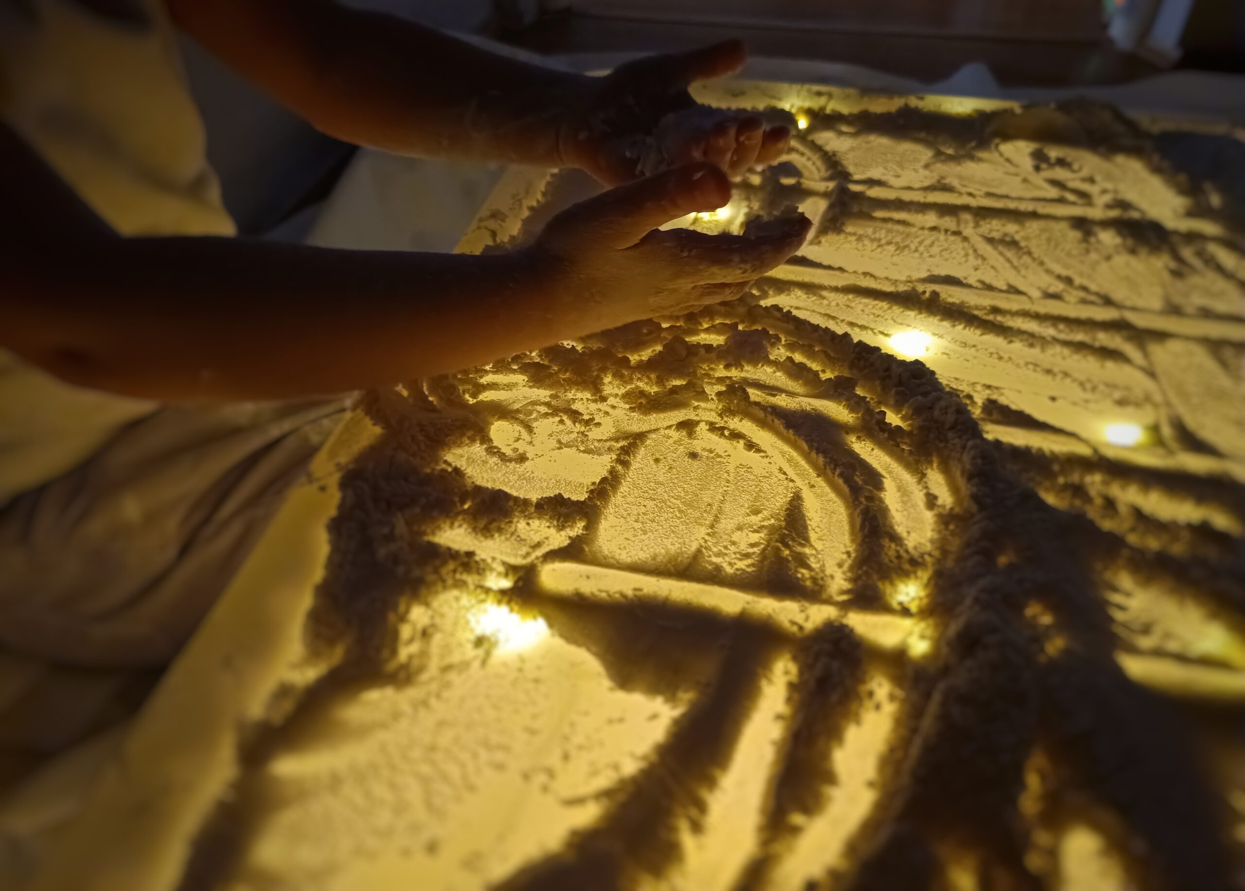 Jedną z ulubionych aktywności dzieci były zajęcia inspirowane rysowaniem w piasku. Zamiast piasku wykorzystaliśmy mąkę rozsypaną na podświetlonej powierzchni. Zabawa ze światłem i mąką rozwijała wyobraźnię, zachęcała do eksperymentowania oraz wspierała rozwój motoryki małej.