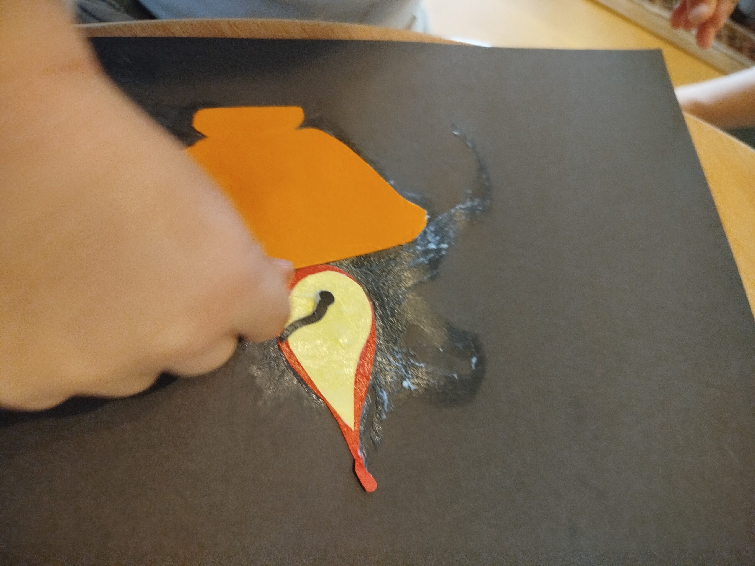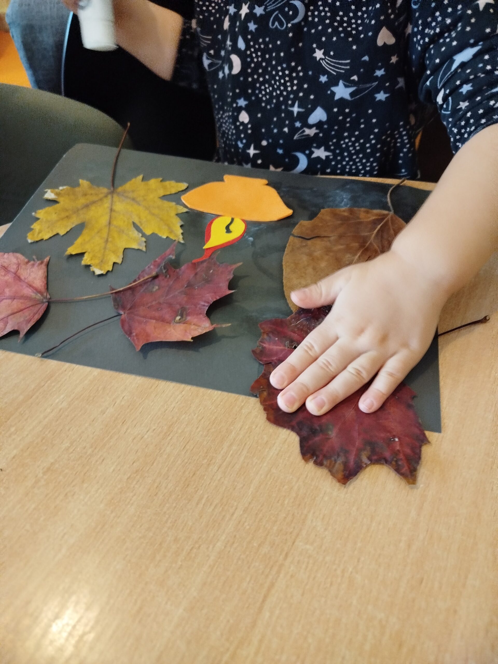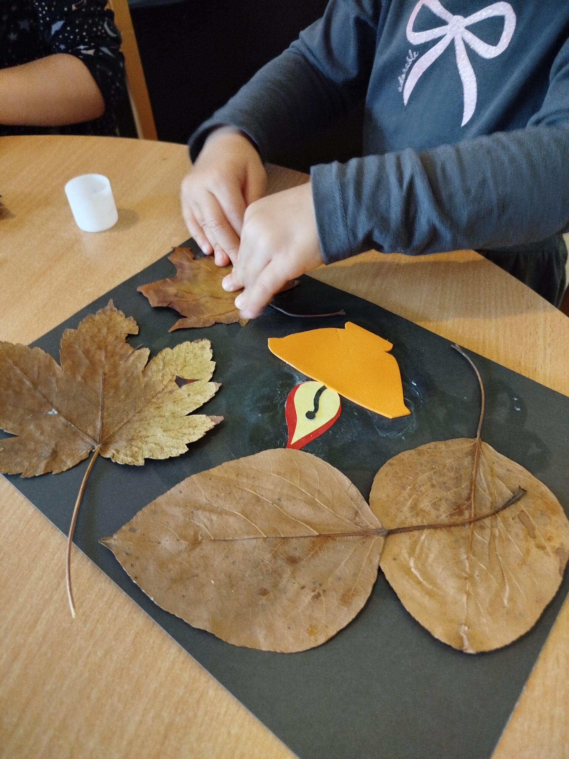 Z okazji Święta Zmarłych dzieci wykonały pracę z palącym się zniczem na czarnej kartce, ozdobioną jesiennymi liśćmi. Zapamiętały nowe słowo „znicz” i chętnie później opowiadały, że widziały światełka na cmentarzu.