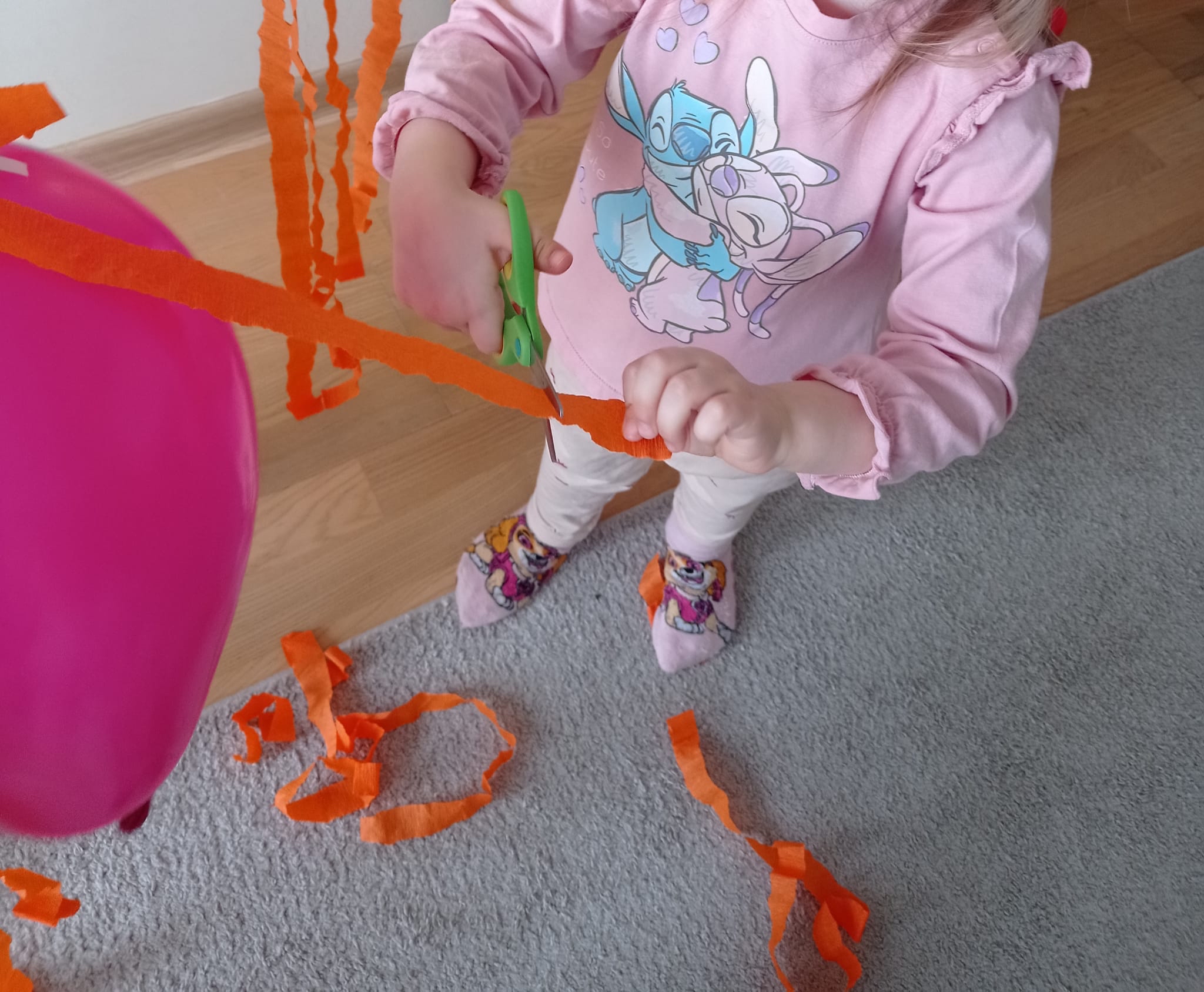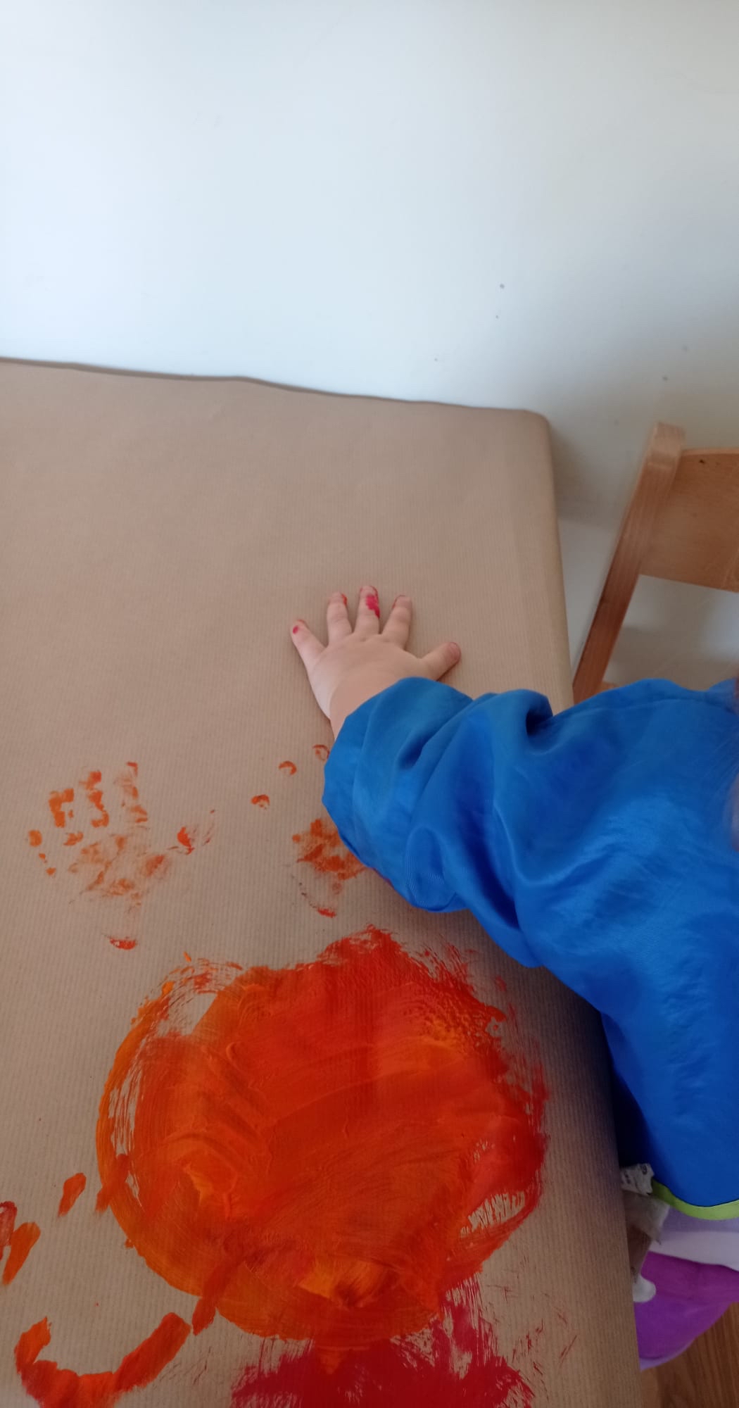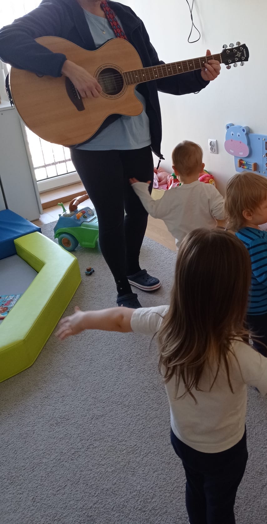 Codziennie towarzyszyła nam muzyka na żywo. Gitara, śpiew i spontaniczny ruch. Było dużo radości i wspólnego bycia razem. Nie brakowało zabaw sensorycznych: malowania rękami, mieszania, przelewania, wyklejania oraz eksperymentowania z fakturą i kolorem. Ćwiczyliśmy małe rączki, przesypując, wkładając i wyciągając różne przedmioty. Krojenie, wałkowanie, ugniatanie, wszystko to dzieje się spokojnie, w swoim tempie.