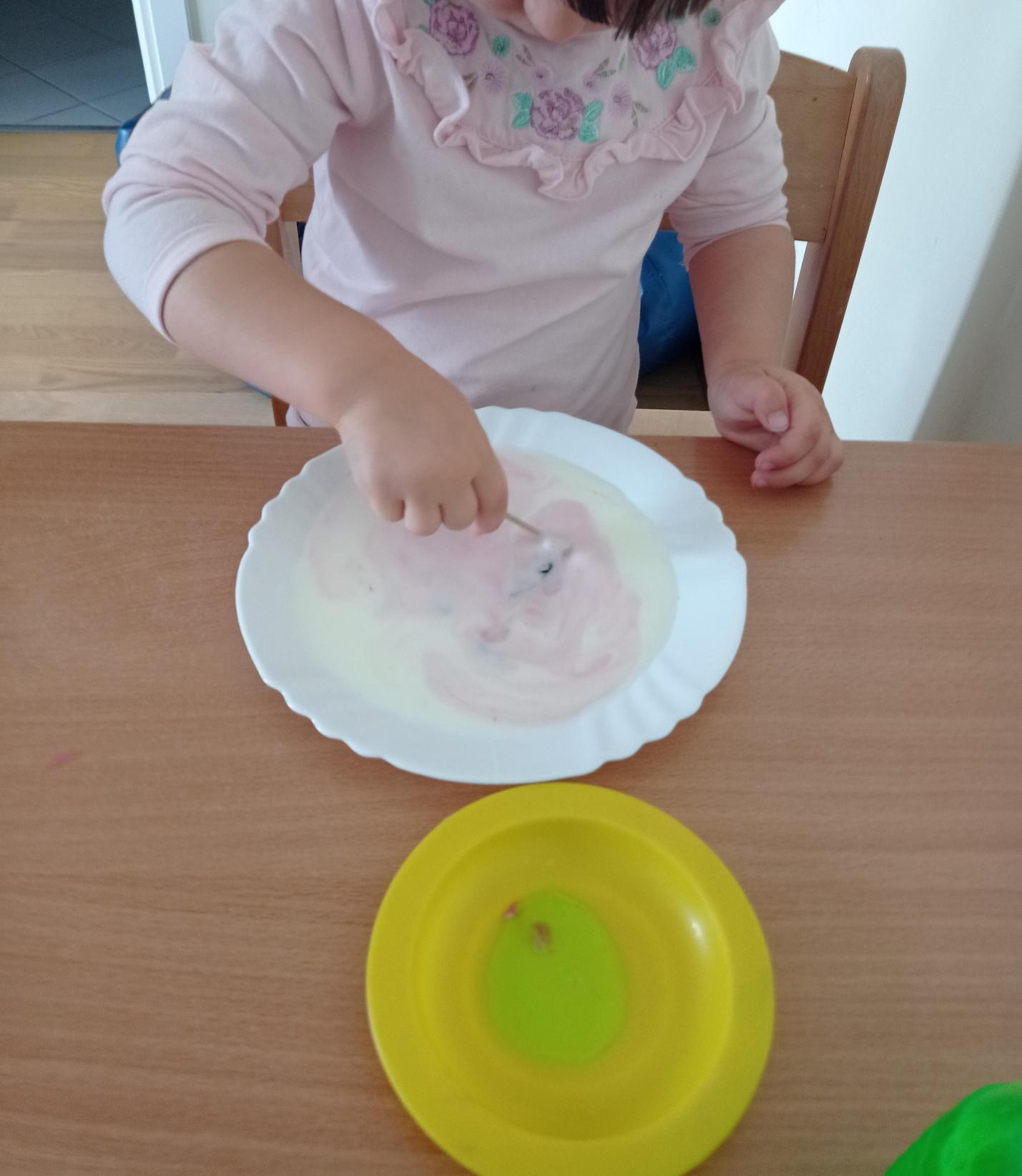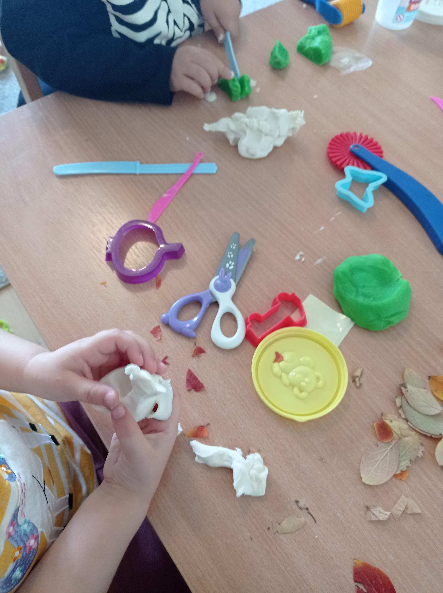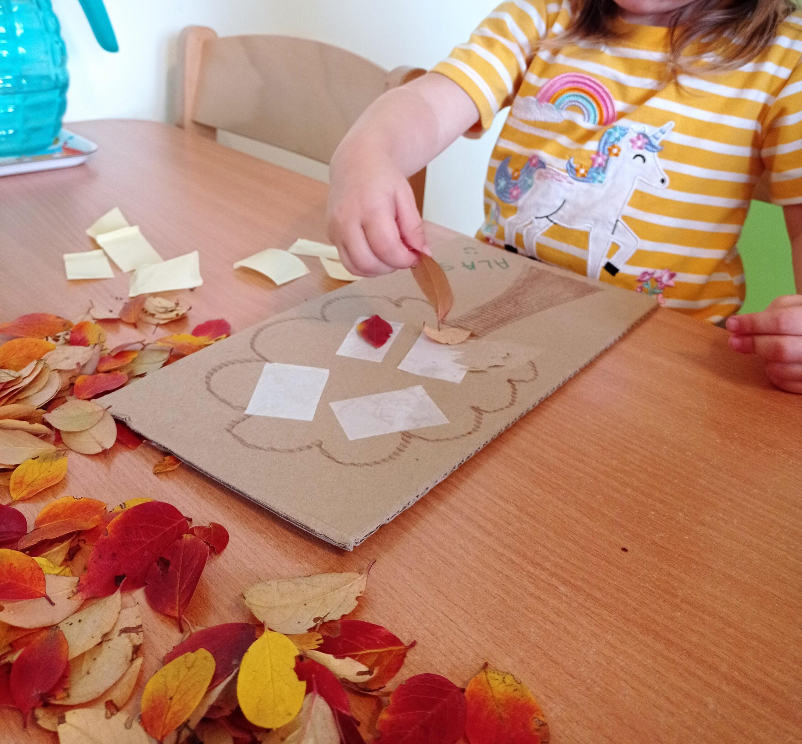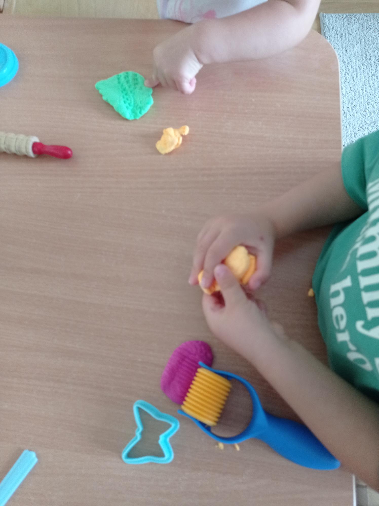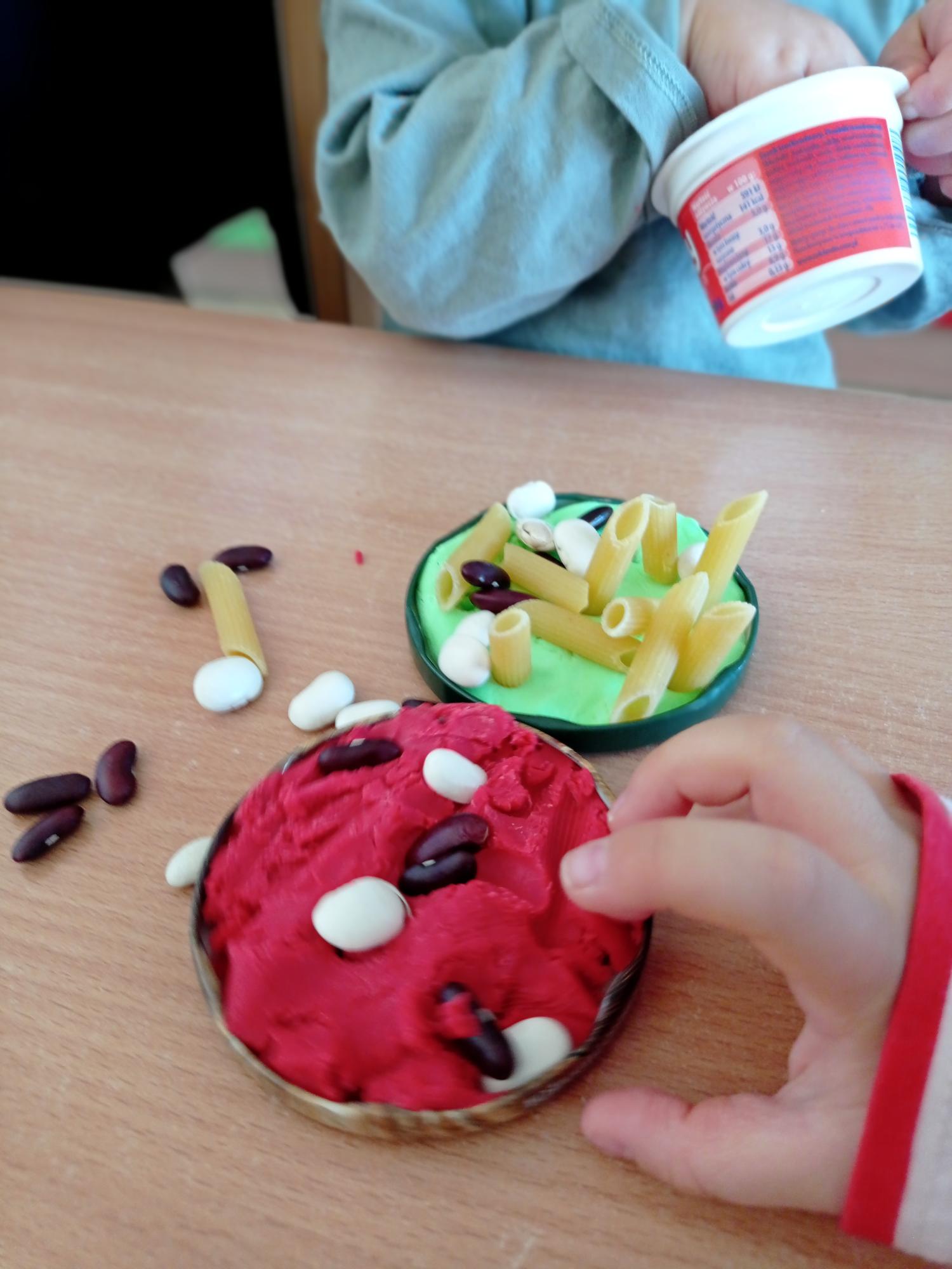Często bawimy się ciastoliną – ugniatanie, wałkowanie i krojenie to świetny trening dla małych rączek. Z liści, patyczków i innych znalezisk tworzyliśmy prace plastyczne. Pamiętając o tym, że proces tworzenia jest najważniejszy, dając dzieciom swobodę w wykonywaniu prac.