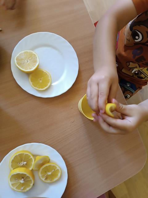 Orzeźwialiśmy się w upalny dzień pyszną cytrynową lemoniadą, którą sami przyrządziliśmy,wyciskając cytryny.Poznaliśmy kwaśny smak tych owoców, robiąc przy tym śmieszne minki.