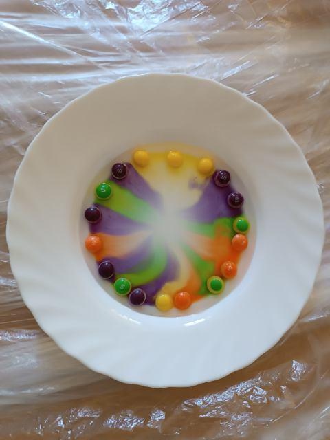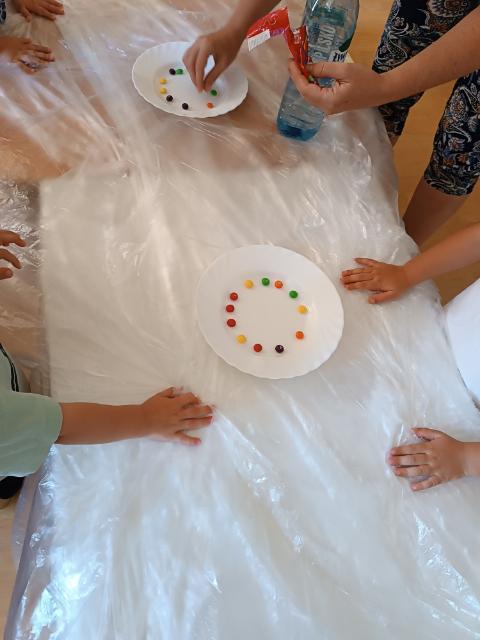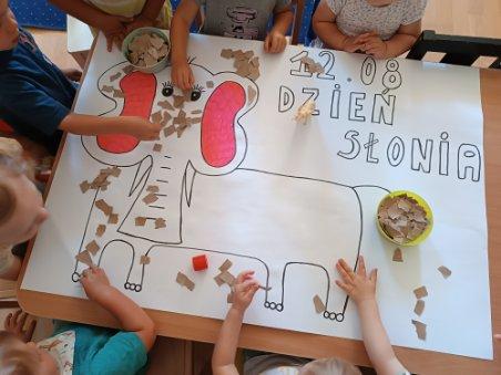 Swój dzień miał także słoń.Na dużym brystolu wyklejaliśmy tego sympatycznego zwierza.Oprócz prac plastycznych mieliśmy również dużo sensoryki.Z kolorowych Skittelsów z dodatkiem wody powstała piękna tęcza.Podziwialiśmy to piękne zjawisko.
