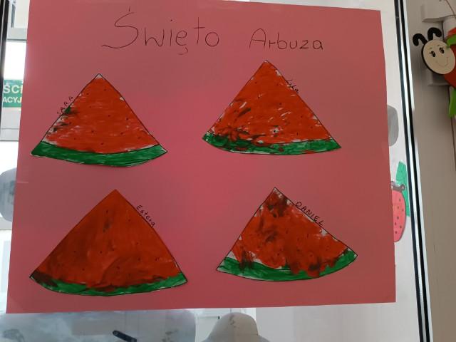 Miesiąc sierpień upłynął Nam na różnych ciekawych aktywnościach.Obchodziliśmy święto Arbuza, wykonując apetyczną pracę plastyczną i degustując smaczny owoc.Zjedliśmy wszystko,zostały same pestki:)