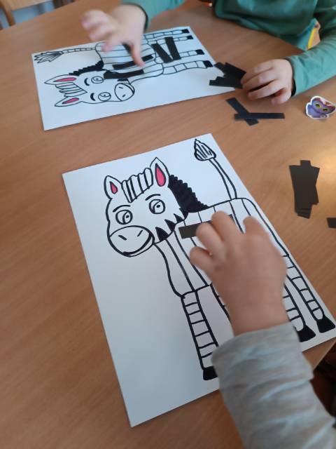 31.01 świętowała zebra.Z tej okazji wykonaliśmy „paskowe” prace plastyczne.Zebra to nie tylko sympatyczne zwierzątko,ale także potocznie mówiąc, przejście dla pieszych.Chodziliśmy po czarno-białych pasach,poznając przy tym zasady ruchu drogowego: światło zielone,światło czerwone,słuchając przy okazji pouczającej piosenki.
