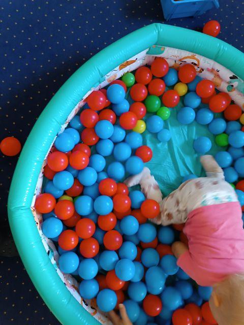 W żłobeczku mamy basen z piłkami z którego chętnie korzystamy . Piłki są kolorowe ,więc przy okazji możemy uczyć się kolorów.Nauka poprzez zabawę jest najlepsza.