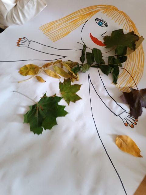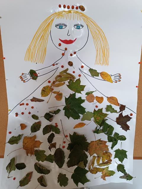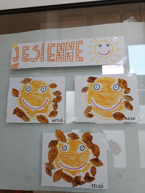 W tym miesiącu zaczęła się jesień.Z okazji jej przyjścia wykonaliśmy prace plastyczne z nią związane.Z kolorowych listków zrobiliśmy jesienne słoneczka, które świecą u Nas zawsze,nawet w pochmurny dzień.Nie mogło również zabraknąć postaci samej Pani Jesieni ,która miała piękną suknię ozdobioną skarbami tej złocistej pory roku.