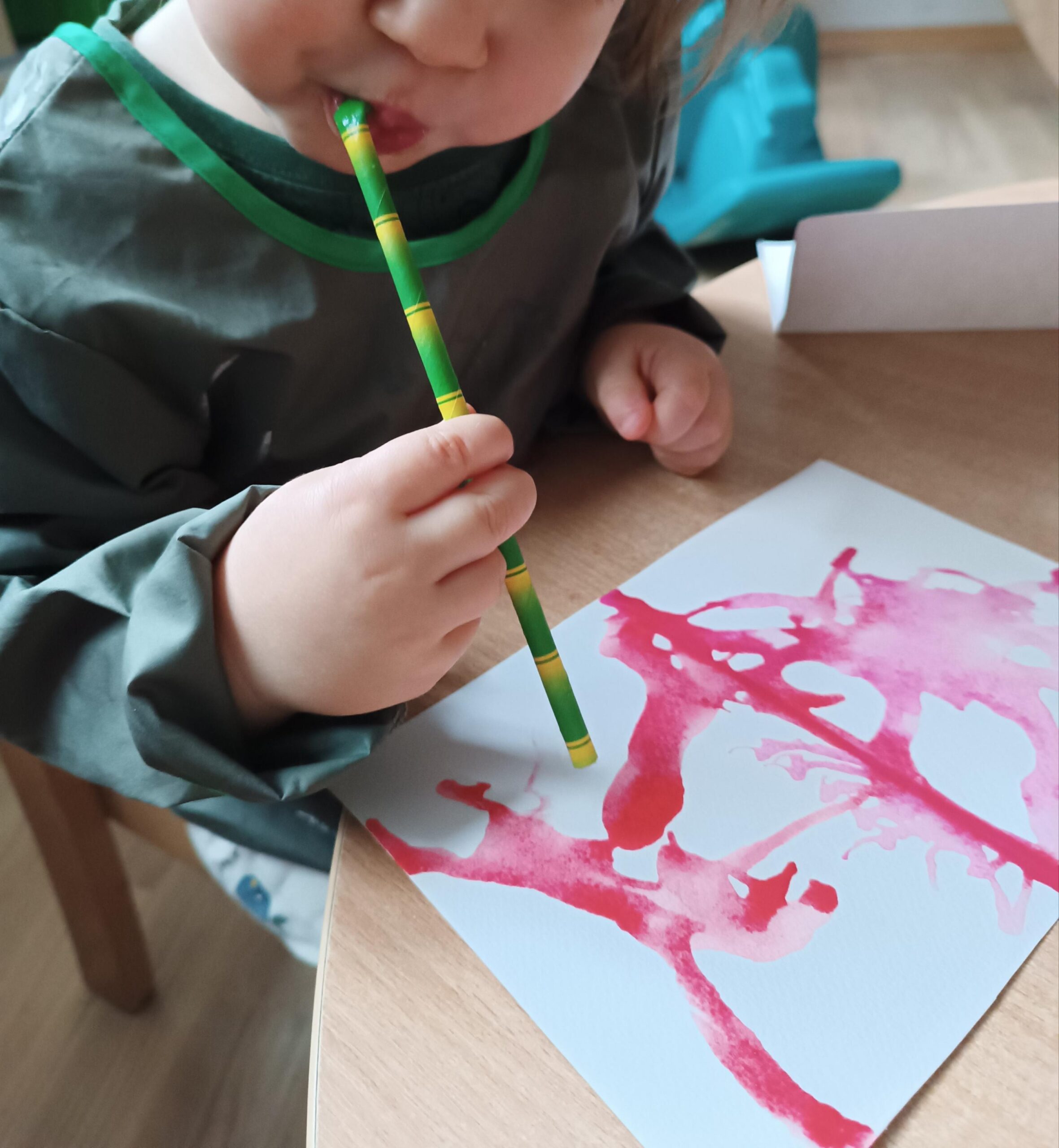 Świętowaliśmy również Walentynki, tworząc kartki dla naszych najbliższych. Ozdabialiśmy papier farbami wykorzystując różne techniki malarskie. Najbardziej spodobało się malowanie ustami przez słomkę 😀.