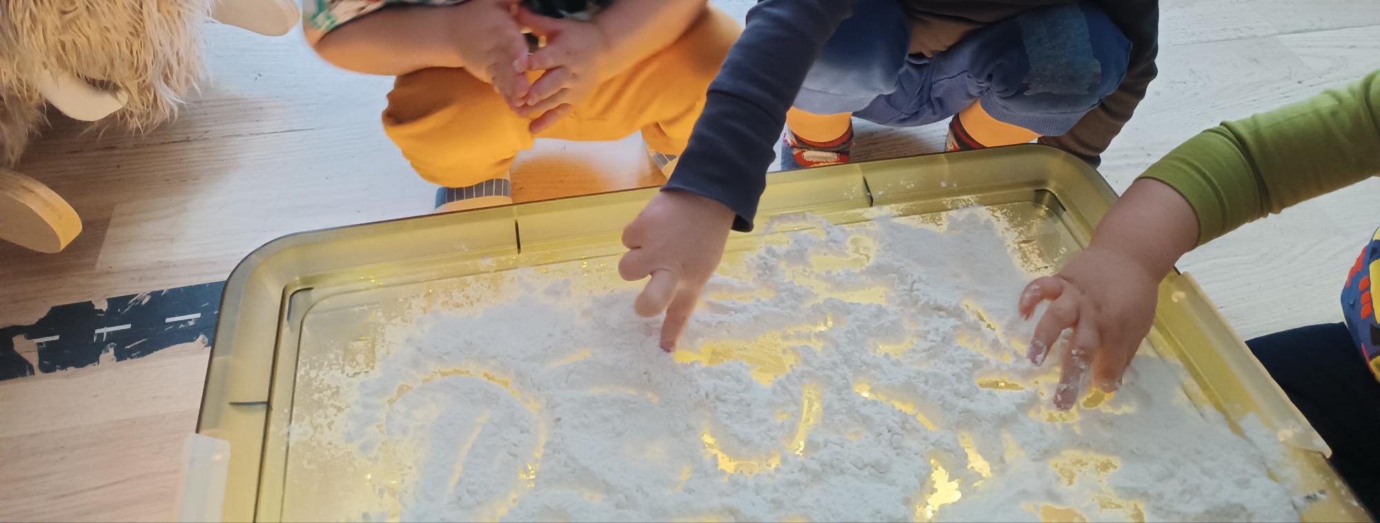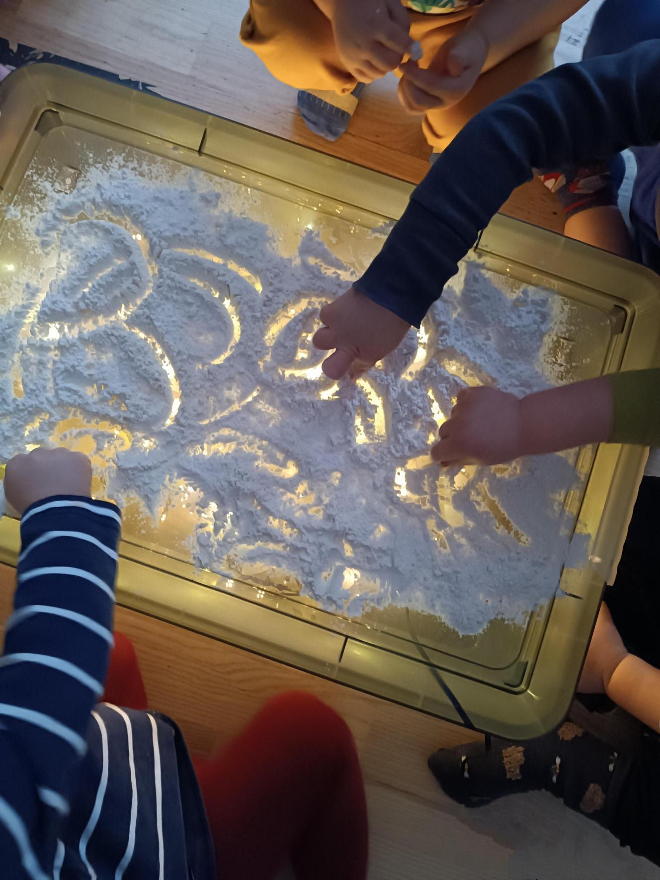 Dzieci miały również okazję do zabawy ze światłem połączonej z rysowaniem po mące. To było bardzo ciekawe doznanie zarówno dla oczu, jak i małych paluszków.