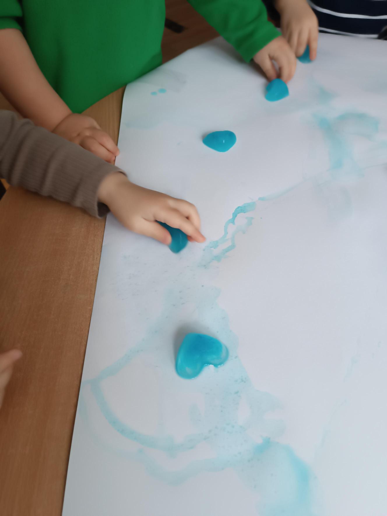 Maluchy miały wiele okazji do doświadczeń sensorycznych, które pozwalały na uwrażliwianie zmysłów. Ćwiczyliśmy rączki malując kolorowymi kostkami lodu. Sprawdzaliśmy, czy lód jest zimny i co się z nim dzieje, gdy dłużej potrzymamy go w dłoniach. Zrobiliśmy też mały eksperyment, sprawdzając, co się stanie z kostką lody, gdy włożymy ją do gorącej wody?