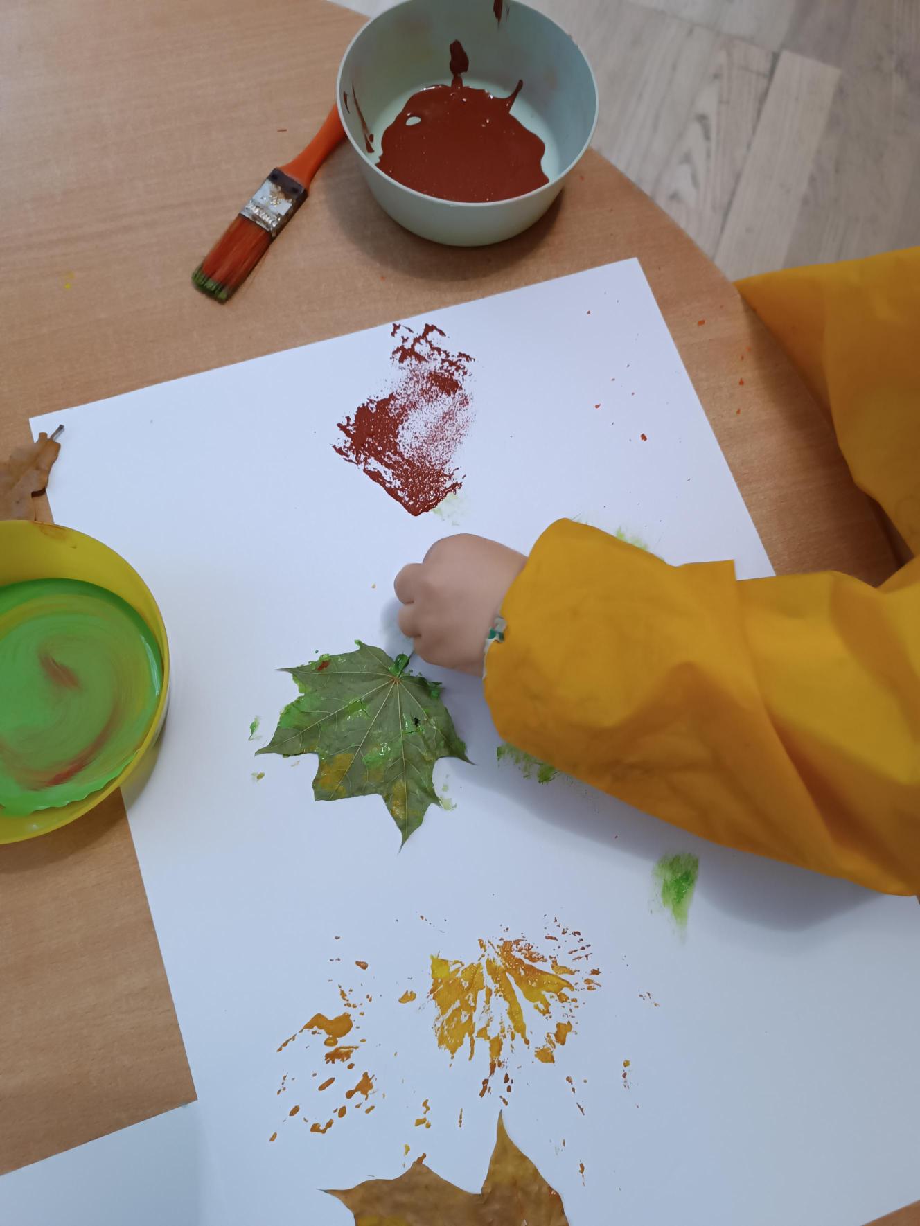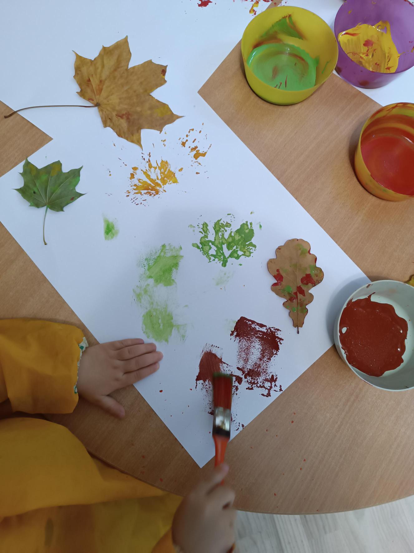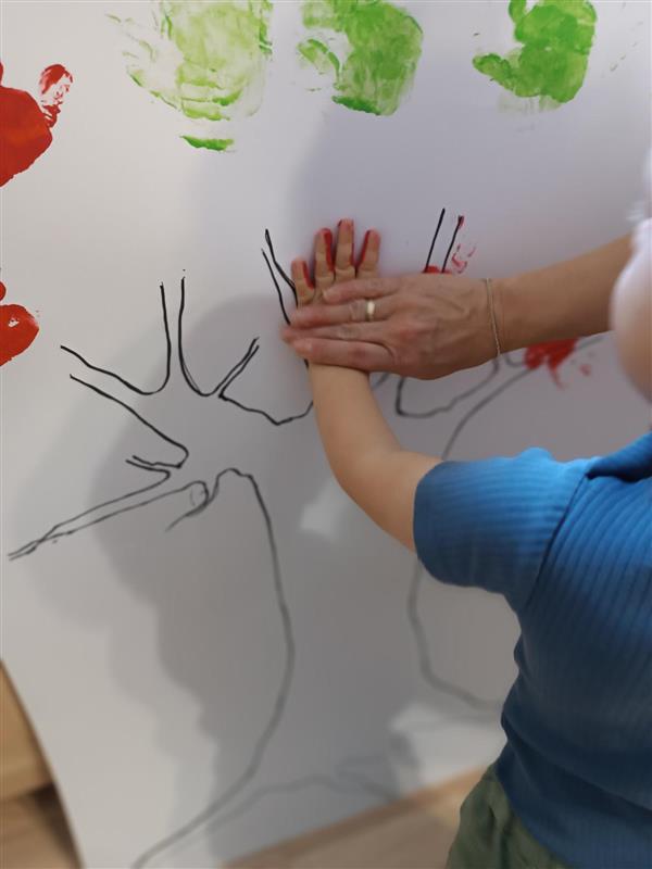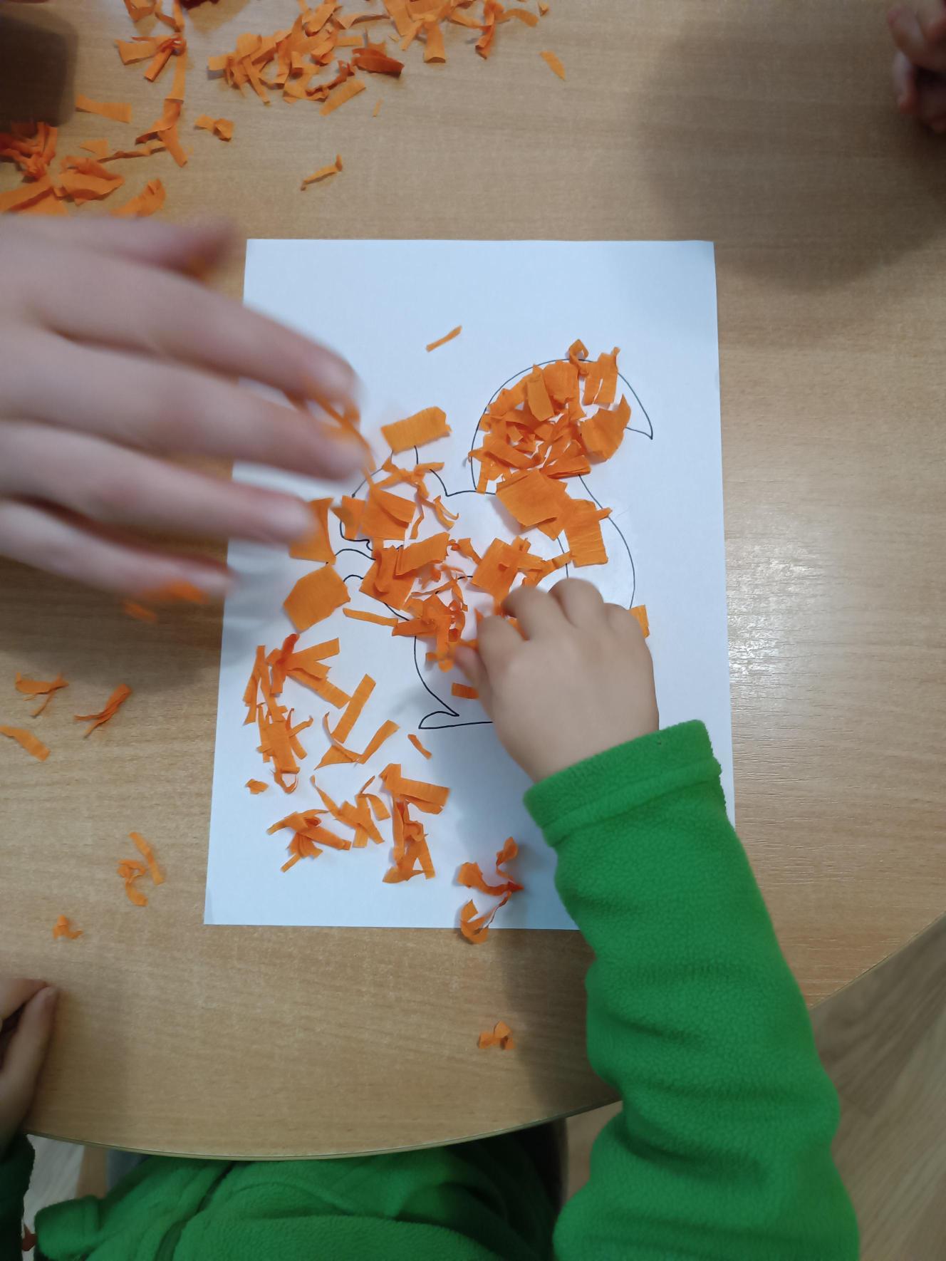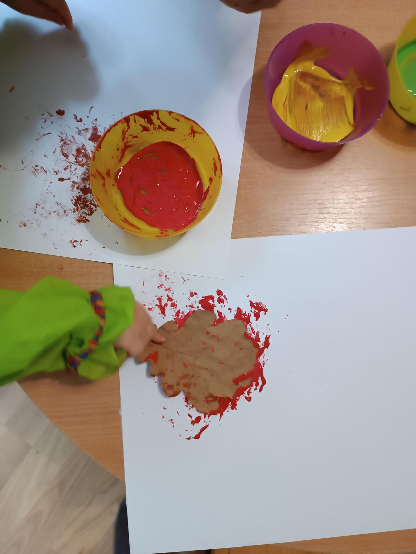 Maluchy czerpały wiele radości z zabaw sensorycznych. Wspólnie namalowaliśmy wielkie, jesienne drzewo odciskając na papierze nasze rączki. Sprawdzaliśmy, jakie kształty pojawią się, gdy odbijemy pomalowane farbą liście. Z krepiny zrobiliśmy futerko wiewiórek. Wyklejaliśmy również kształt dyni i przygotowaliśmy dyniowe dekoracje z okazji święta dyni 🙂