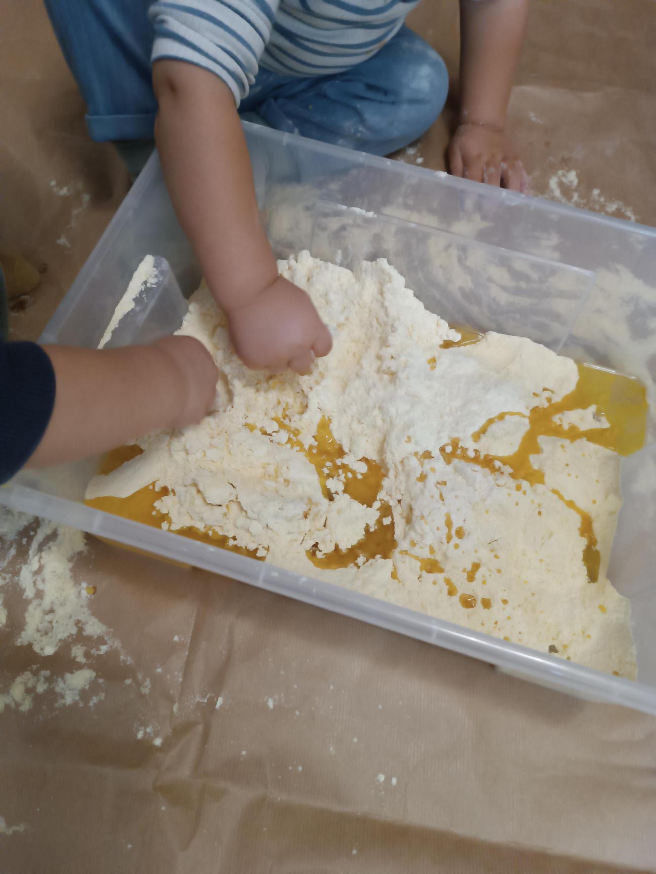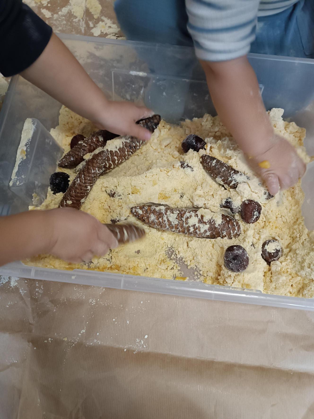 Super zabawą okazało się przygotowanie księżycowego piasku i szukanie w nim ukrytych szyszek i kasztanów. To było bardzo ciekawe doświadczenie sensoryczne.
