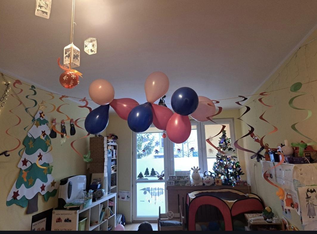 charakteru- zawiesiliśmy kolorowe serpentyny i balony, które wprowadzają dzieci w radosny nastrój i budują atmosferę oczekiwania na zbliżającą się zabawę.
