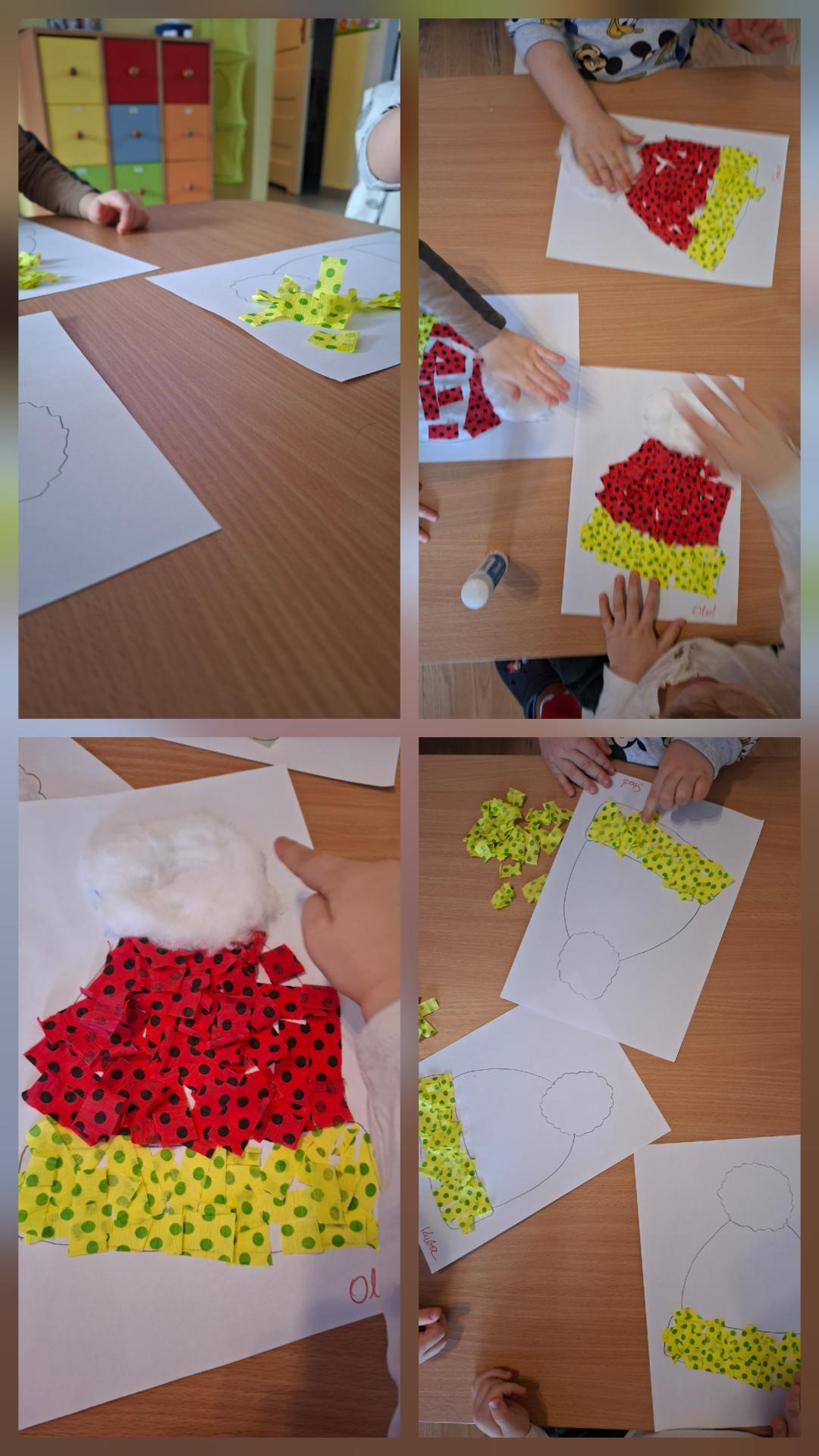 Podczas ostatnich zajęć plastycznych dzieci z dużym zaangażowaniem tworzyły zimowe prace, wyklejając szablony czapek kolorową bibułą i watą. Tego typu ćwiczenia doskonale wspierają rozwój motoryki małej i precyzję małych rączek.