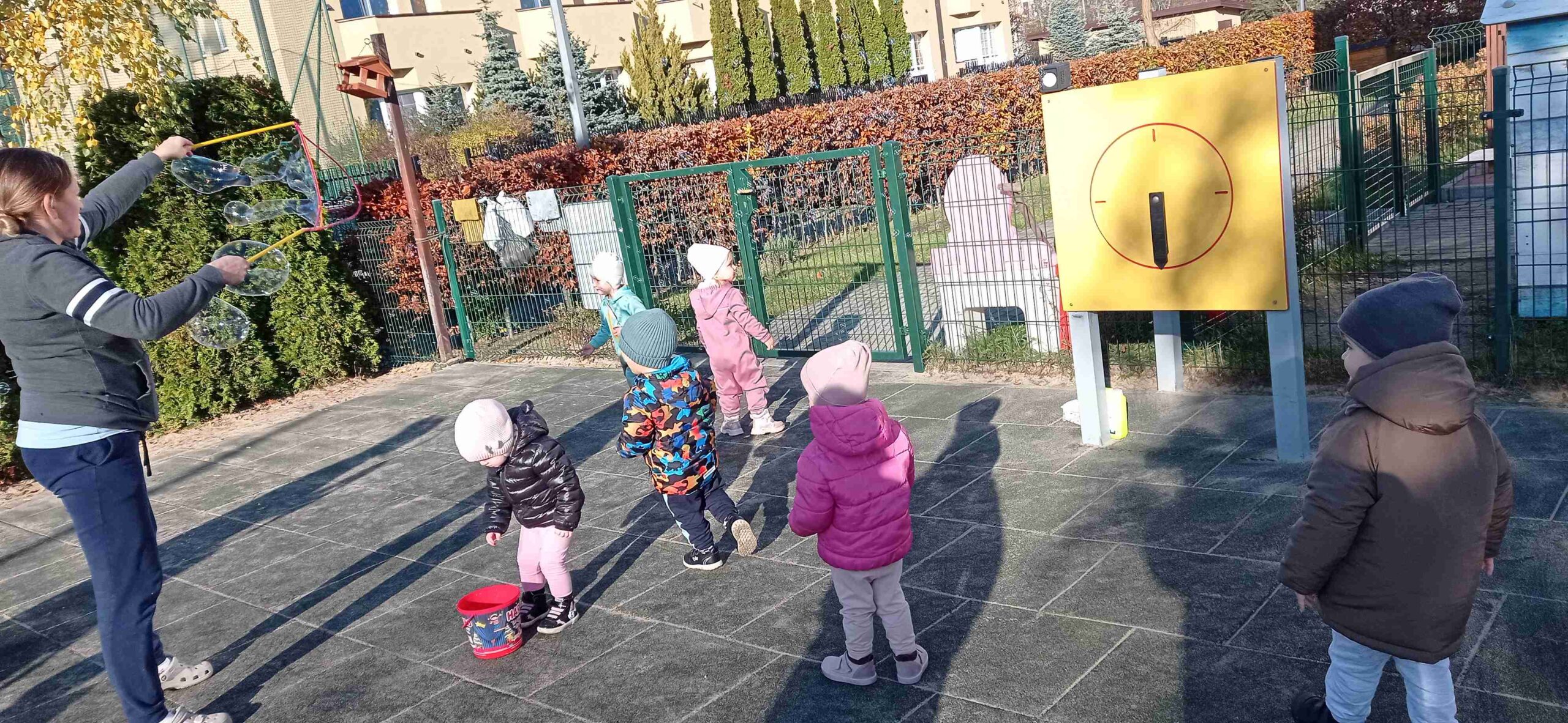 W listopadzie wyjechaliśmy całym Żłobkiem do „Na wieś”, poznawaliśmy pracę rolników i ich sposoby na przygotowanie gospodarstw do nadchodzącej zimy. Korzystaliśmy na placu zabaw ze słonecznych dni, bawiąc się i biegając, opiekunki urozmaicała te wyjścia z wykorzystaniem baniek mydlanych oraz chust animacyjnych.