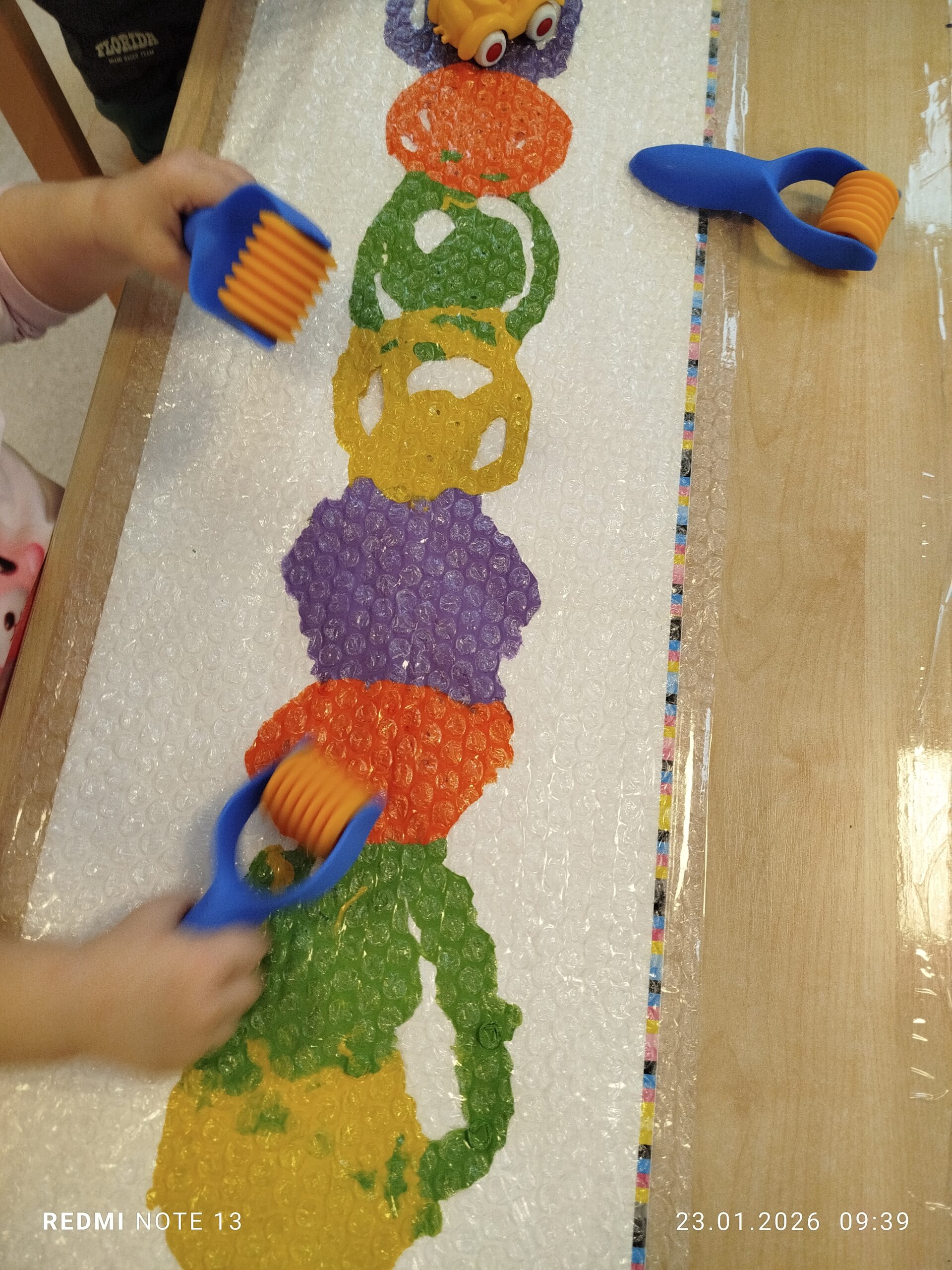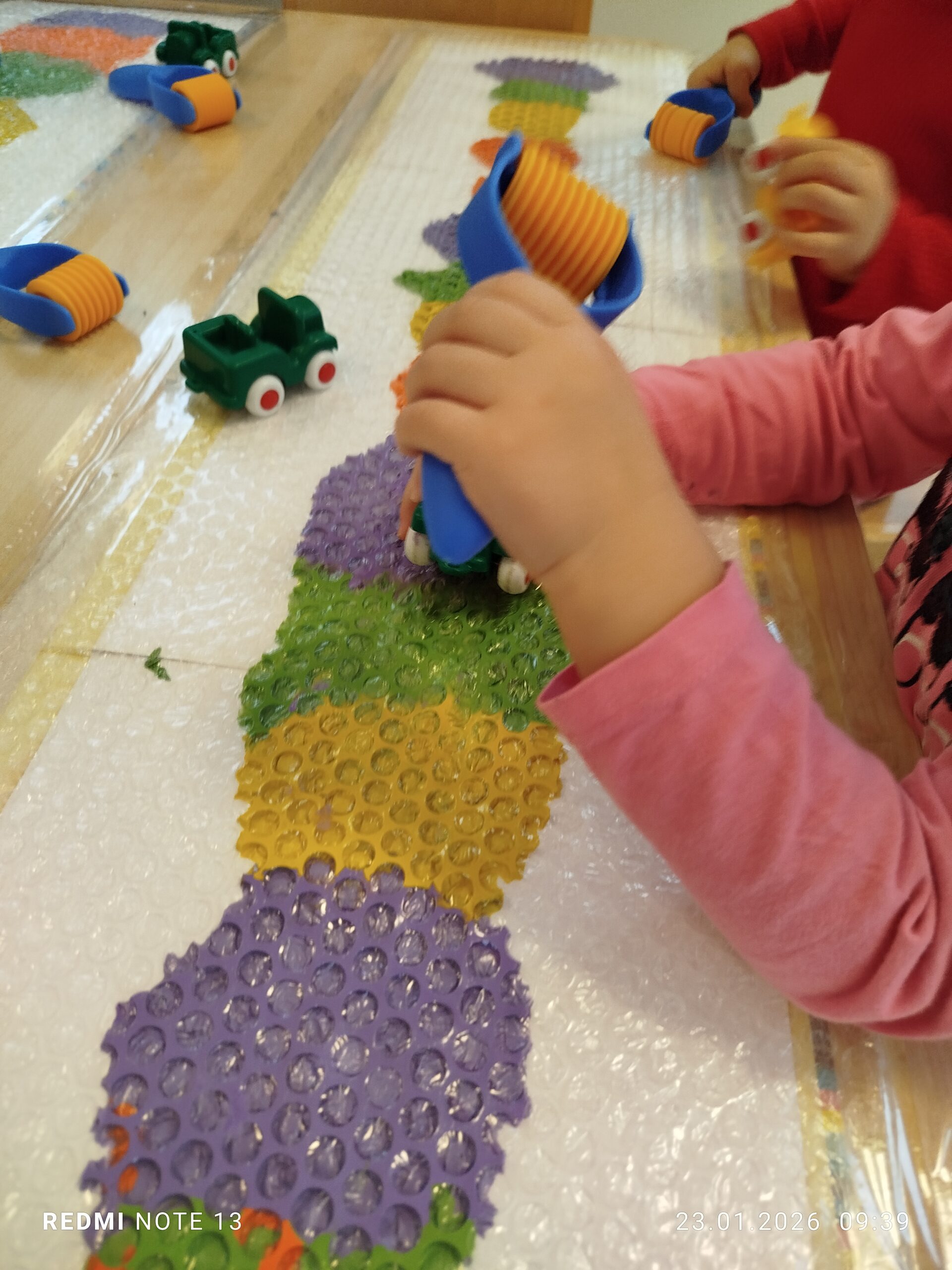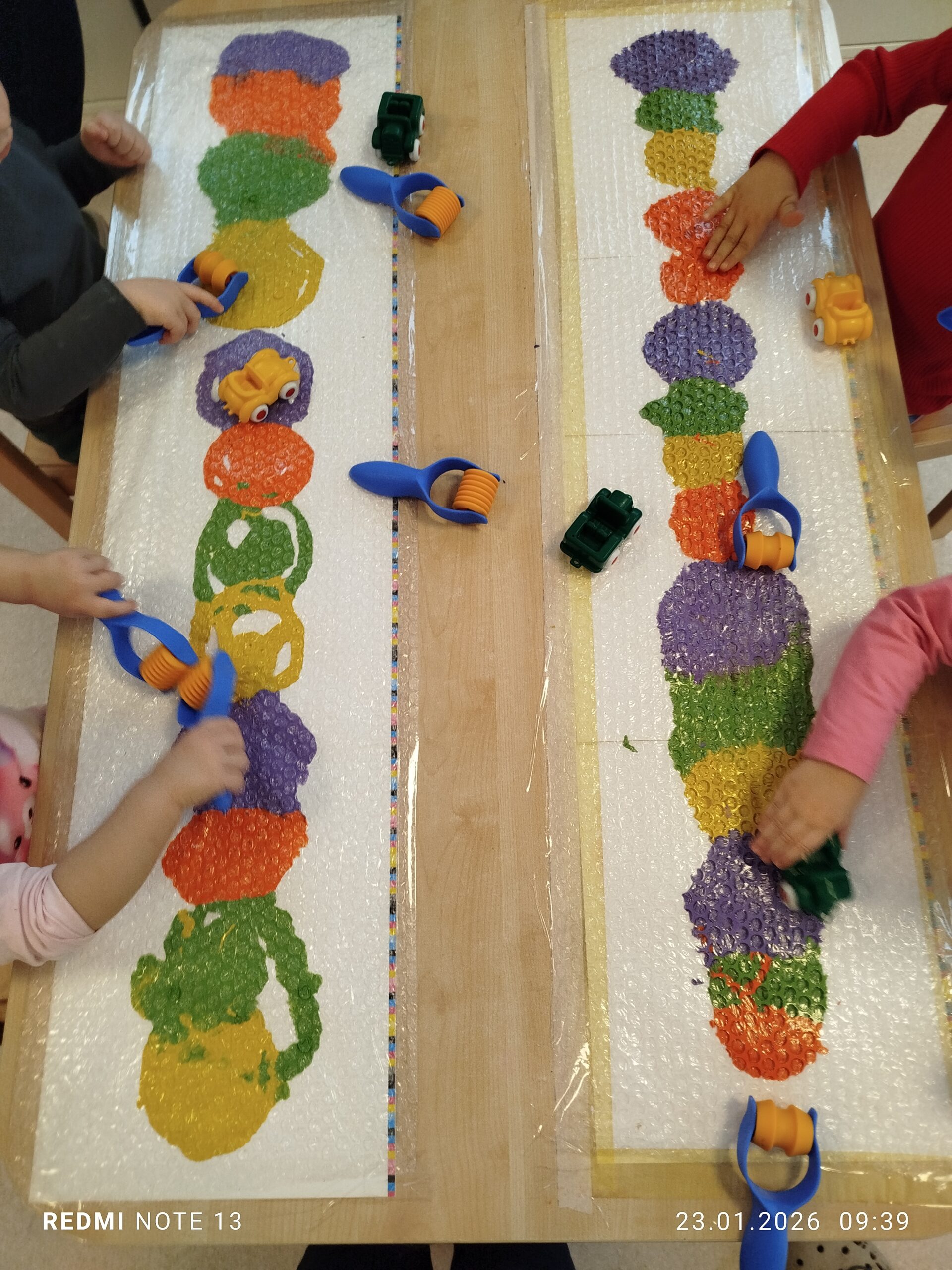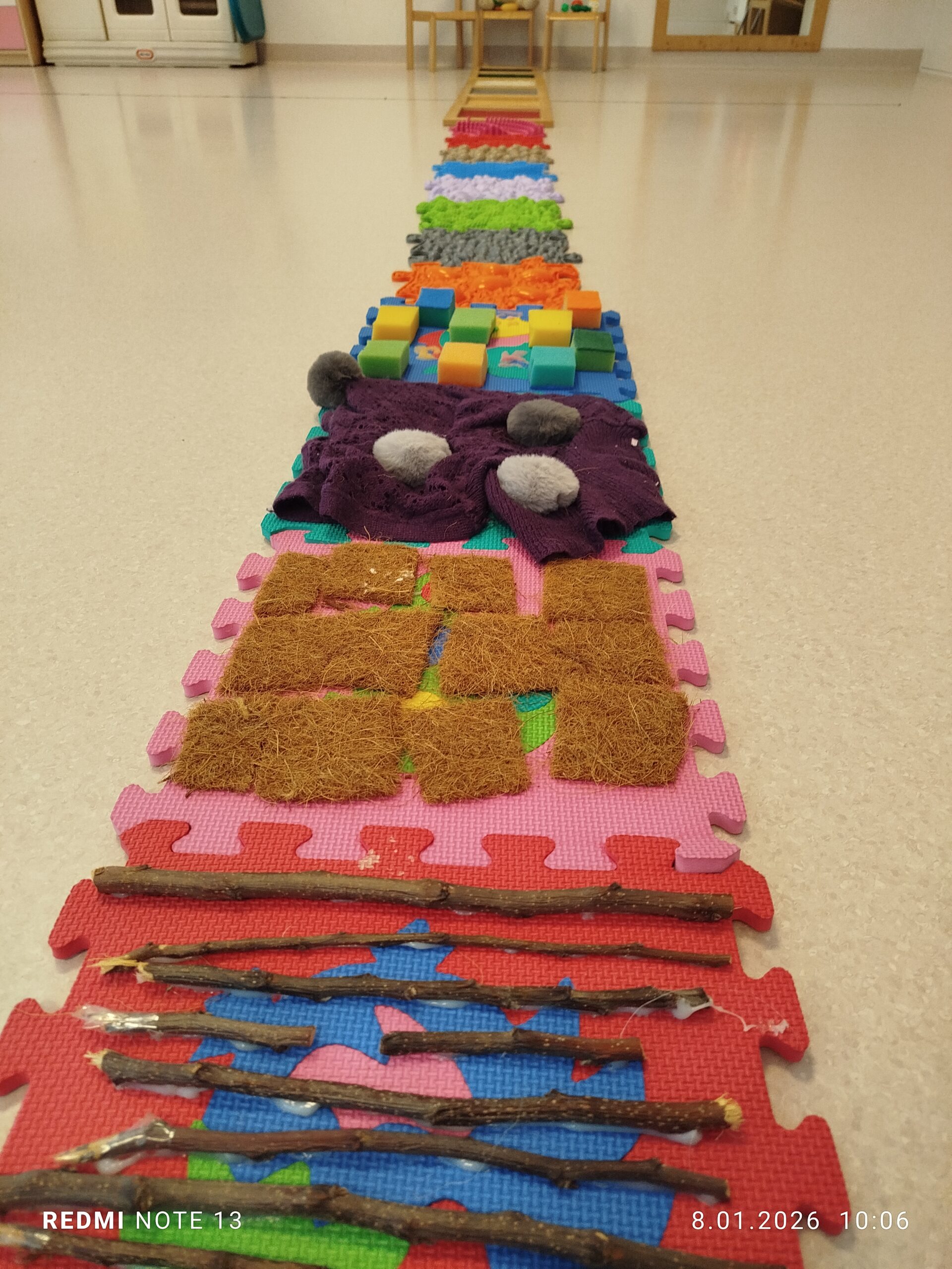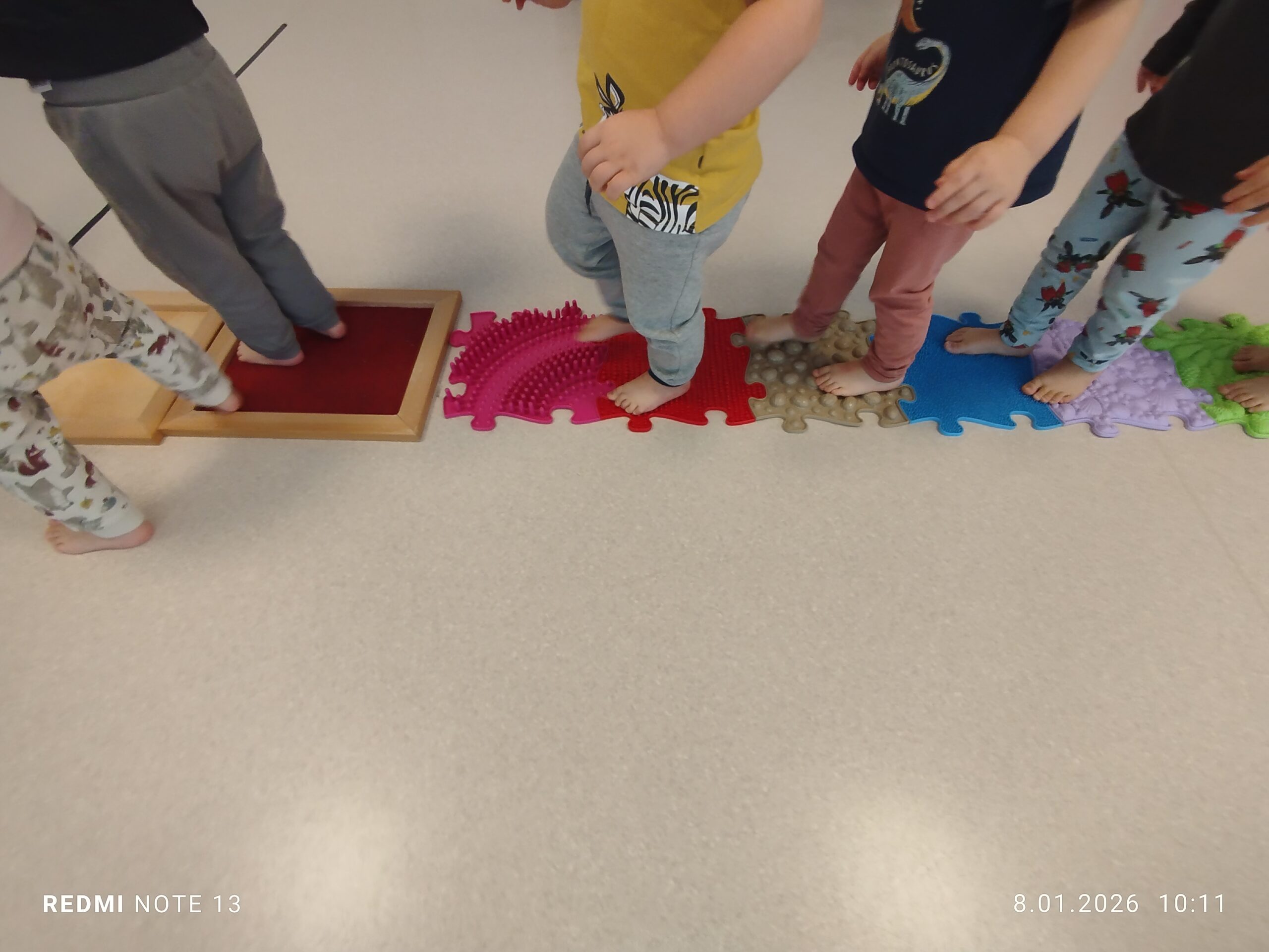 Nie zabrakło także aktywności ruchowych i sensorycznych, wspólnie bawiliśmy się na ścieżce sensorycznej, która dostarczyła dzieciom wielu nowych doświadczeń i wrażeń.