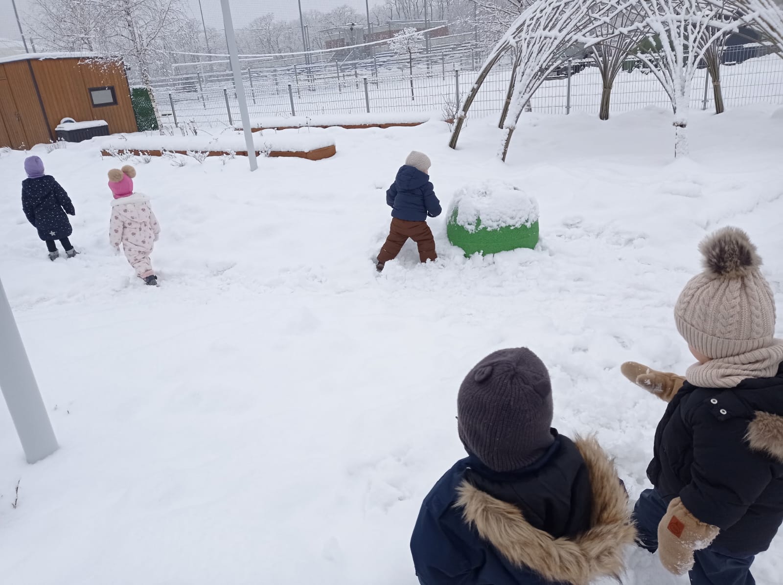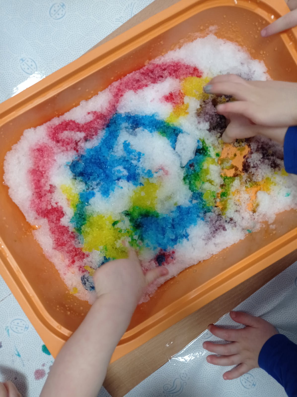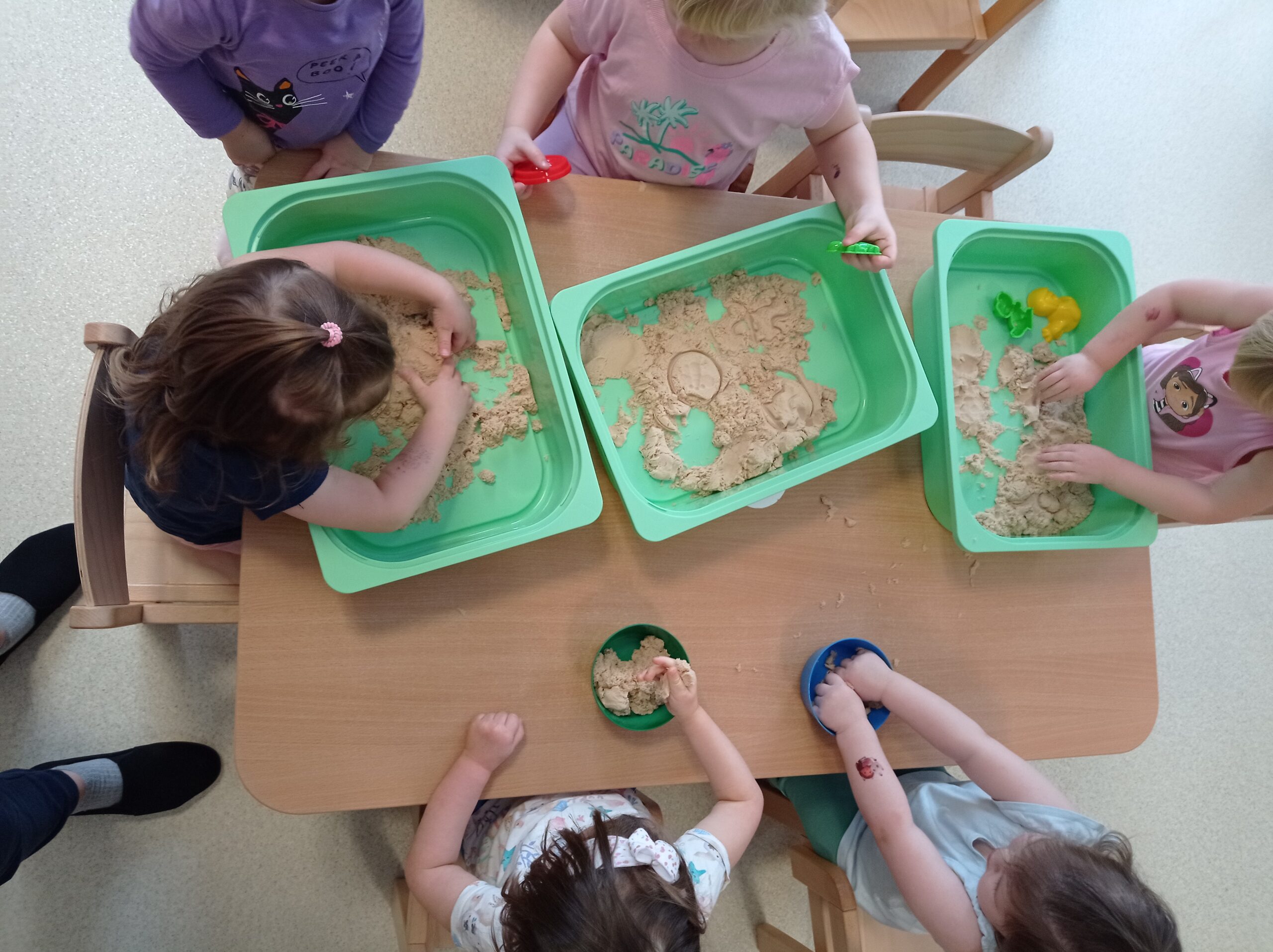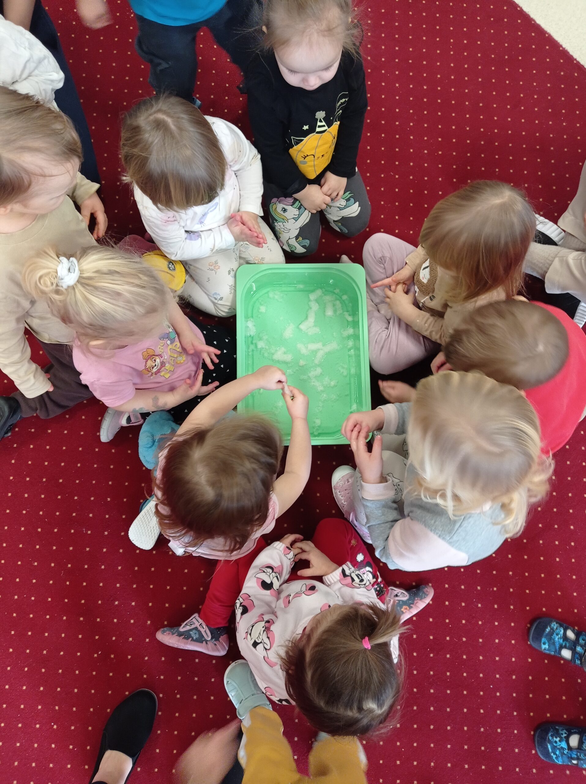 Dzieci radośnie bawiły się na śniegu, ucząc się poprzez zabawę, a także poznawały, jak należy odpowiednio ubierać się zimą. W sali nie zabrakło kreatywnych zajęć — maluchy z zainteresowaniem odkrywały właściwości piasku kinetycznego, rozwijając zmysły i małą motorykę.