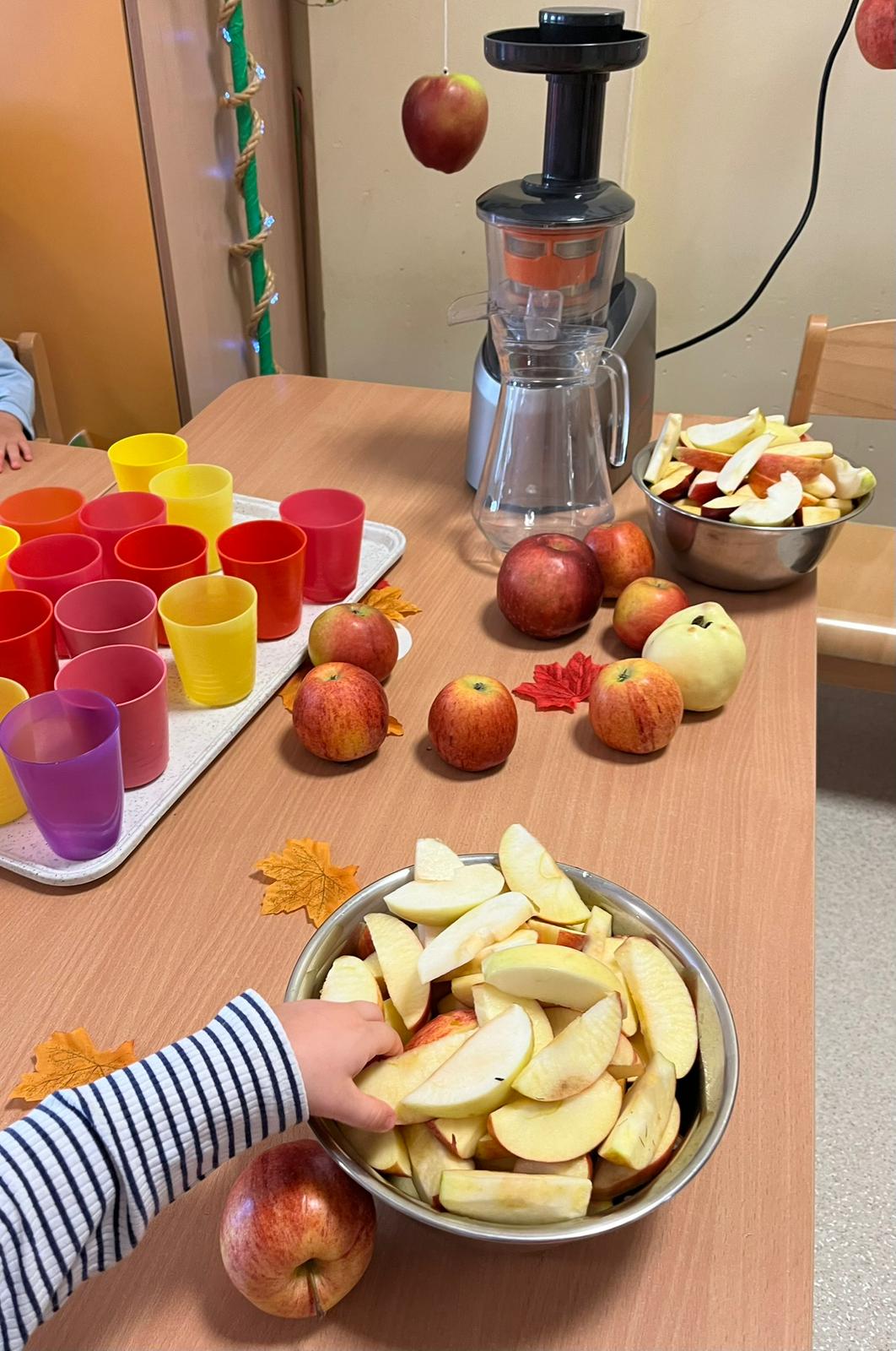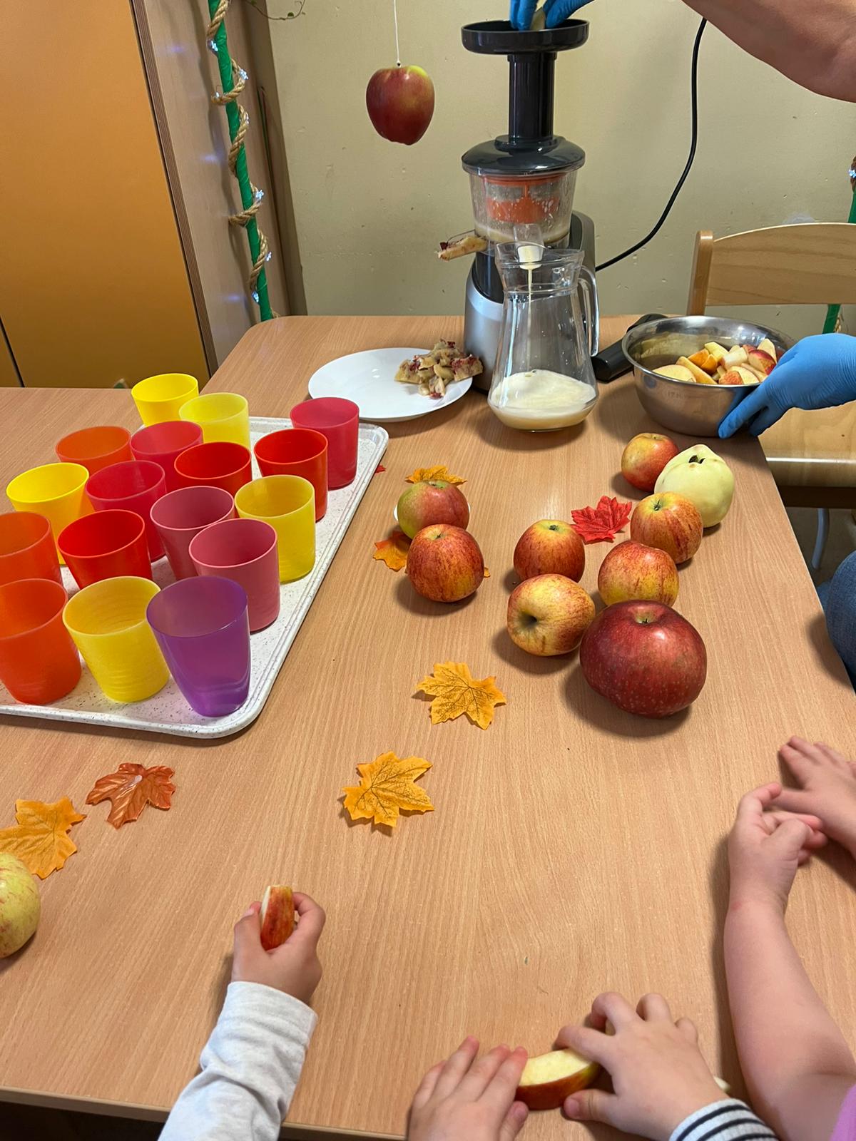 obchodziliśmy Dzień Jabłka – dzieci samodzielnie przygotowywały świeży sok jabłkowy, a także wykonywały jabłkowe prace plastyczno-sensoryczne.