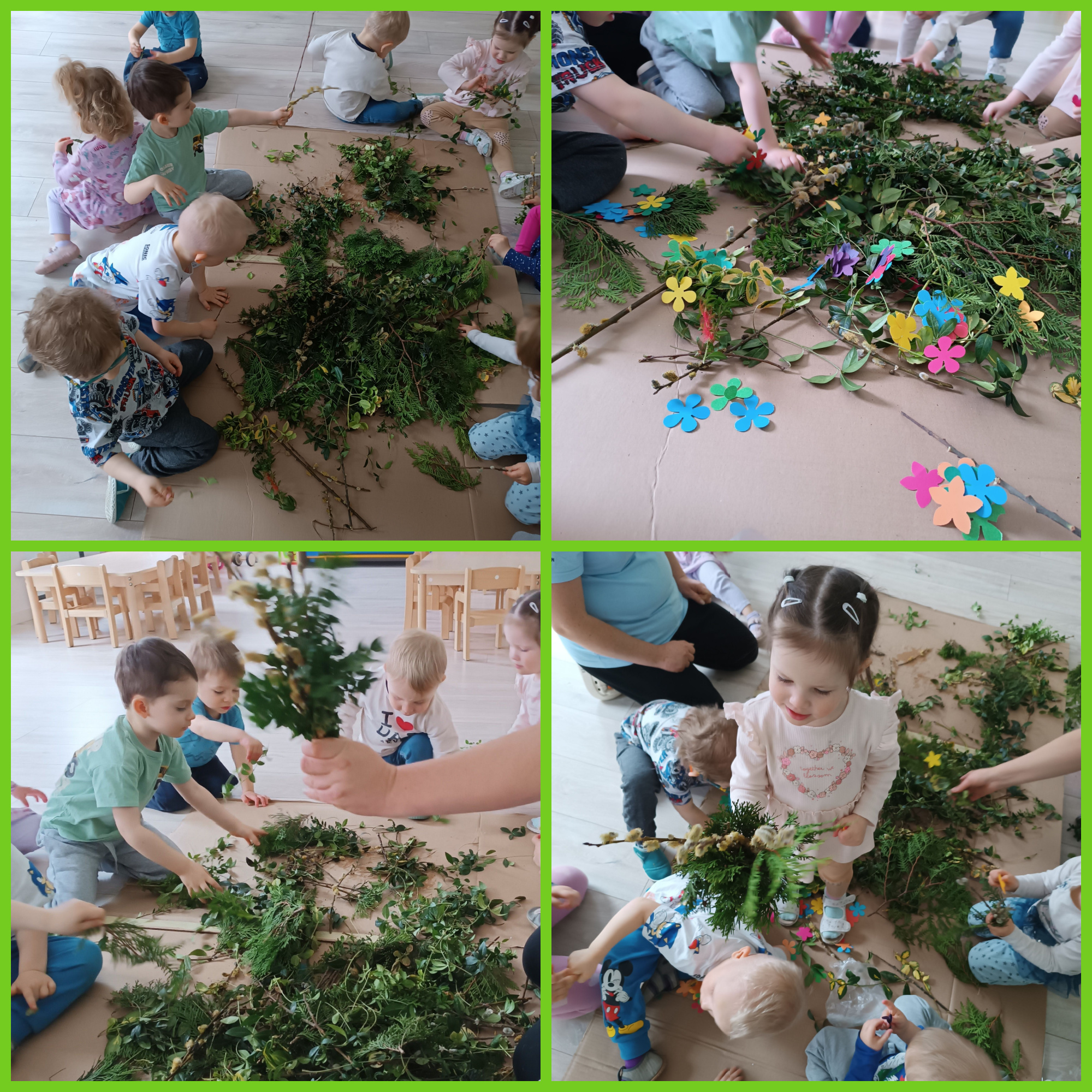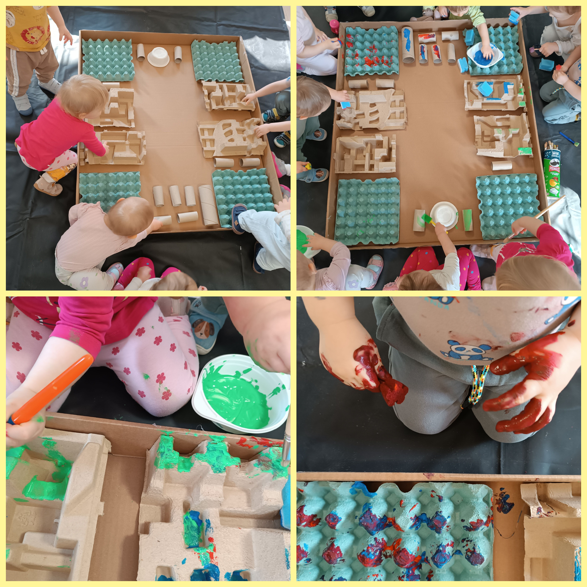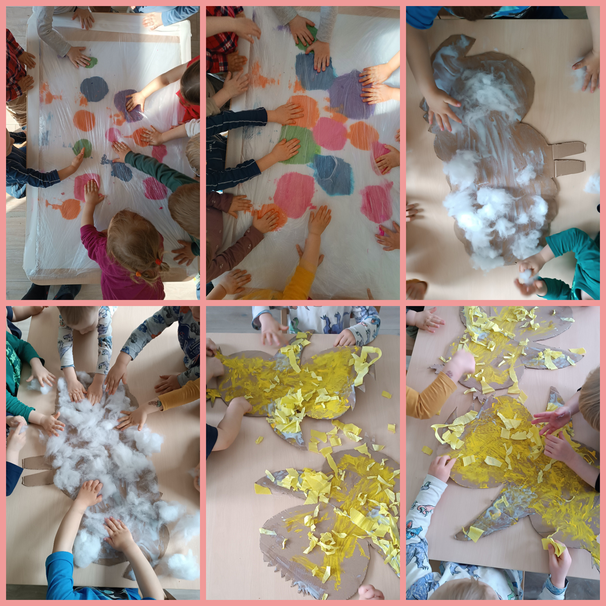 Wraz z pierwszymi oznakami wiosny dzieci aktywnie uczestniczyły w różnorodnych zabawach sensoplastycznych o tematyce wiosennej. Maluchy miały okazję poznawać świat poprzez dotyk, wzrok i kolory, tworząc prace inspirowane budzącą się do życia przyrodą. Wykorzystywaliśmy naturalne materiały, takie jak karton, gałęzie, folia babelkowa czy farby, które pozwalały dzieciom rozwijać kreatywność oraz stymulować zmysły. Zabawy te sprawiały wiele radości, a jednocześnie wspierały rozwój motoryki małej i integracji sensorycznej.