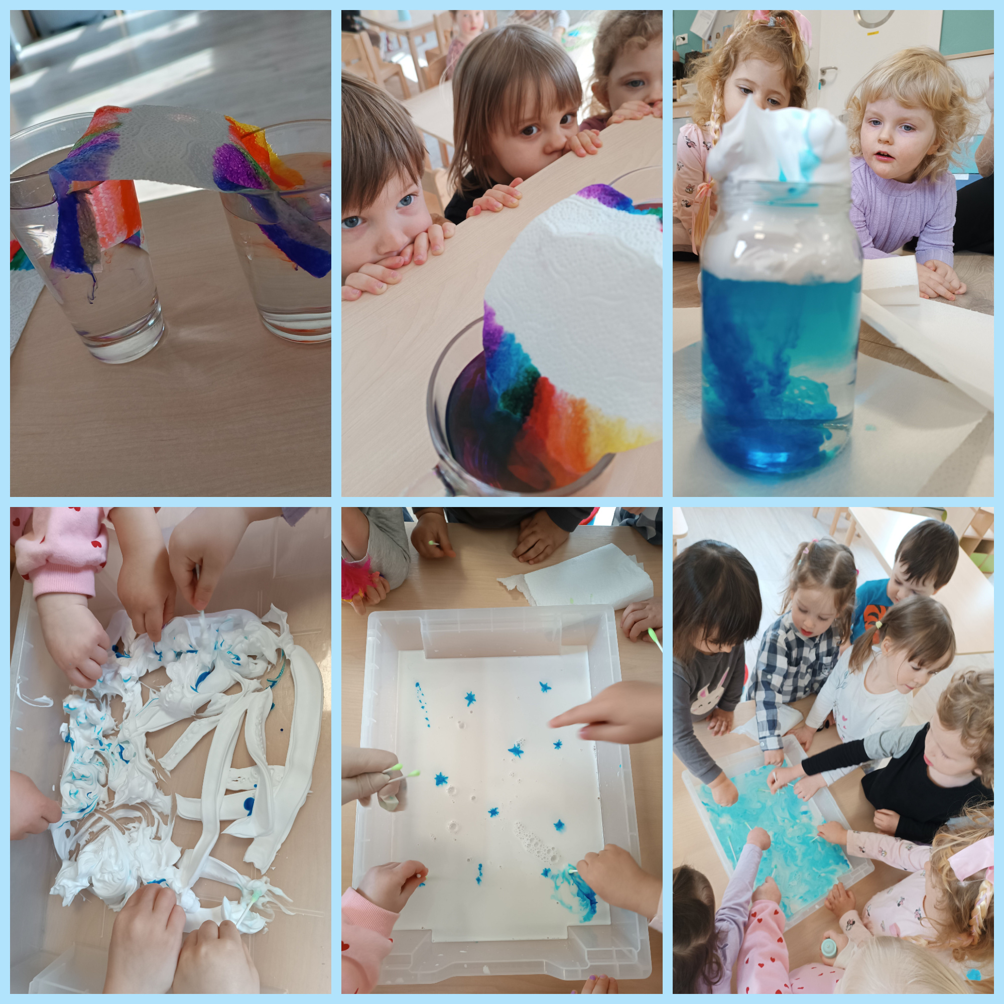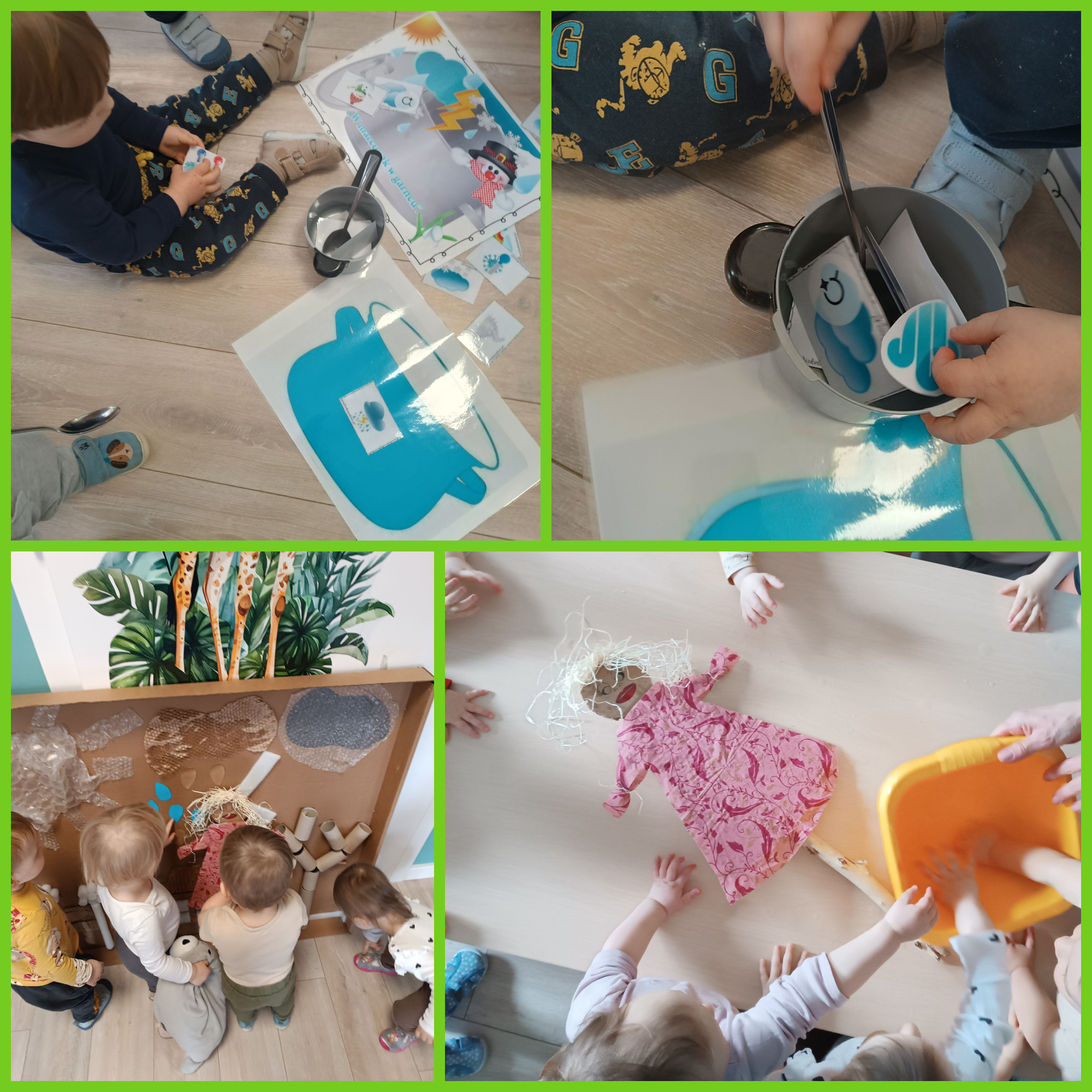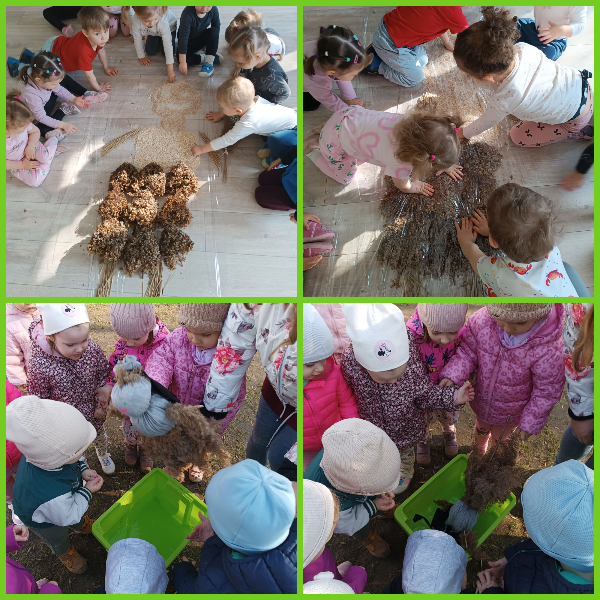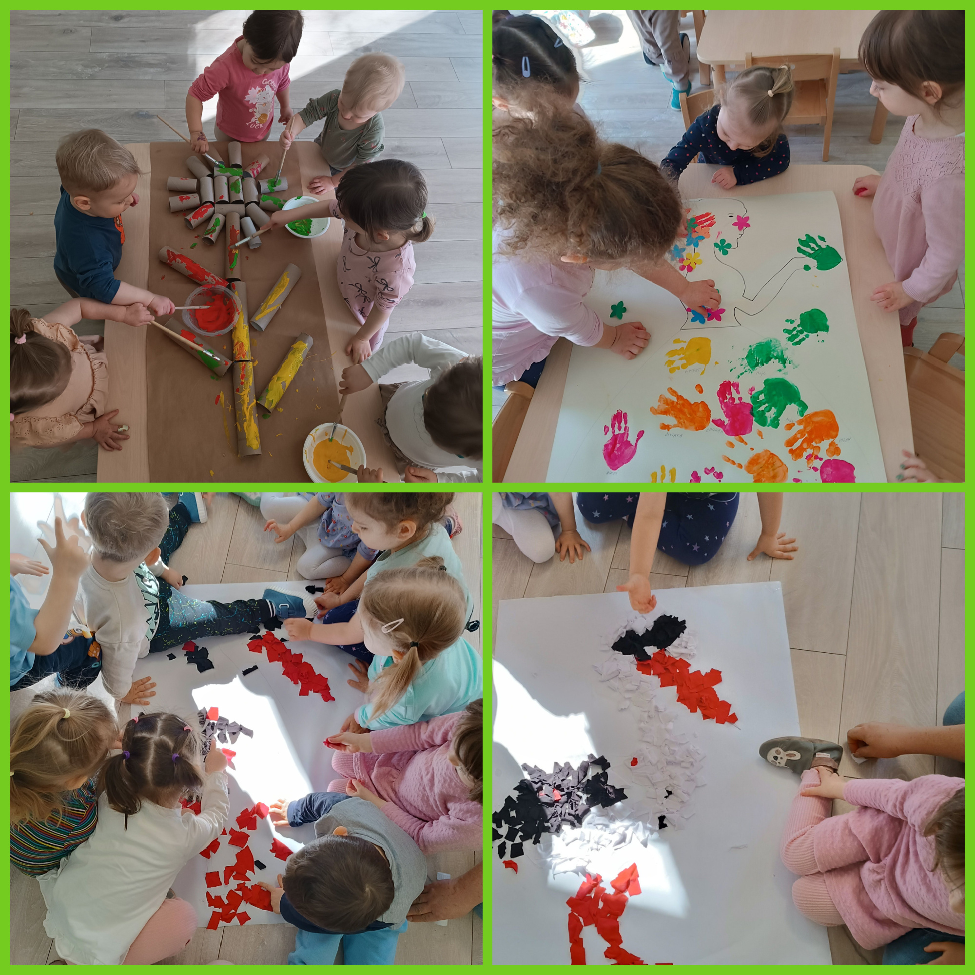 Wraz z pierwszymi oznakami wiosny dzieci aktywnie uczestniczyły w różnorodnych zabawach sensoplastycznych o tematyce wiosennej. Maluchy miały okazję poznawać świat poprzez dotyk, wzrok i kolory, tworząc prace inspirowane budzącą się do życia przyrodą. Wykorzystywaliśmy naturalne materiały, takie jak karton, gałęzie, folia babelkowa czy farby, które pozwalały dzieciom rozwijać kreatywność oraz stymulować zmysły. Zabawy te sprawiały wiele radości, a jednocześnie wspierały rozwój motoryki małej i integracji sensorycznej.