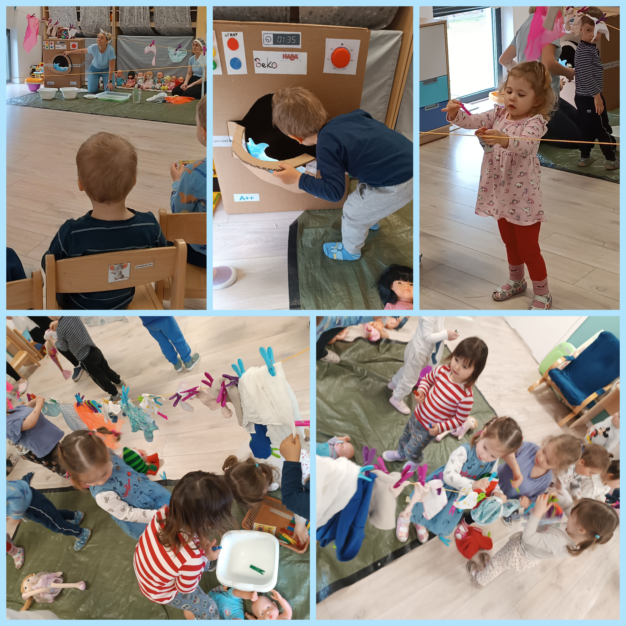 Dużym zainteresowaniem cieszyły się także przygotowane dla dzieci przedstawienia. Jednym z nich był teatrzyk o praczce, który w przystępny i zabawny sposób przybliżył dzieciom temat codziennych obowiązków. Maluchy z zaciekawieniem śledziły losy bohaterki, ucząc się przy tym poprzez obserwację i zabawę.