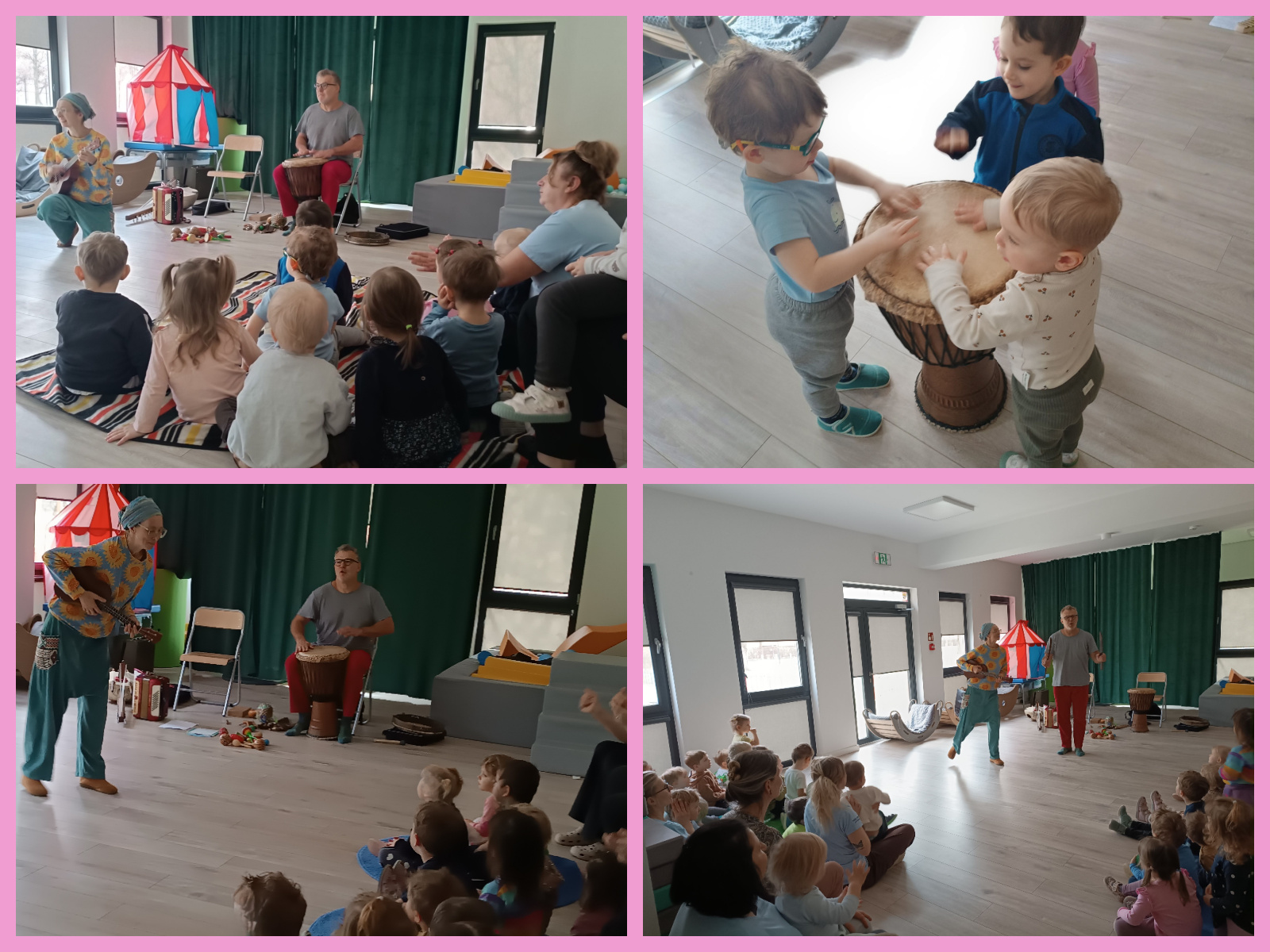 Kolejną atrakcją był teatrzyk muzyczny o wiejskich zwierzątkach budzących się na wiosnę. Dzieci miały okazję poznać odgłosy zwierząt, uczestniczyć w zabawach rytmicznych oraz wspólnie śpiewać. Interaktywna forma przedstawienia zachęcała dzieci do aktywnego udziału, co dostarczyło im wiele radości i pozytywnych emocji.