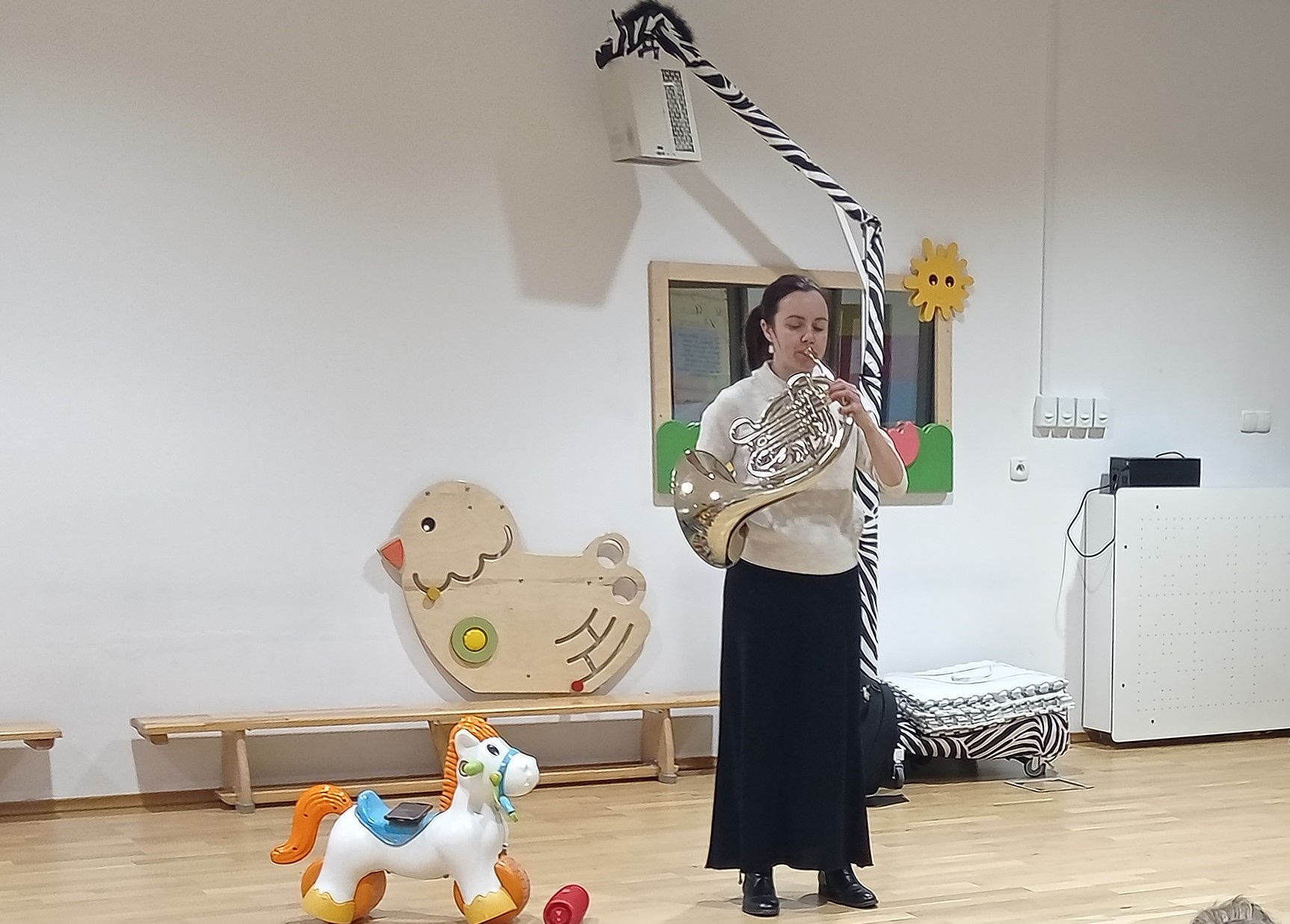 Nie zabrakło także muzycznych wrażeń 🎶 – maluchy uczestniczyły w koncertach instrumentów, poznając m.in. dźwięki fagotu i waltorni 🎵🥁.