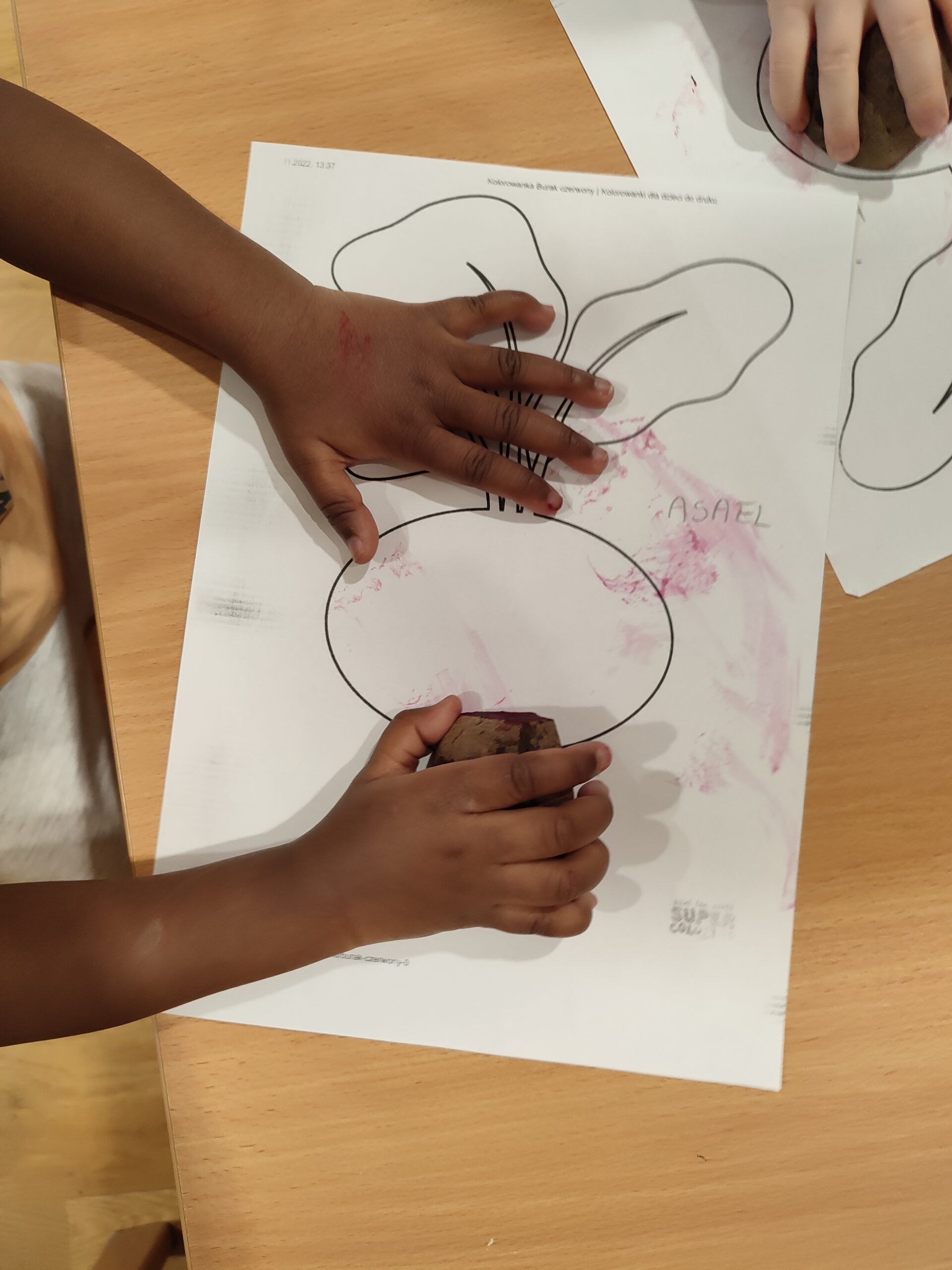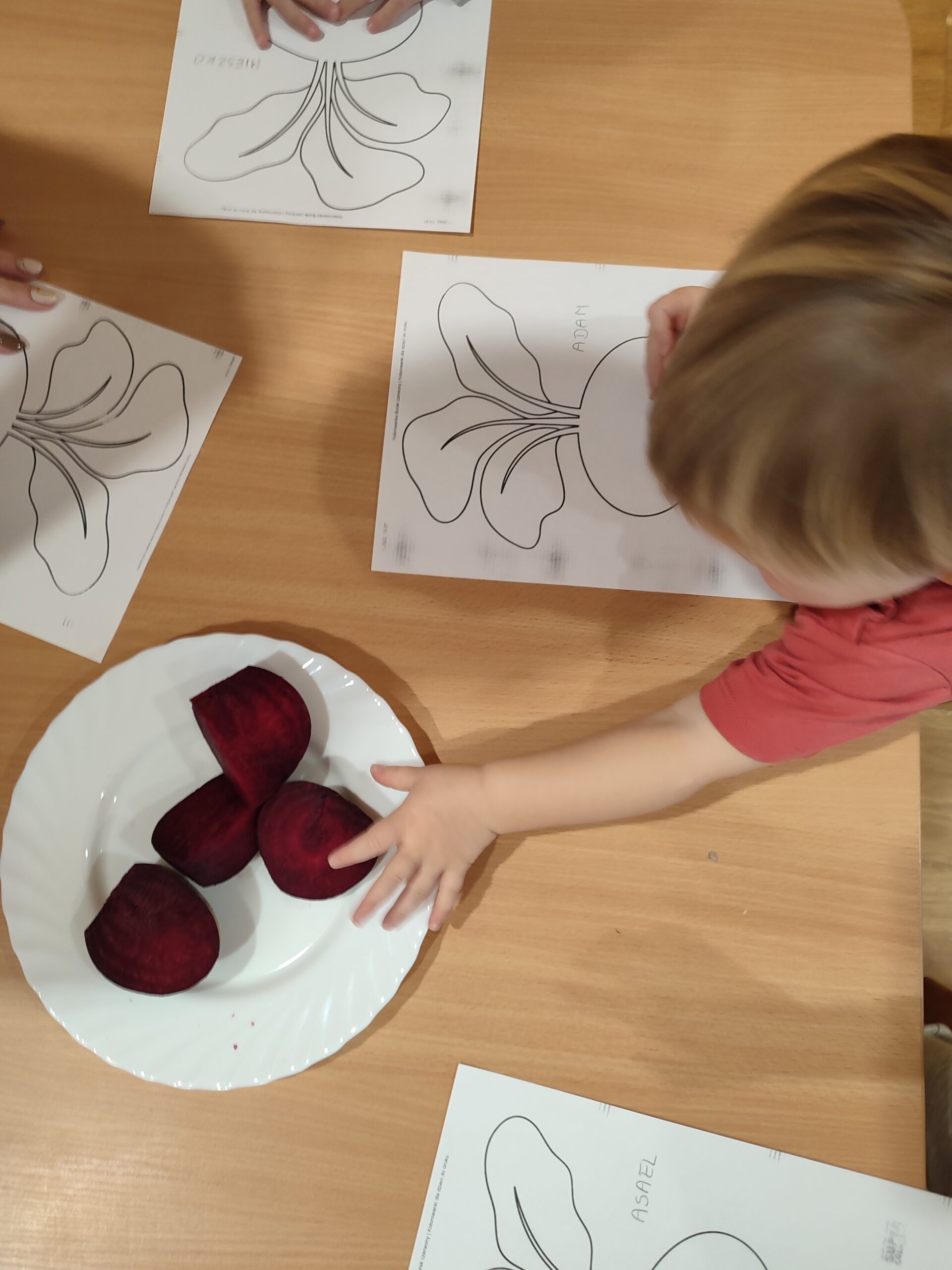 Nie zabrakło również smakowitych i sensorycznych doświadczeń podczas Dnia Buraka . Dzieci poznawały buraka poprzez zabawy tematyczne, oglądanie, dotykanie oraz działania plastyczne, rozwijając ciekawość świata i zmysły.