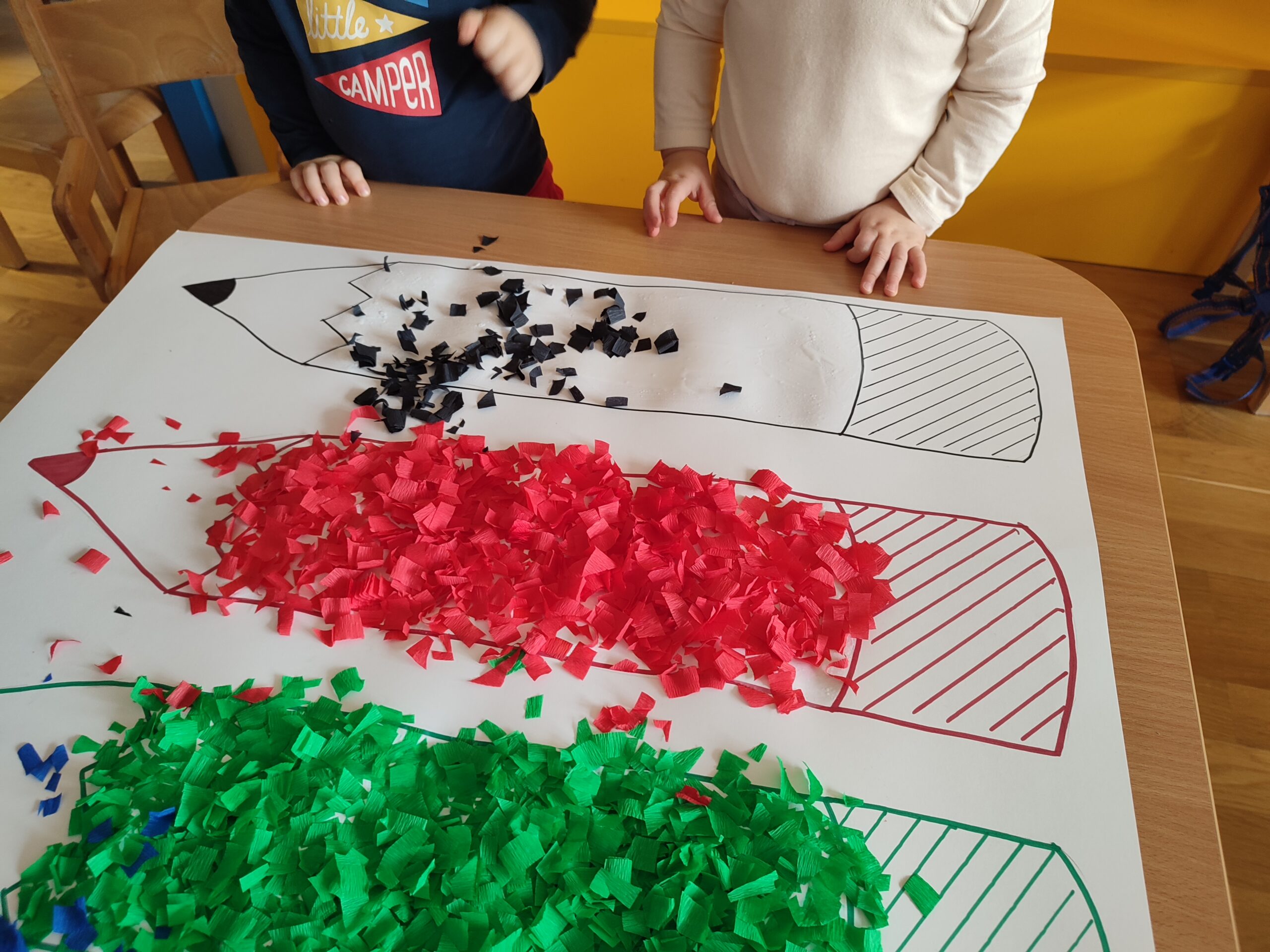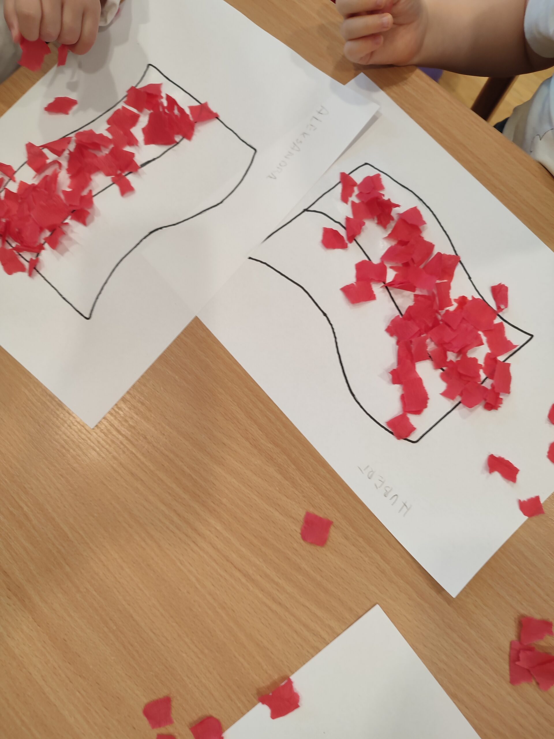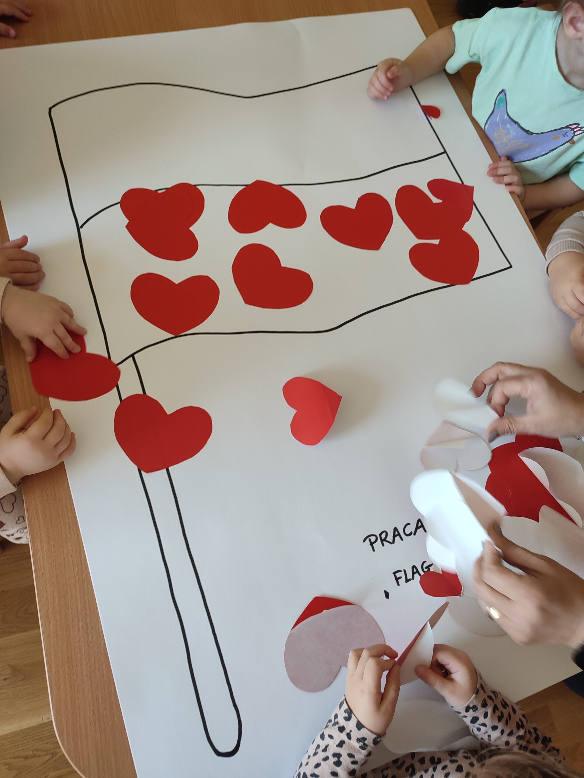 W listopadzie rozmawialiśmy także o barwach Polski – bieli i czerwieni 🇵🇱. Dzieci wykonywały własne flagi w formie prac plastycznych 🎨