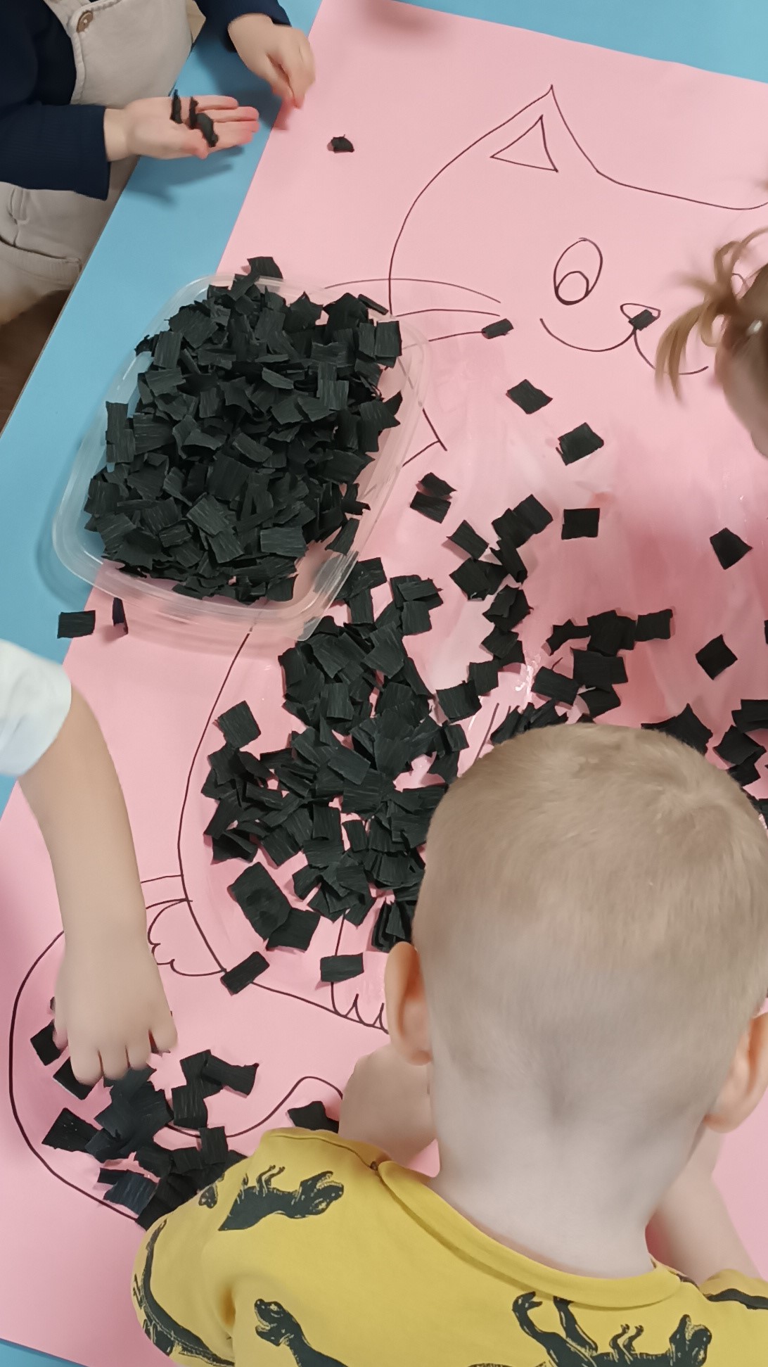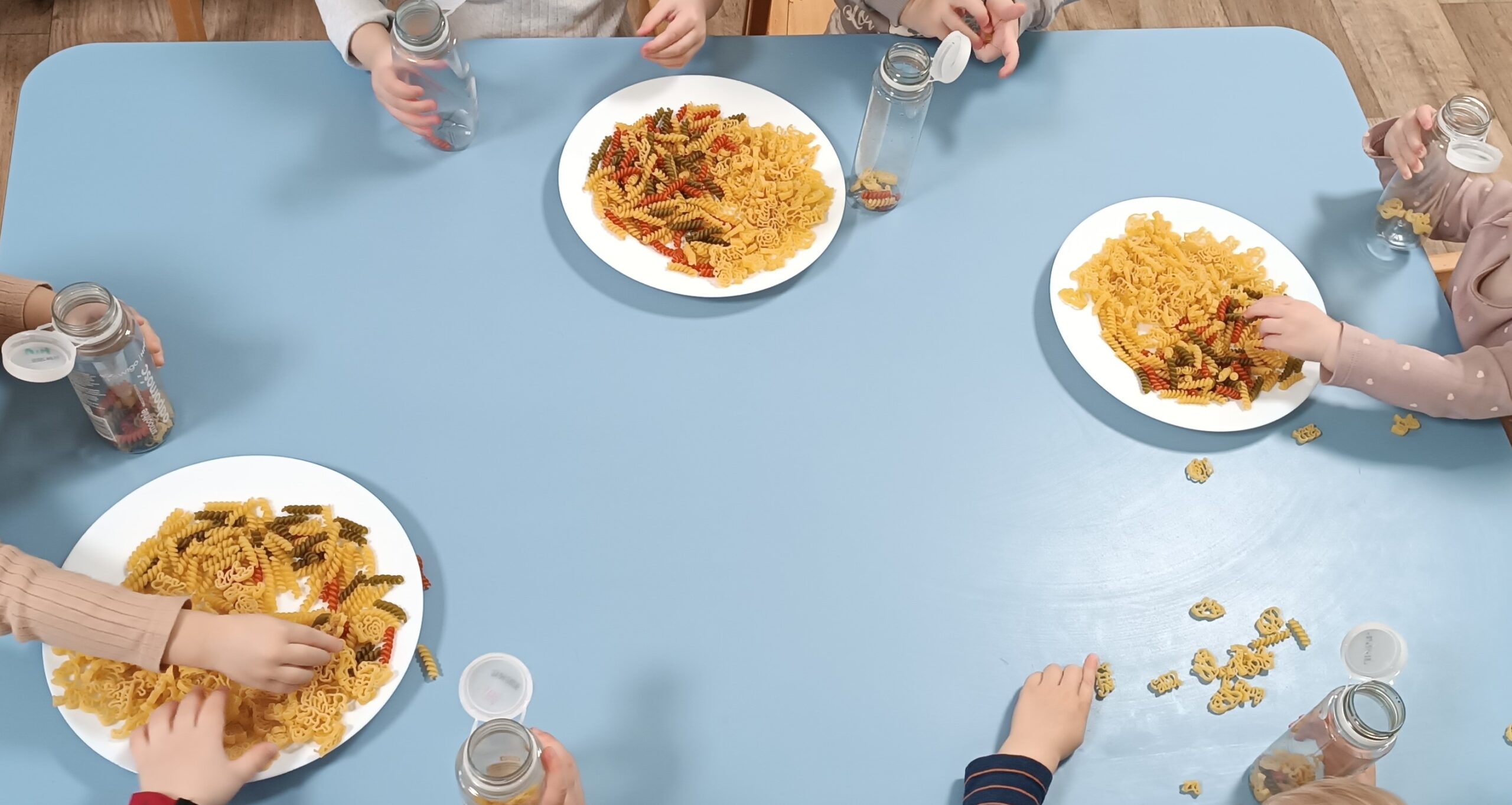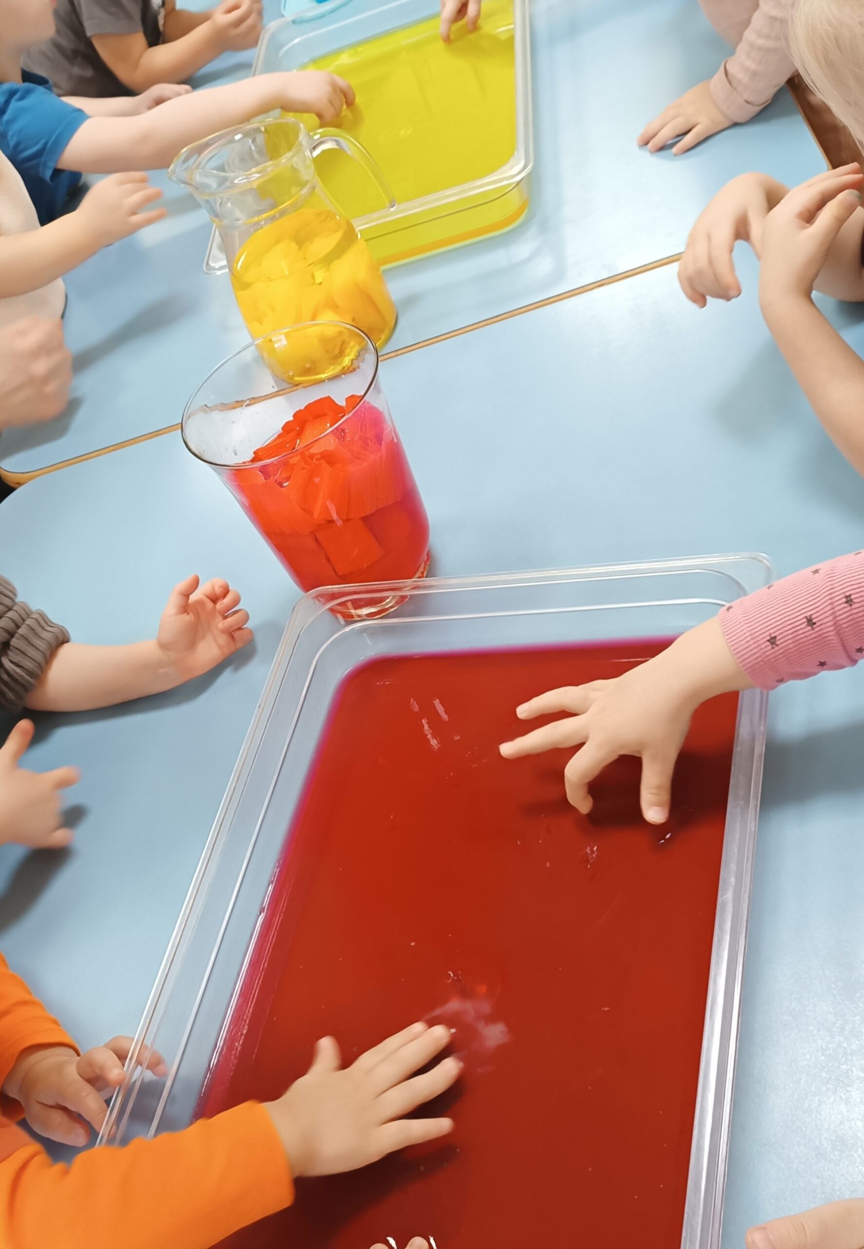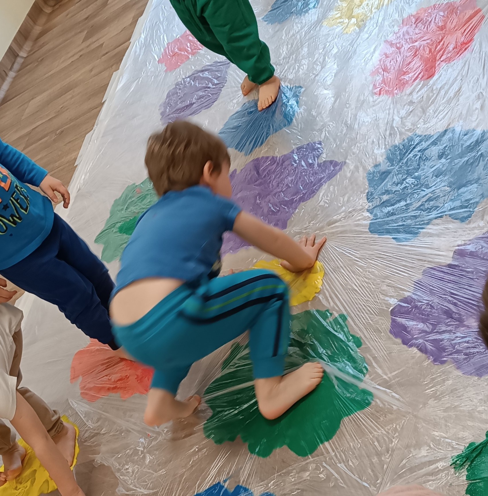 Dużo radości przyniosły także zabawy sensoryczno-ruchowe 🎨 z wykorzystaniem galaretek, makaronu i farb, które rozwijały zmysły, kreatywność oraz sprawność ruchową dzieci.