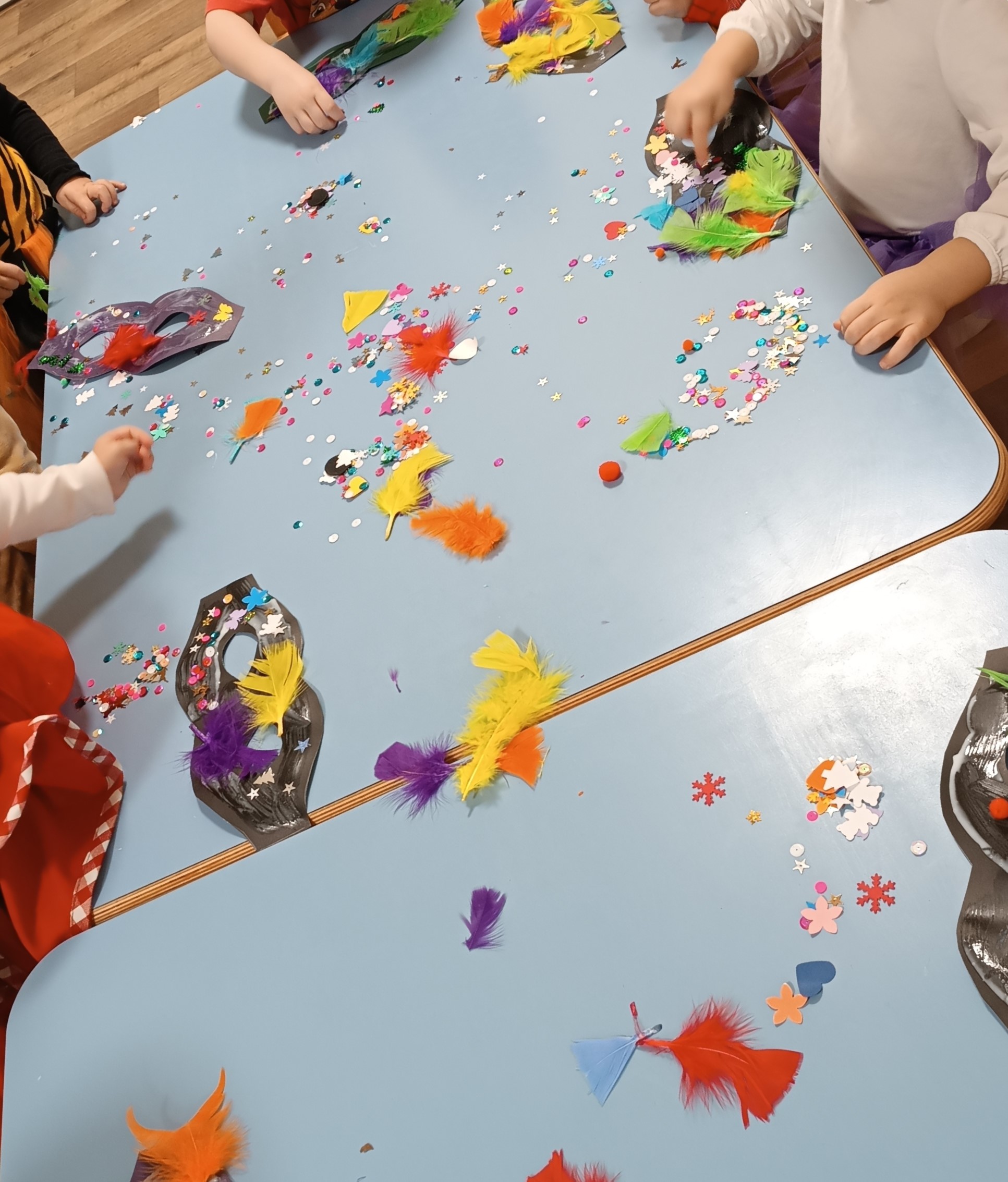 Nie zabrakło również wspaniałego Balu Karnawałowego 🎭 – dzieci przyszły w kolorowych strojach, tańczyły i brały udział w zabawach muzycznych, a wcześniej z radością przygotowywały własne maski karnawałowe ✂️🎨.