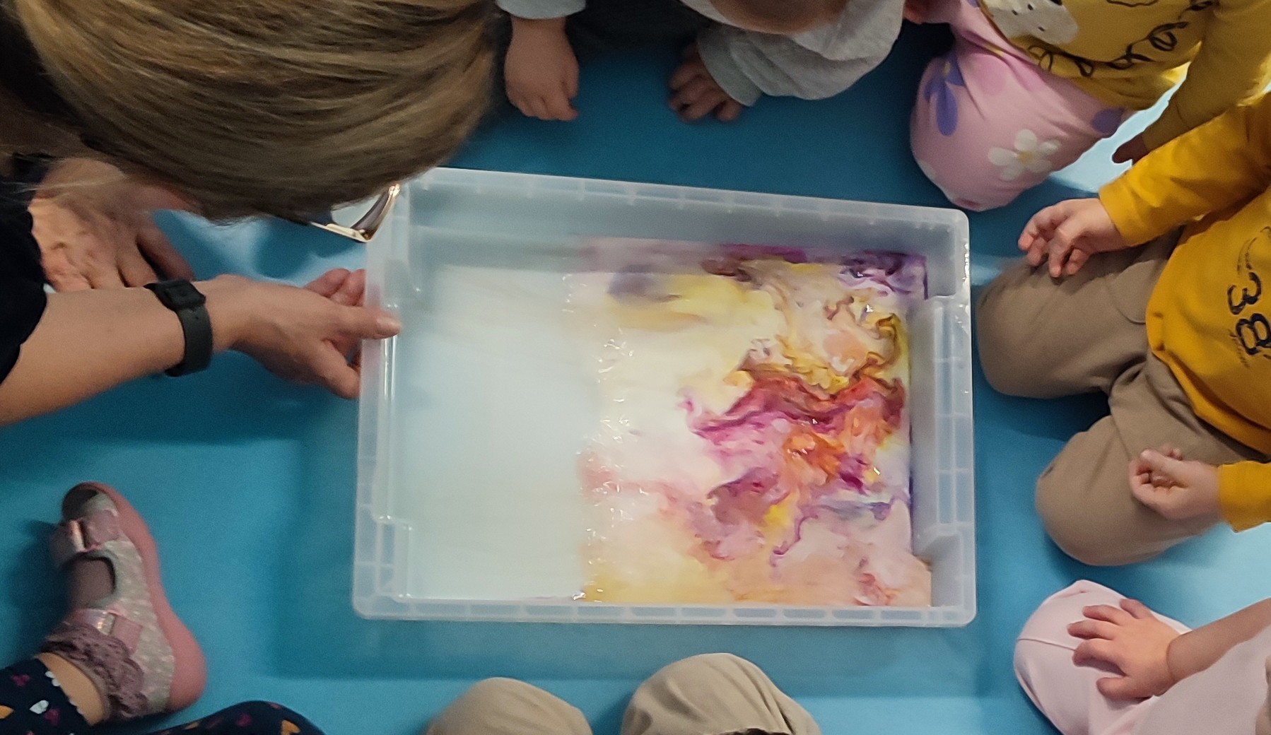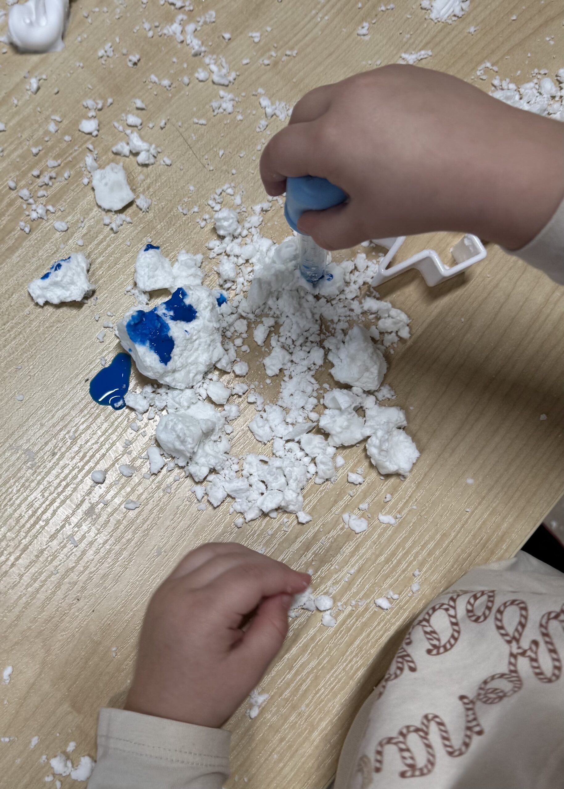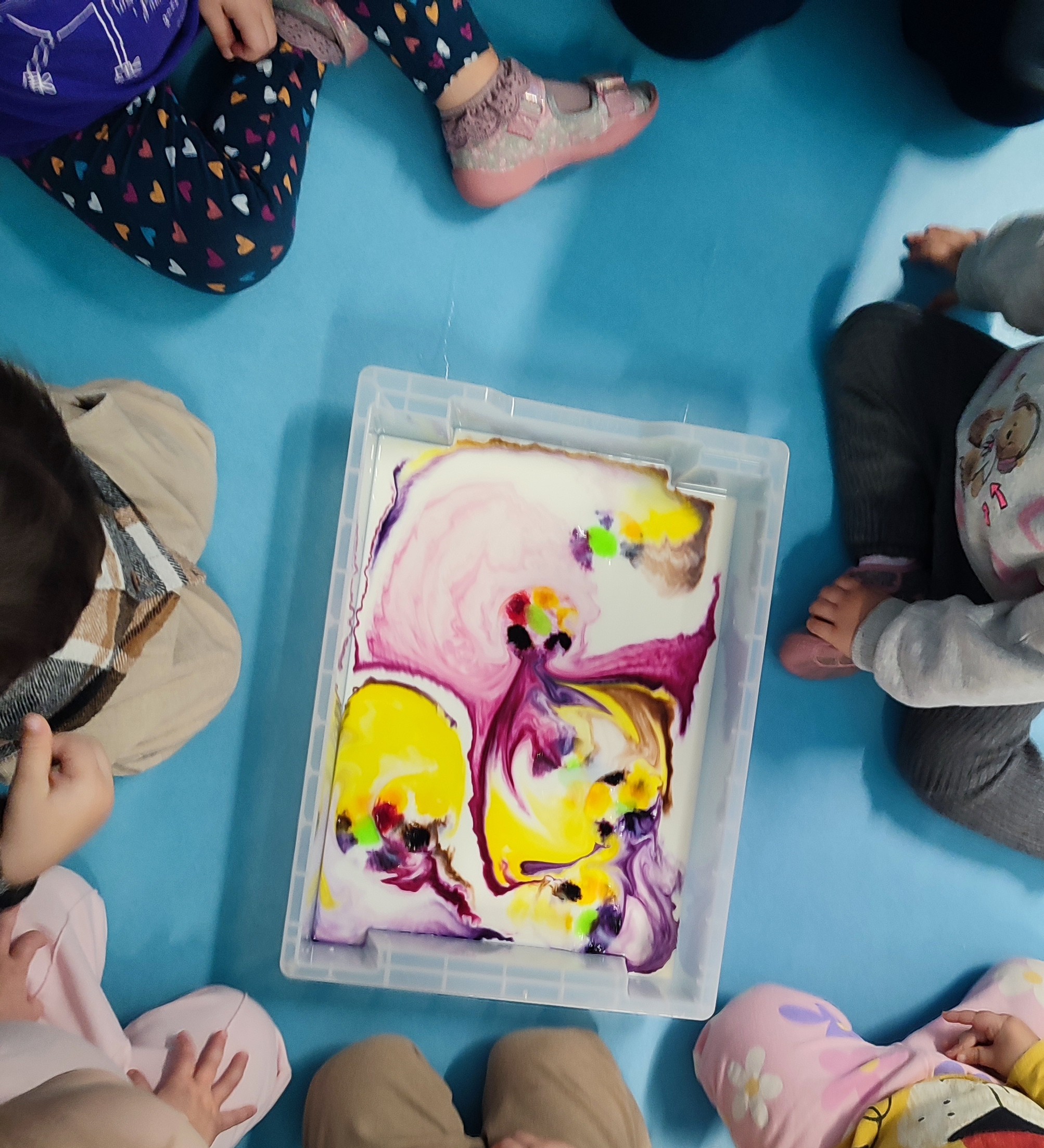 W tym miesiącu postawiliśmy również na sensoryczne odkrywanie zimy. Dzieci z wielkim zaangażowaniem uczestniczyły w zabawach ze „śniegiem” wykonanym z mąki i innych naturalnych składników. Ogromnym zainteresowaniem cieszyły się także eksperymenty plastyczne – malowanie na mleku, podczas którego powstawały niezwykłe, kolorowe kompozycje tworzone różnymi farbkami.