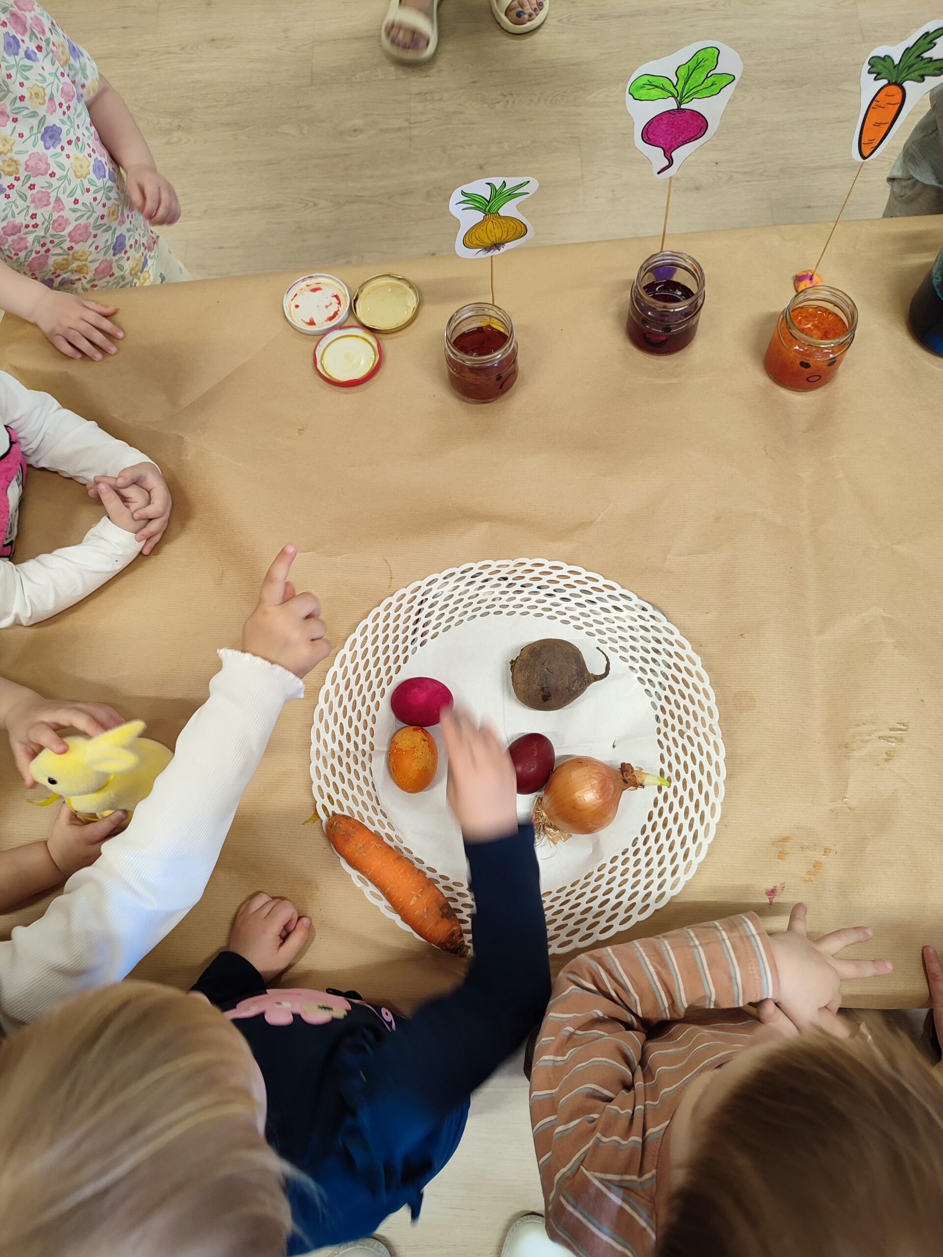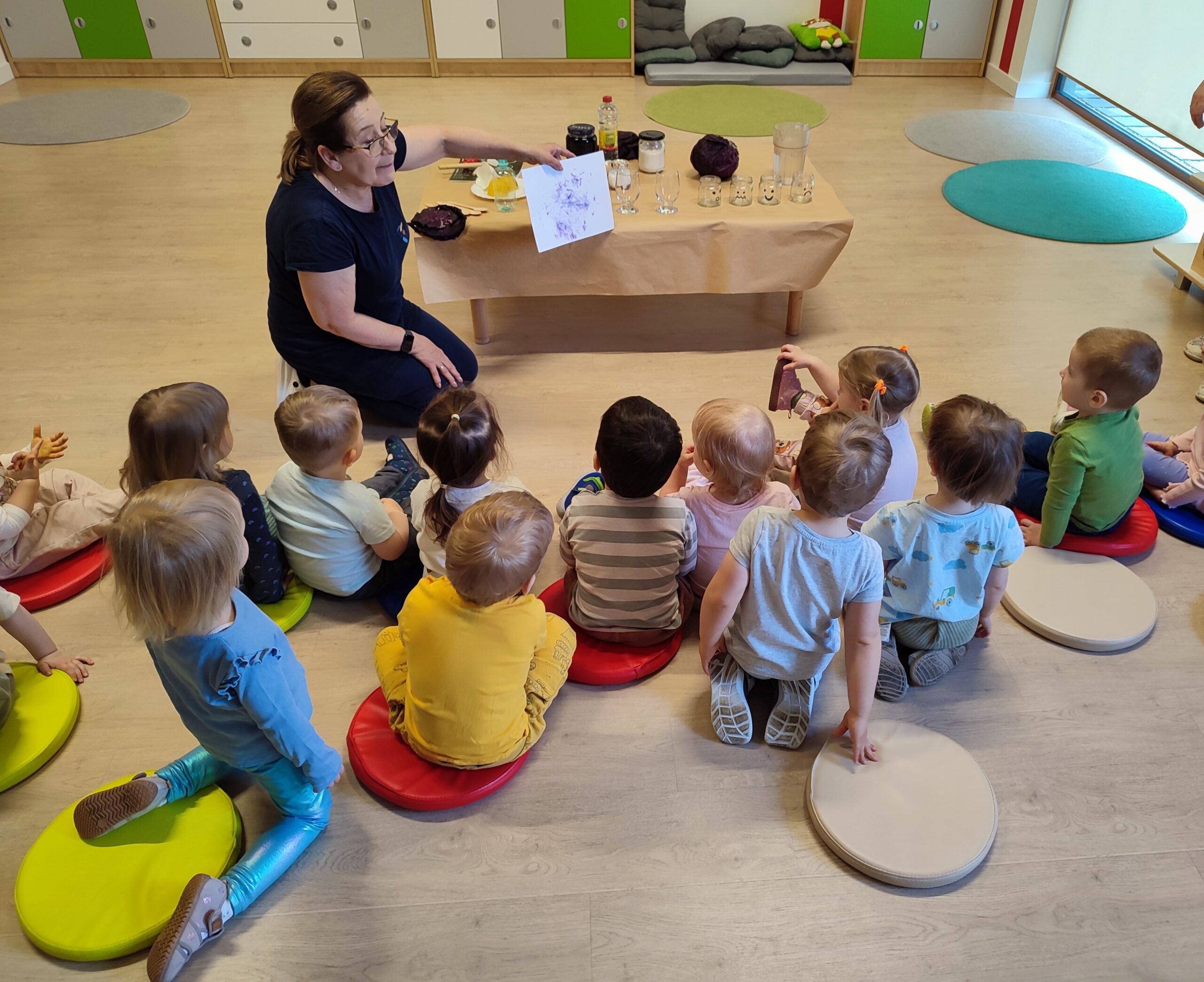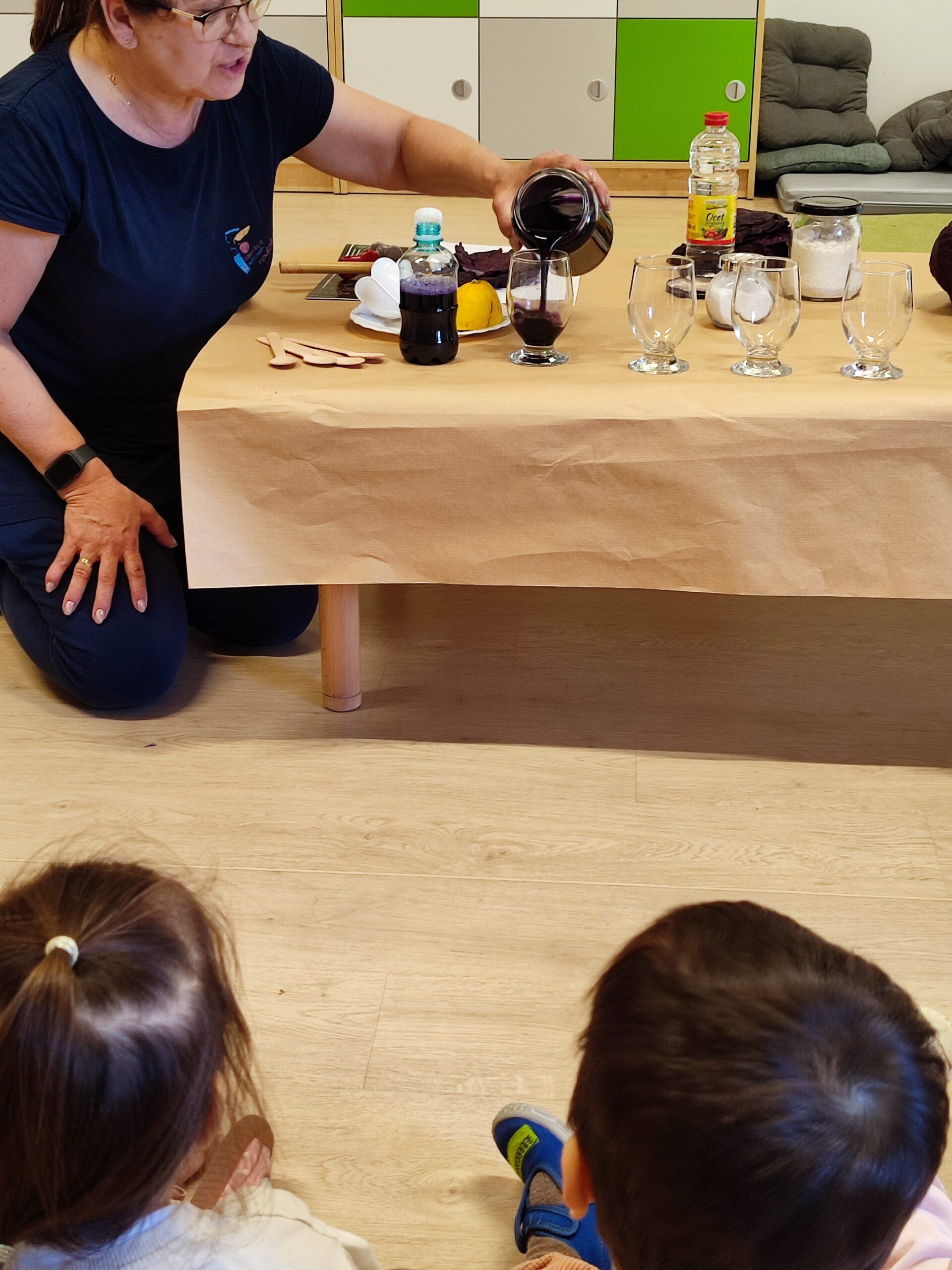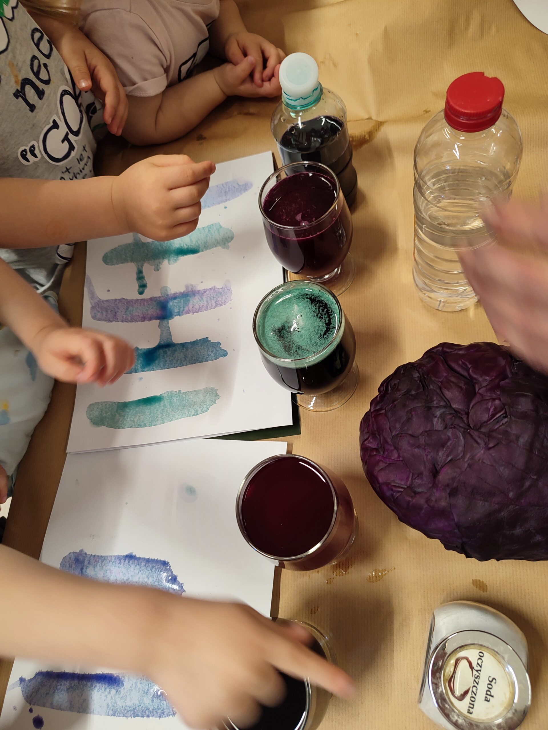 Dużym zainteresowaniem cieszyły się także zajęcia badawcze i eksperymentalne. Dzieci uczestniczyły w prostych doświadczeniach, takich jak odkrywanie barw z wykorzystaniem czerwonej kapusty czy zabawy z wodą i olejem. Była to doskonała okazja do rozwijania ciekawości świata oraz poznawania podstawowych zjawisk w sposób dostosowany do ich wieku.