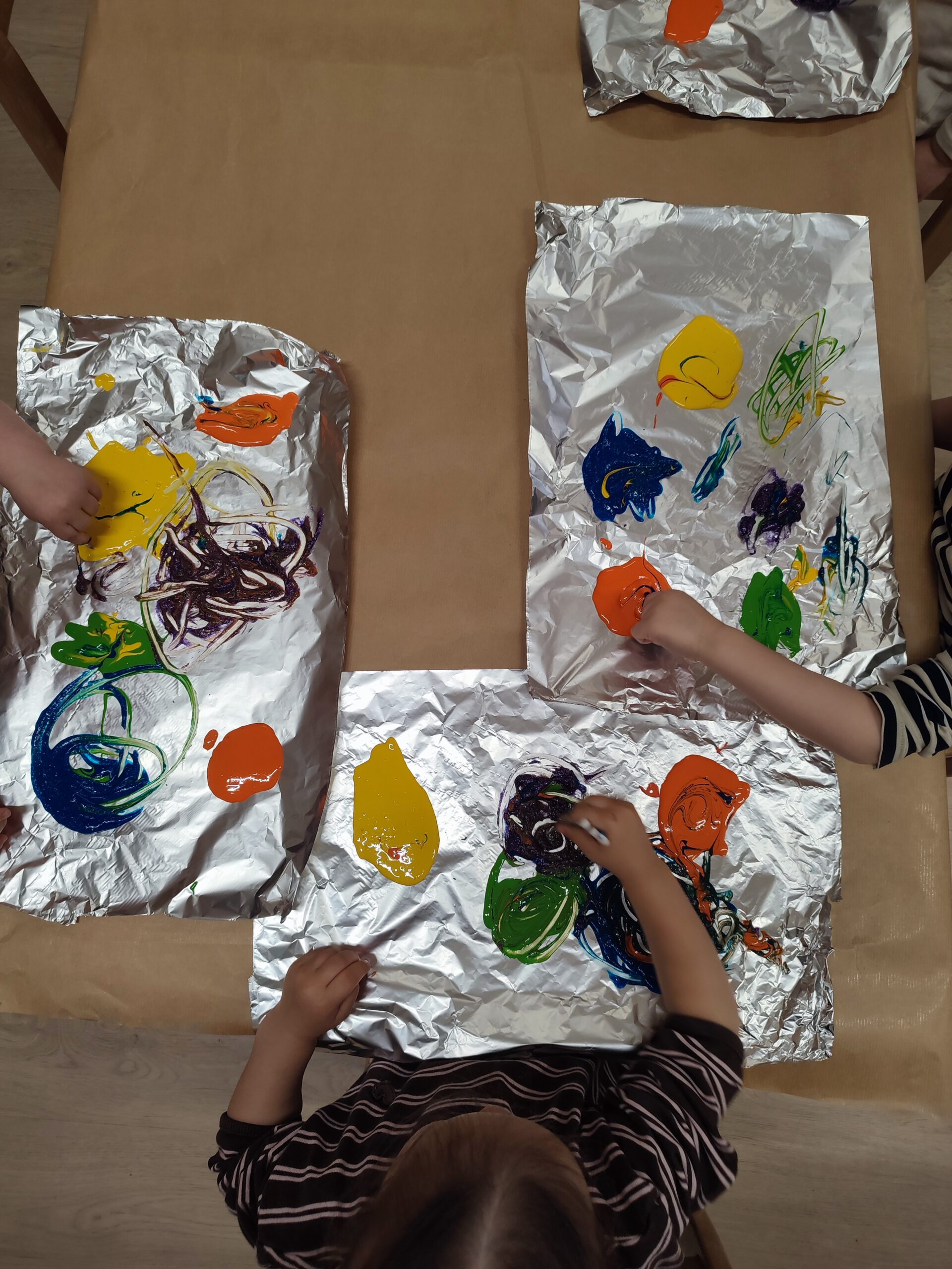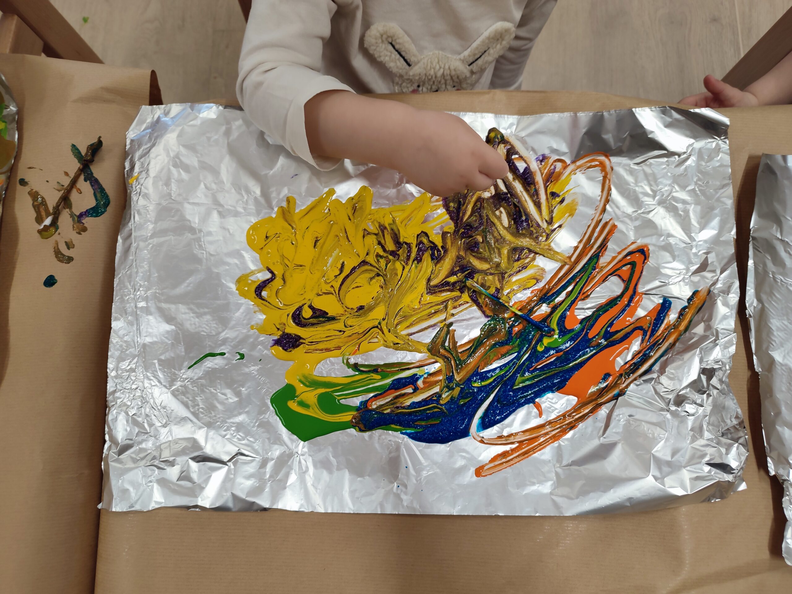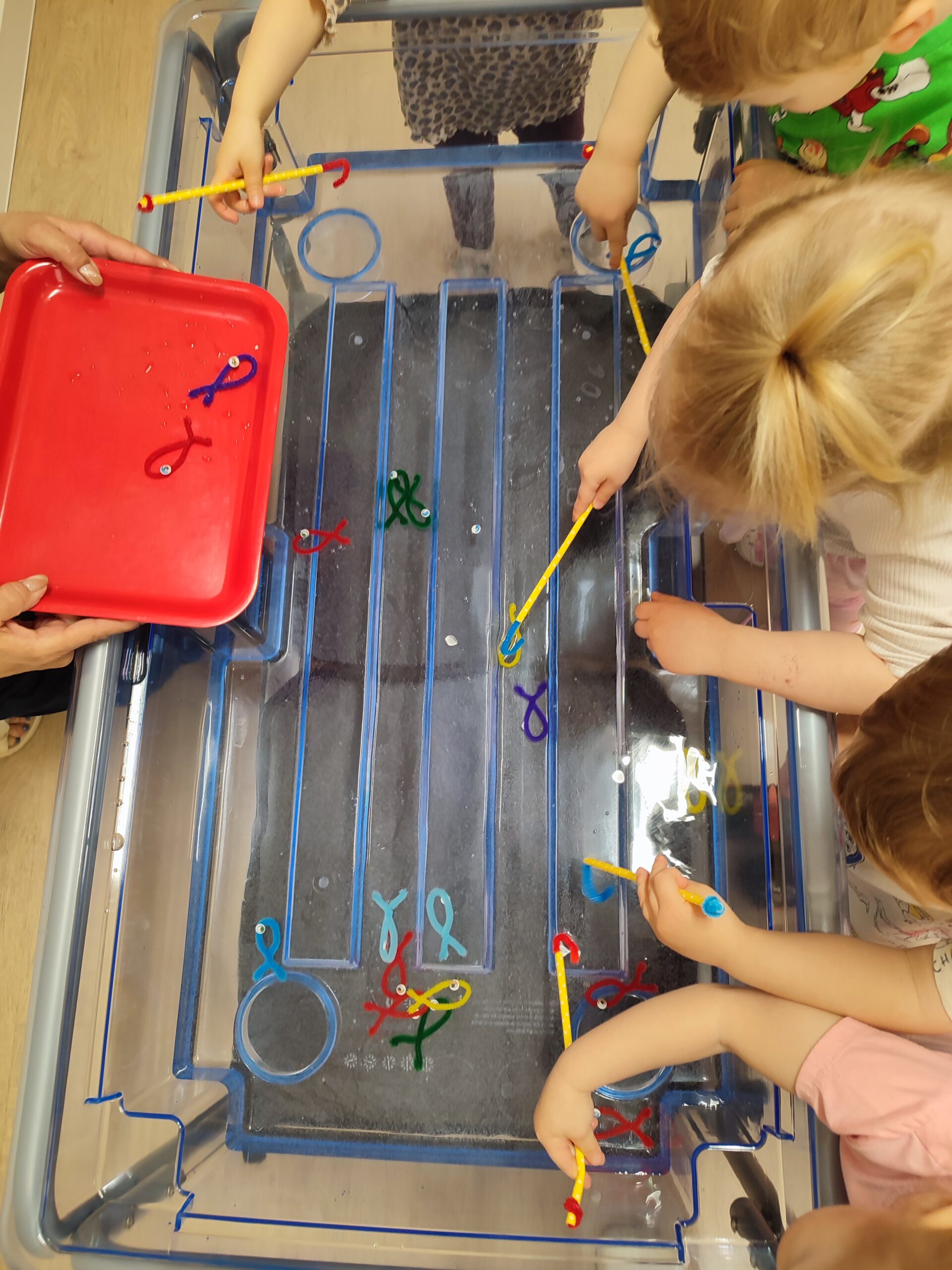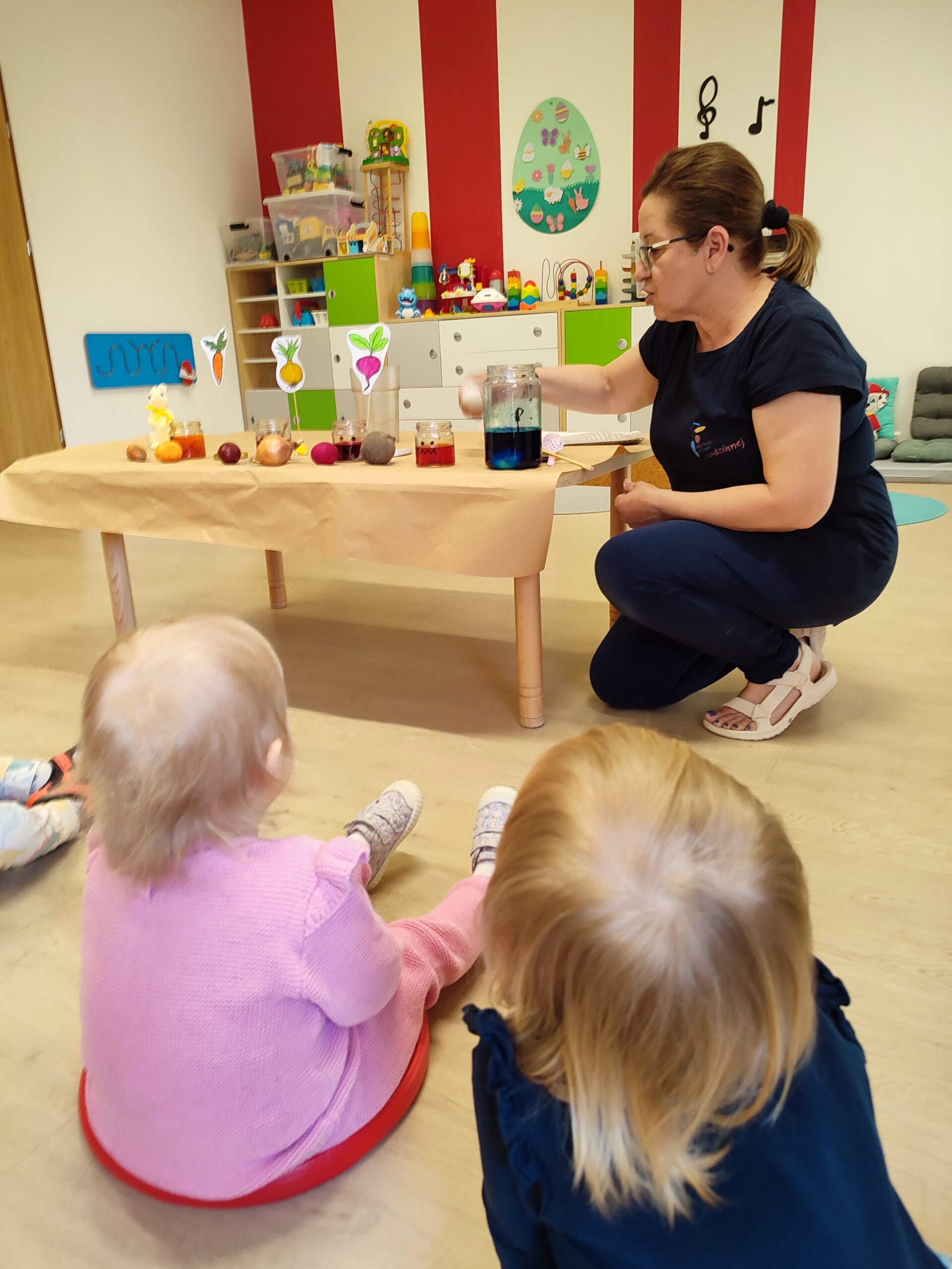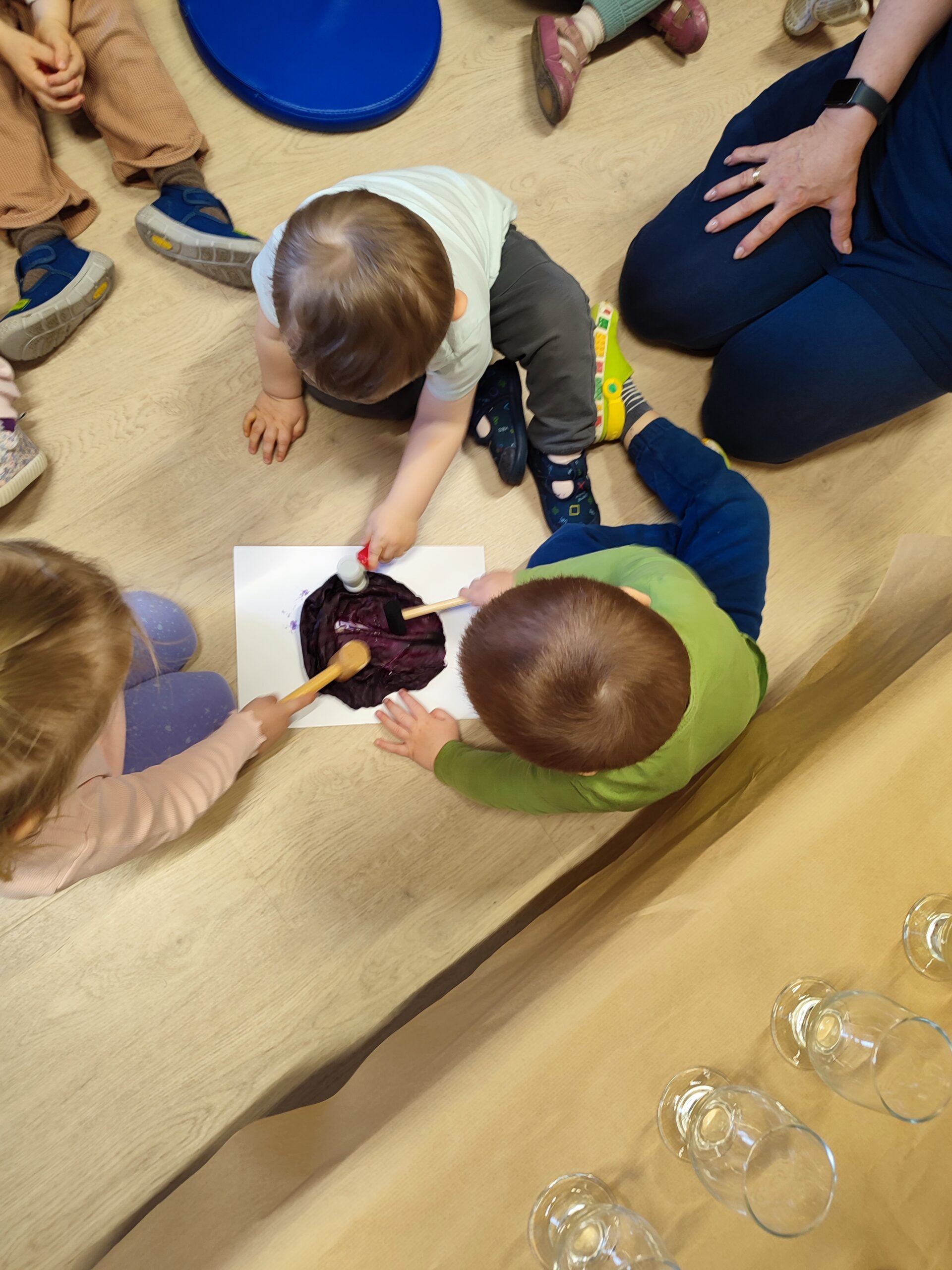 Dużym zainteresowaniem cieszyły się także zajęcia badawcze i eksperymentalne. Dzieci uczestniczyły w prostych doświadczeniach, takich jak odkrywanie barw z wykorzystaniem czerwonej kapusty czy zabawy z wodą i olejem. Była to doskonała okazja do rozwijania ciekawości świata oraz poznawania podstawowych zjawisk w sposób dostosowany do ich wieku.