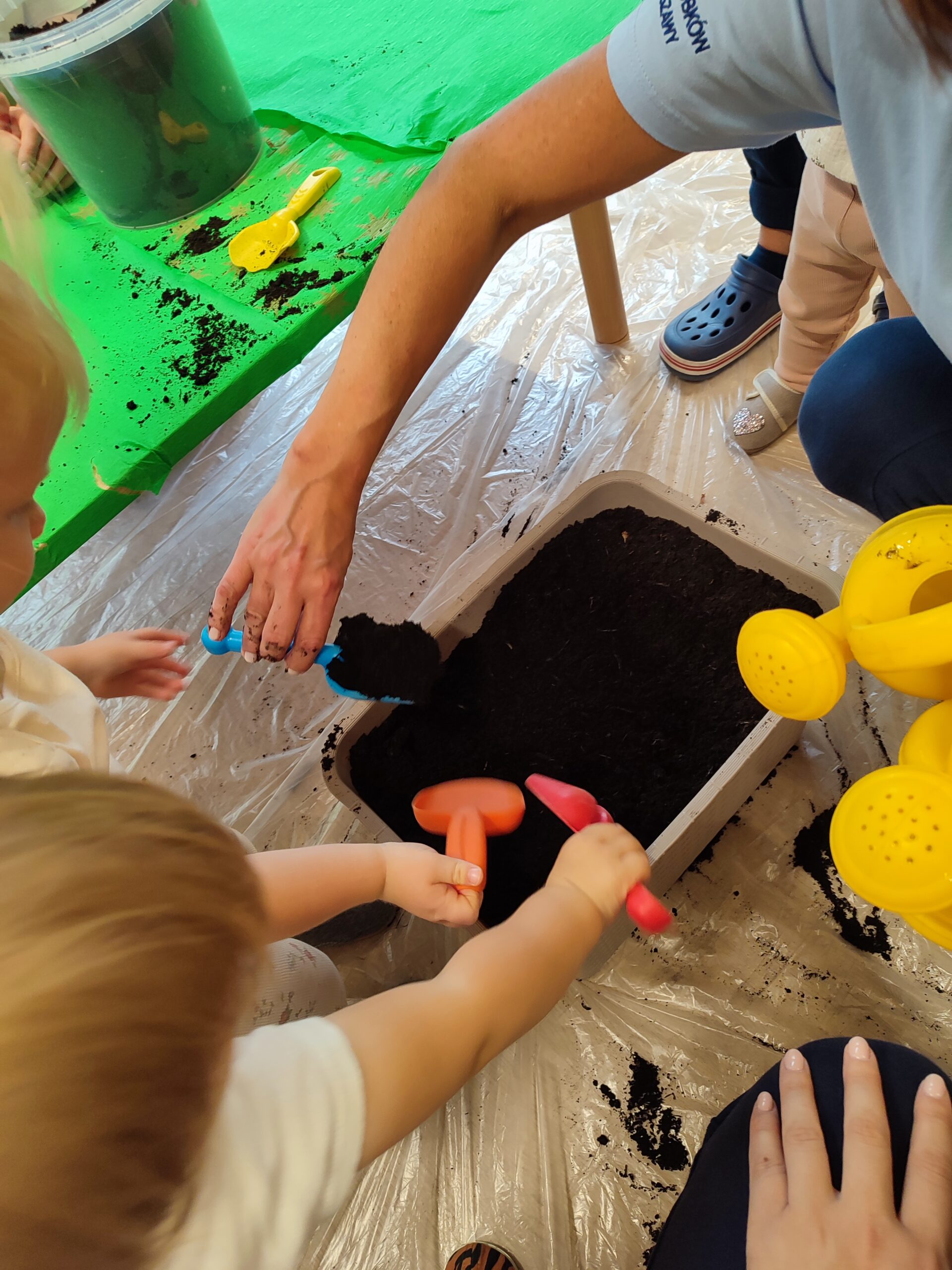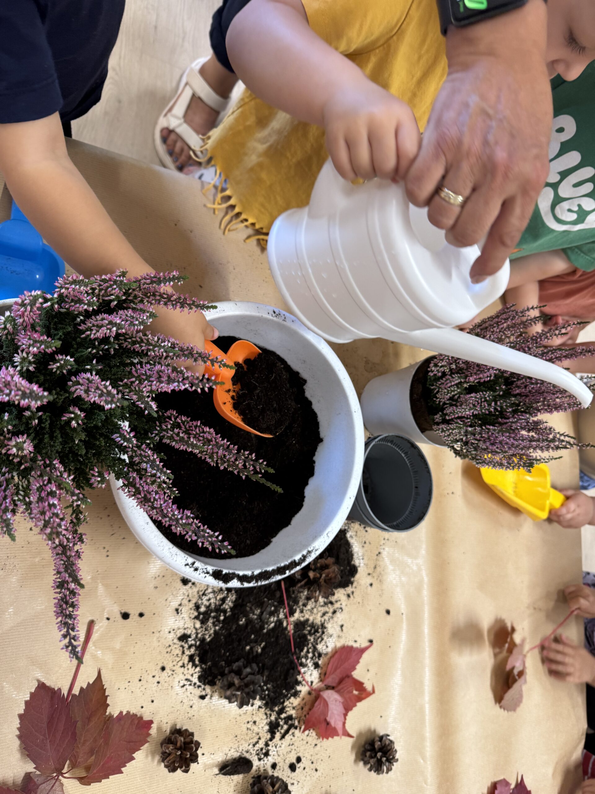 Wrzesień obfitował w liczne atrakcje i kreatywne zajęcia. Dzieci malowały farbami na stretchu, eksperymentowały z kolorami i fakturami, a także rozwijały swoje zdolności manualne i wyobraźnię. W ramach inspiracji pedagogiką Montessori uczestniczyły w zajęciach ogrodniczych – sadziliśmy kwiatki i cebulki szafirków, krokusów oraz wrzosów, ucząc się troski o przyrodę i obserwując zmiany zachodzące w naturze. 🌱🌸