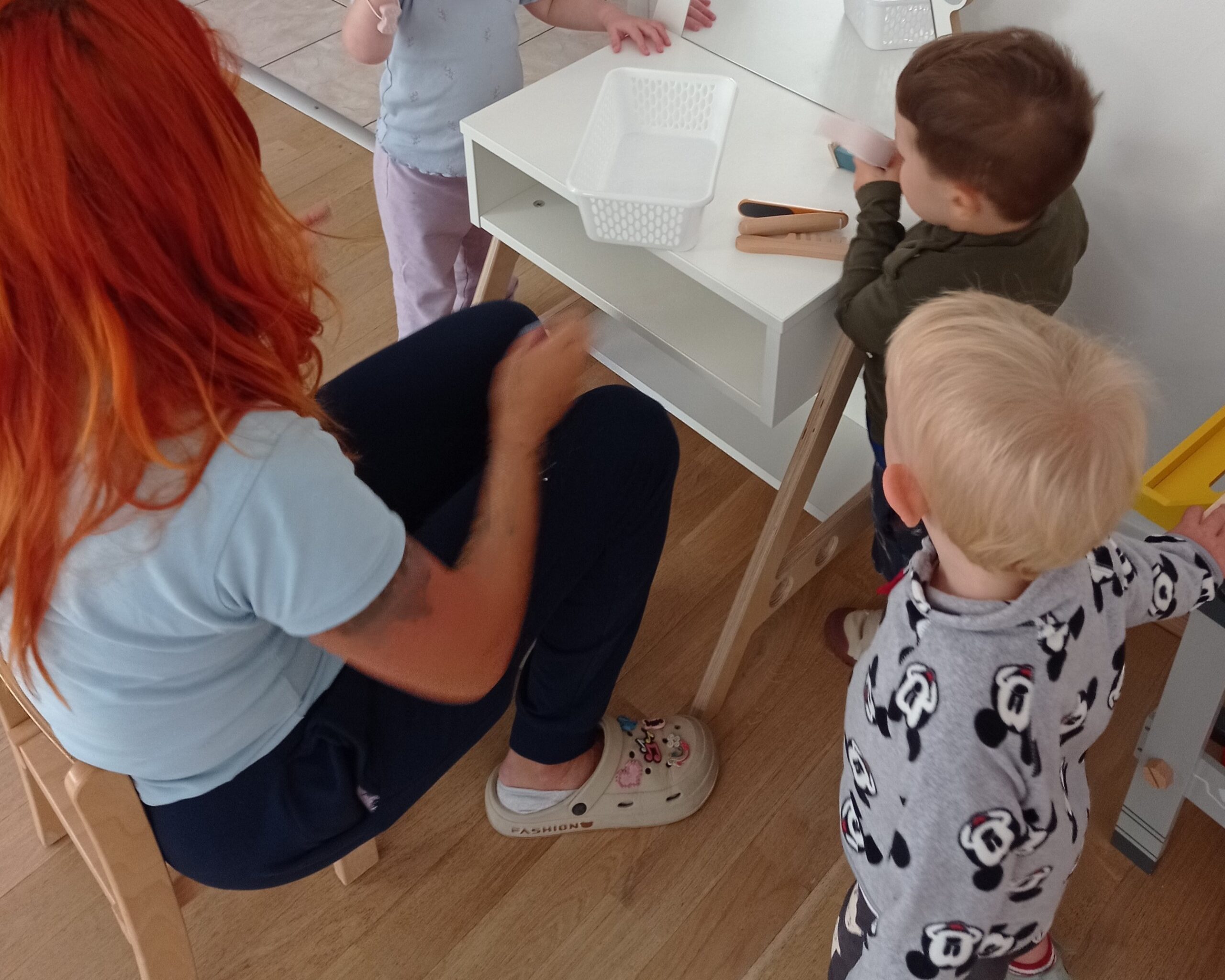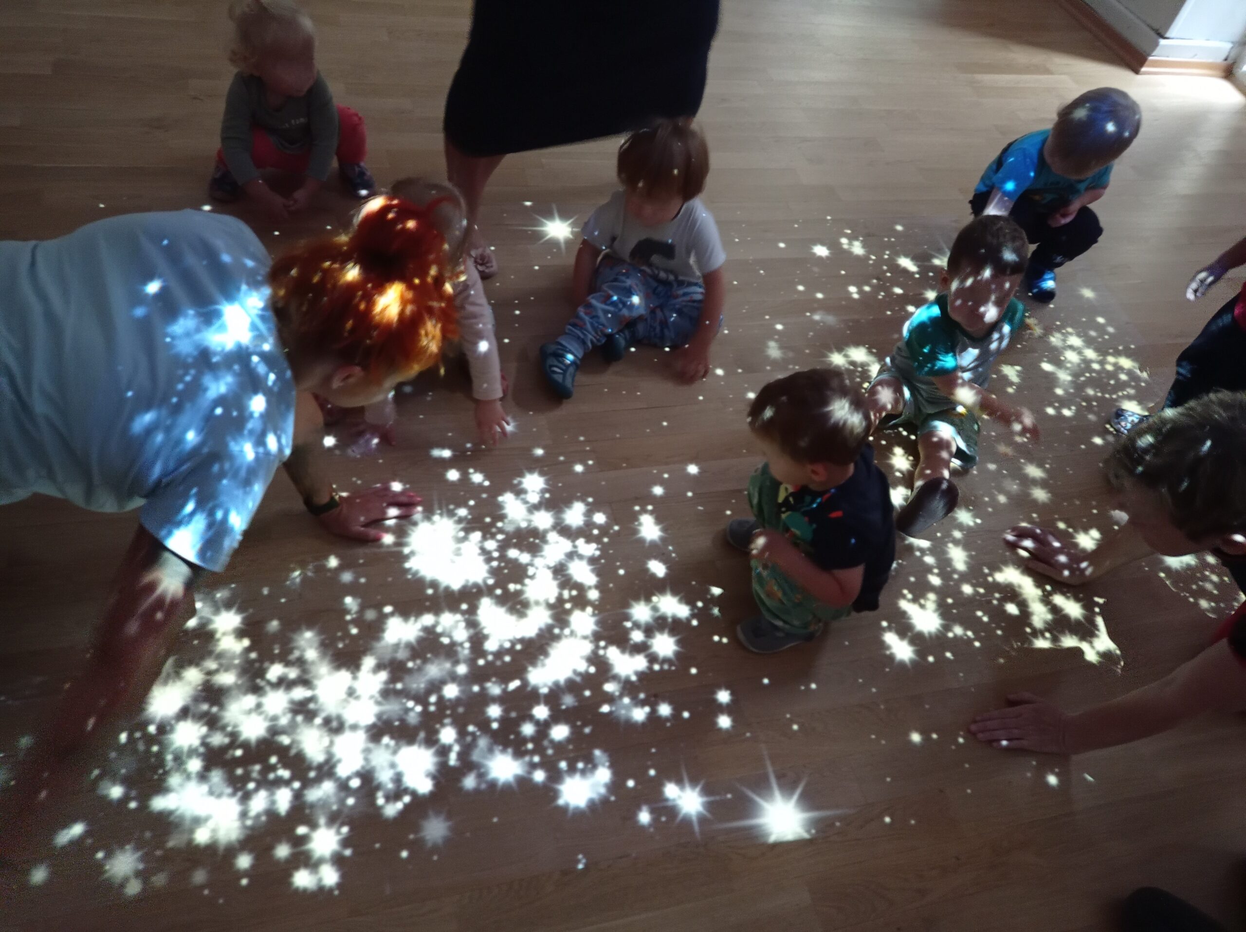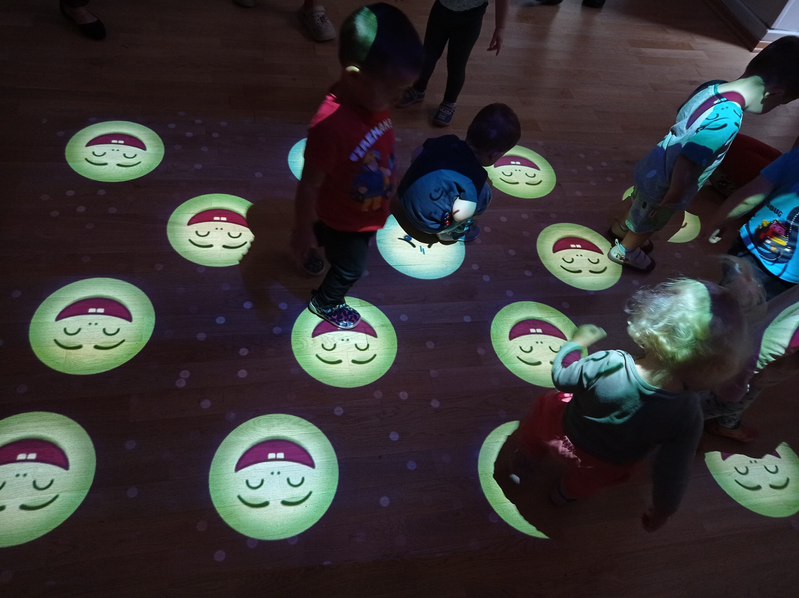 Starsze dzieci korzystały z pięknej pogody bawiąc się w naszym dużym ogrodzie, a w deszczowe dni mogły przetestować najnowszą atrakcję: magiczny dywan, który umożliwia interaktywną, angażującą wszystkie zmysły, wspólną zabawę.