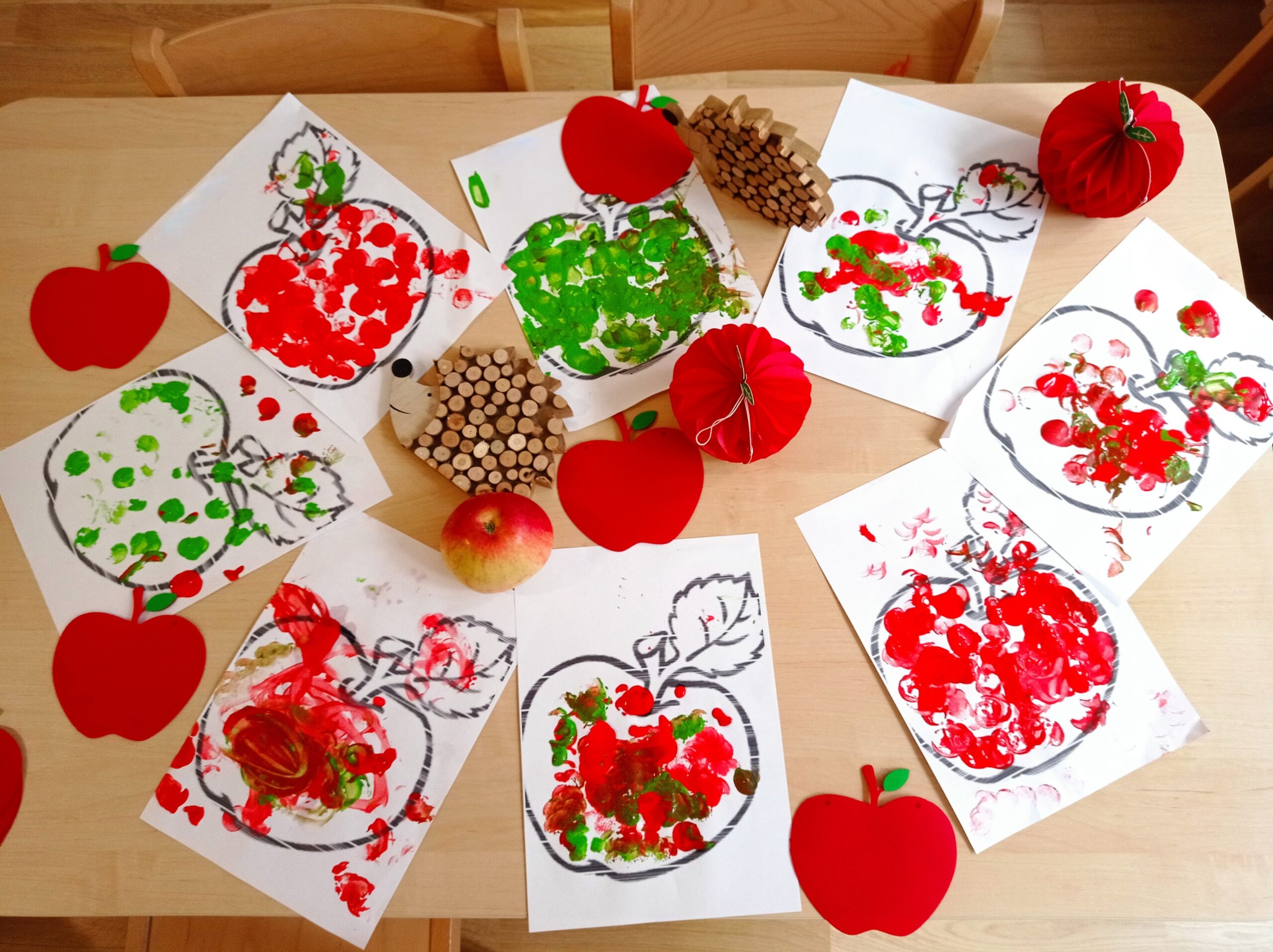 Obchodziliśmy Dzień Kropki, podczas którego wykonaliśmy kropkowe prace plastyczne i uczestniczyliśmy w kropkowo- kuleczkowych zabawach, oraz Dzień Jabłka, który był okazją, by bliżej poznać różne gatunki jabłek i spróbować świeżo wyciskanego, owocowego soku.