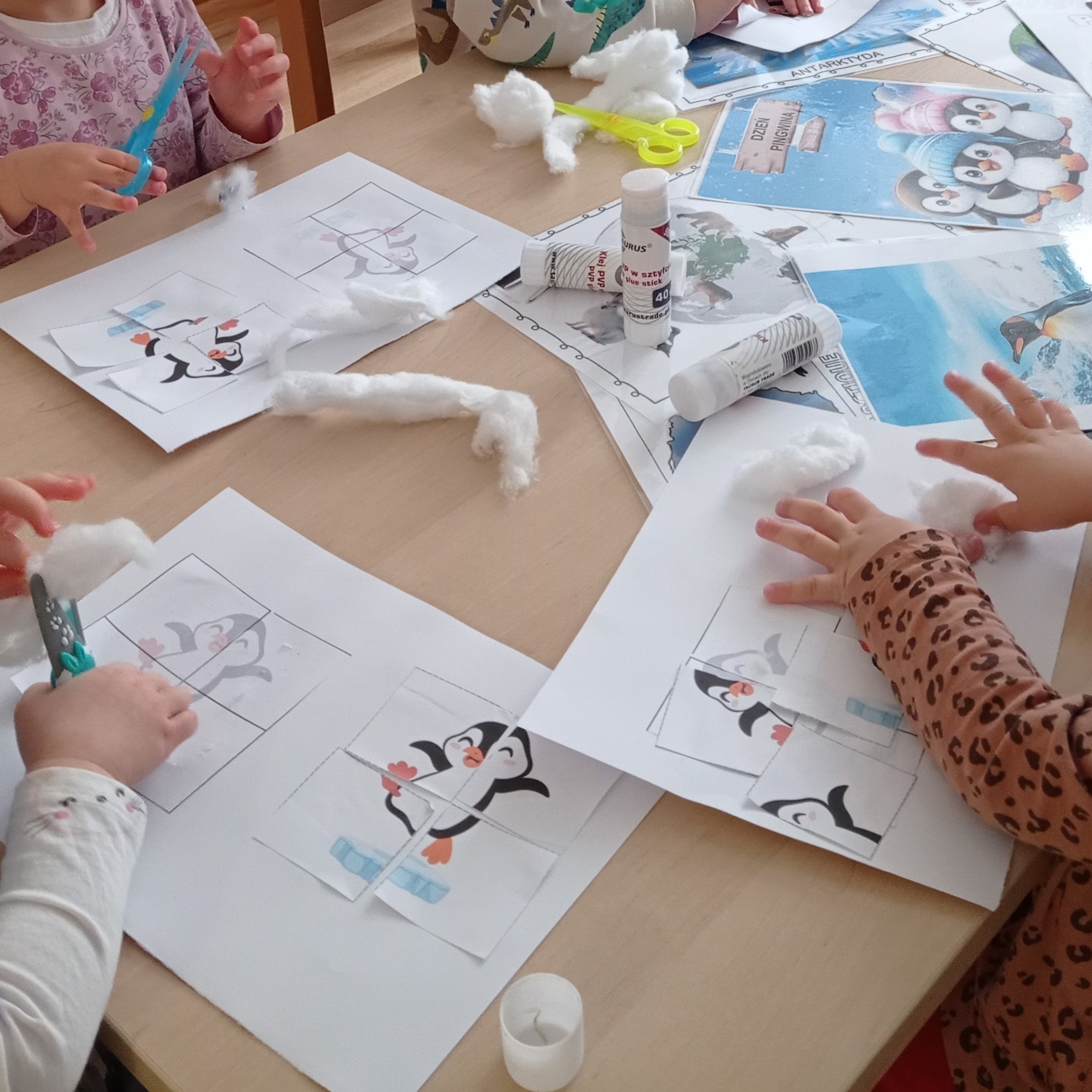 W styczniu rozmawiałyśmy z dziećmi o zmianach, jakie zachodzą w przyrodzie wraz z nadejściem zimy. Wspólnie oglądaliśmy zdjęcia zwierząt niezamieszkujących strefę polarną i opowiadałyśmy podopiecznym o ich zwyczajach. Wykonaliśmy prace plastyczne z pingwinkami i białymi niedźwiedziami. Opowiadałyśmy również o tym, jakie zjawiska pogodowe są typowe dla zimy oraz o tym, jak powinniśmy ubierać się w zimne dni, gdy wychodzimy na dwór.