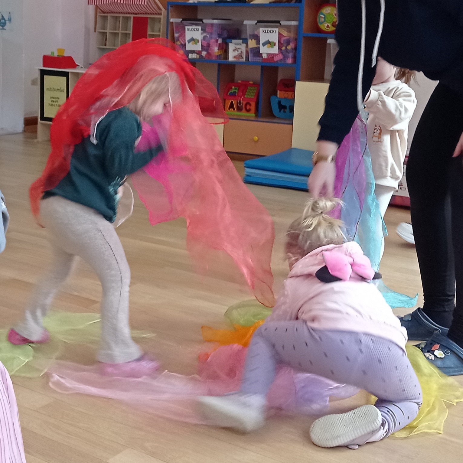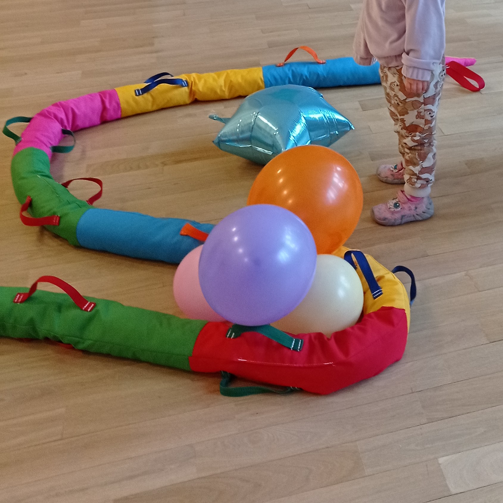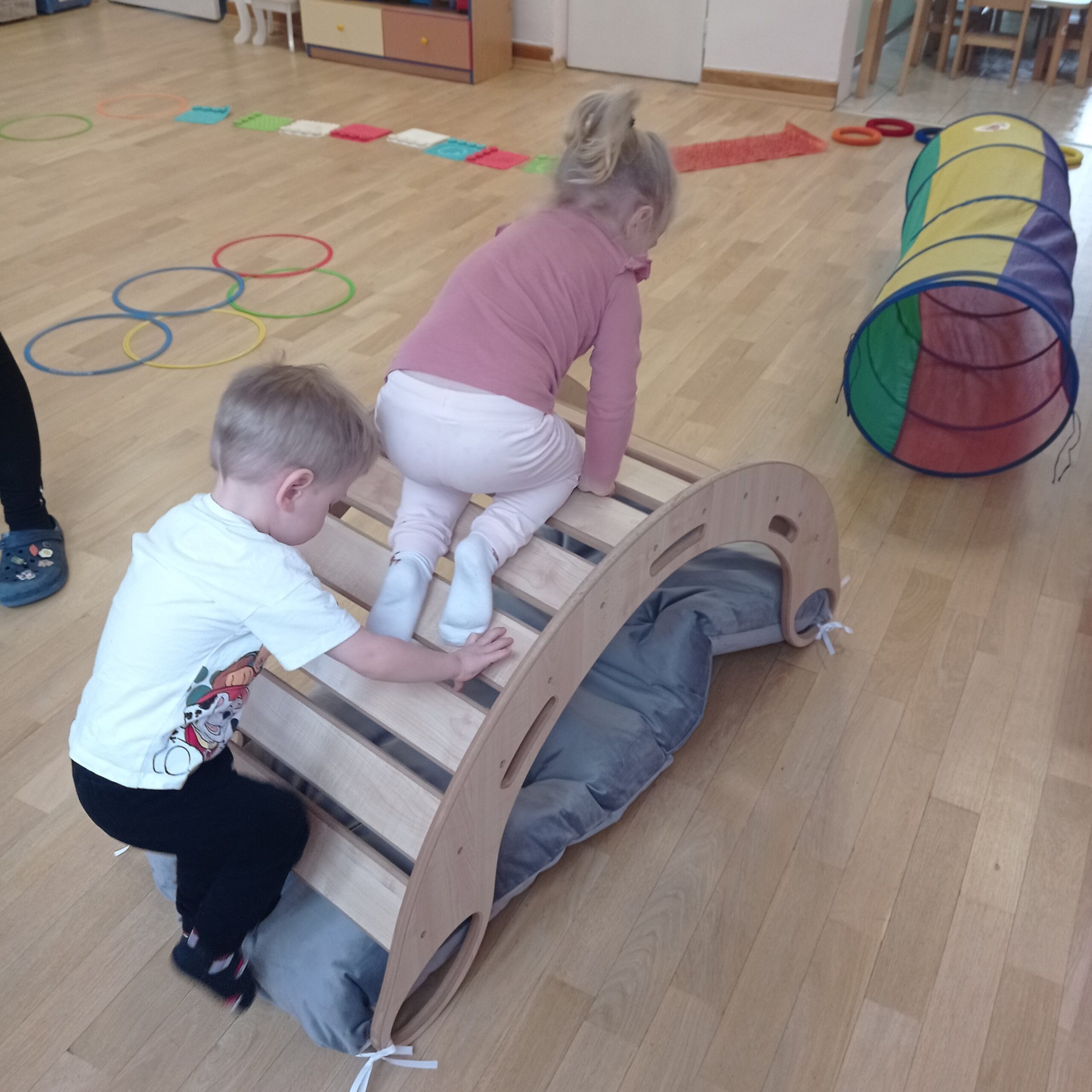 W ramach zabaw ruchowych ćwiczyliśmy jogę, pokonywaliśmy tory przeszkód, chodziliśmy w pociągu jednocześnie podskakując, tupiąc lub klaskając, budowaliśmy forty z wielkich klocków piankowych, toczyliśmy bitwy na papierowe śnieżki, bawiliśmy się w klasyczne zabawy dziecięce: „kółko graniaste” i „stary niedźwiedź mocno śpi”.