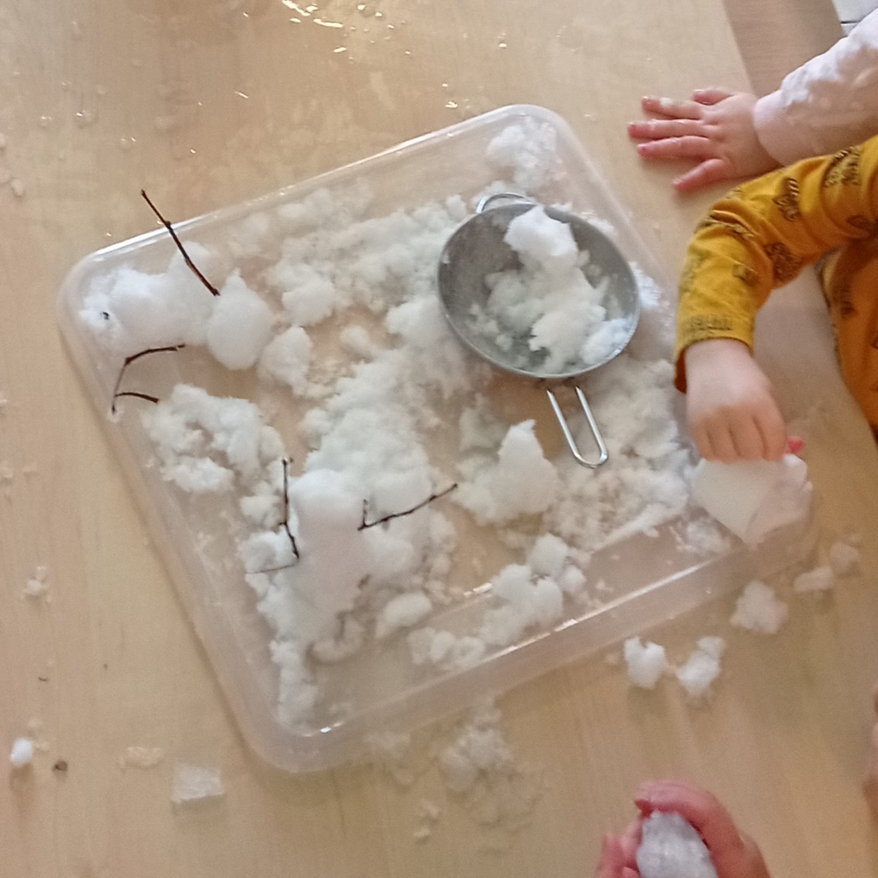 Dzień Spaghetti był okazją do zabawy sensorycznej z prawdziwym makaronem. Dzieci pracowały również z masami plastycznymi, piaskiem kinetycznym, sztucznym śniegiem i prawdziwym śniegiem, który przyniosłyśmy z ogrodu.