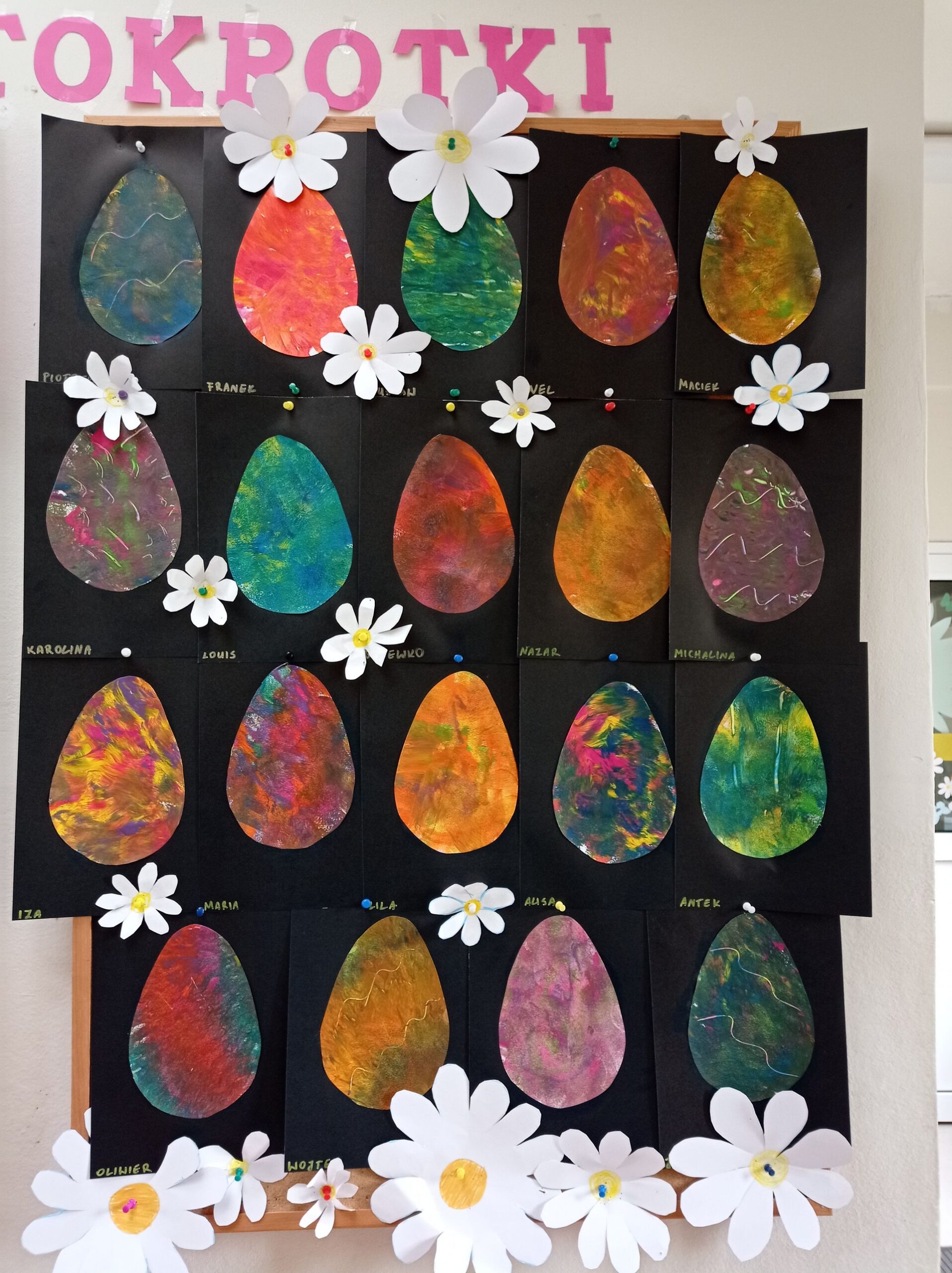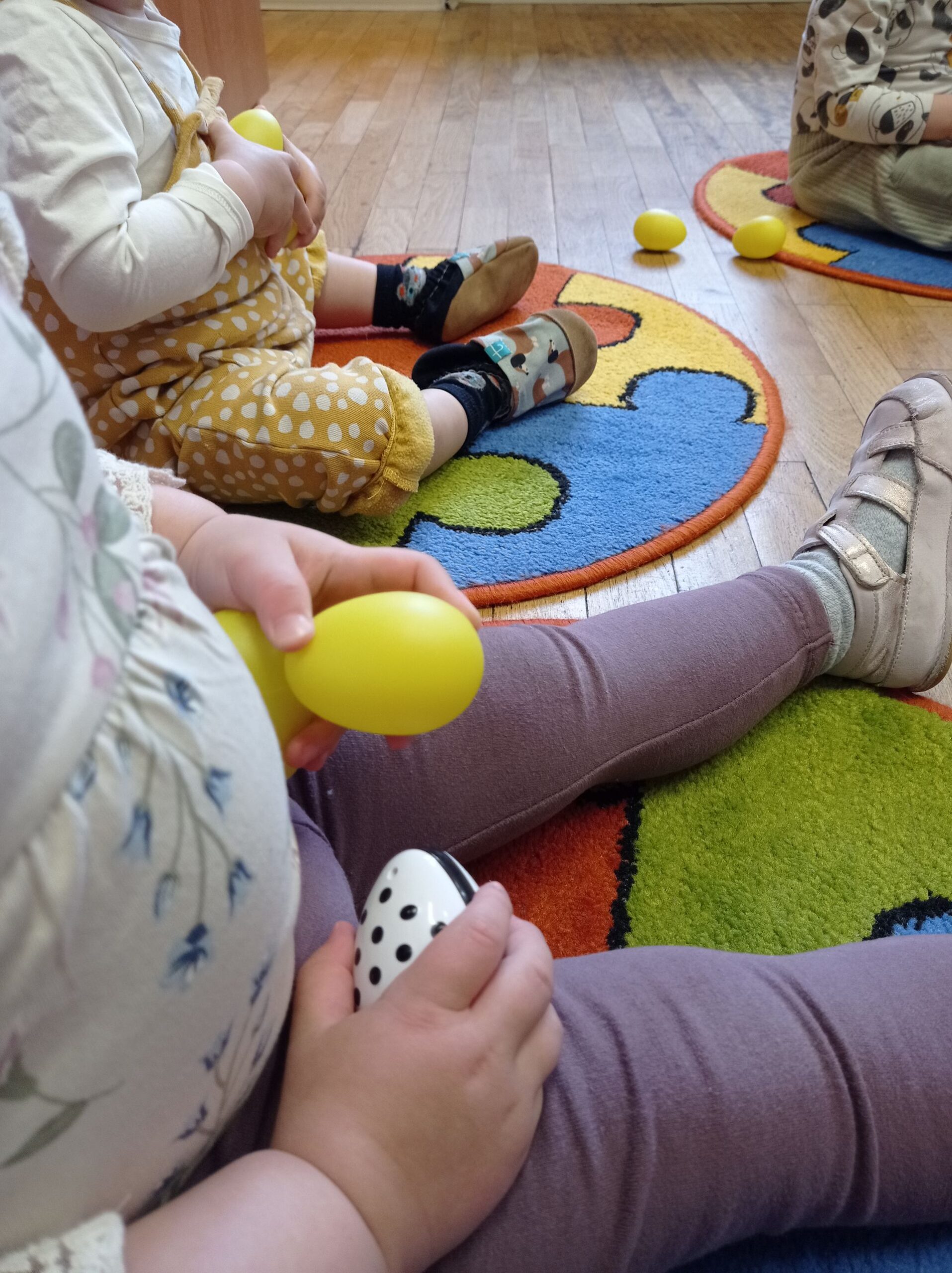 W kwietniu dużo czasu przeznaczyliśmy na przygotowania do świąt wielkanocnych. Malowaliśmy pisanki oraz zajączki. Zaprosiliśmy również naszych Rodziców na warsztaty wielkanocne i wspólnie z nimi przygotowywaliśmy ozdoby świąteczne (i nie tylko). To był super czas spędzony na wspólnej zabawie! Poznawaliśmy również różne techniki malarskie, nie każdy z nas chciał malować rączkami, ale z pomocą np. pędzla już świetnie sobie radziliśmy. Wyklejaliśmy piórkami ptaki i zauważyliśmy, że piórka są bardzo lekkie i uciekają spod paluszków, gdy tylko mocniej dmuchniemy. Ciocia pokazała nam, jak przygotować ciasto na naleśniki, jak je usmażyć, a my z wielkim apetytem zjedliśmy wszystkie. Były pyszne! Uczyliśmy się również wycinania nożyczkami – to bardzo trudna sztuka. Następnym razem na pewno poradzimy sobie lepiej. Ciocie przygotowały nam także pudełko rozmaitości – z ciekawością sprawdzaliśmy, co w nim ukryły. Dużo czasu spędzamy także w naszym żłobkowym ogrodzie. Gdy tylko pogoda nam dopisuje, wychodzimy także po południu. Nie zabrakło nam także czasu na zabawy swobodne, budowaliśmy tory i pociąg oraz różne budowle z klocków.