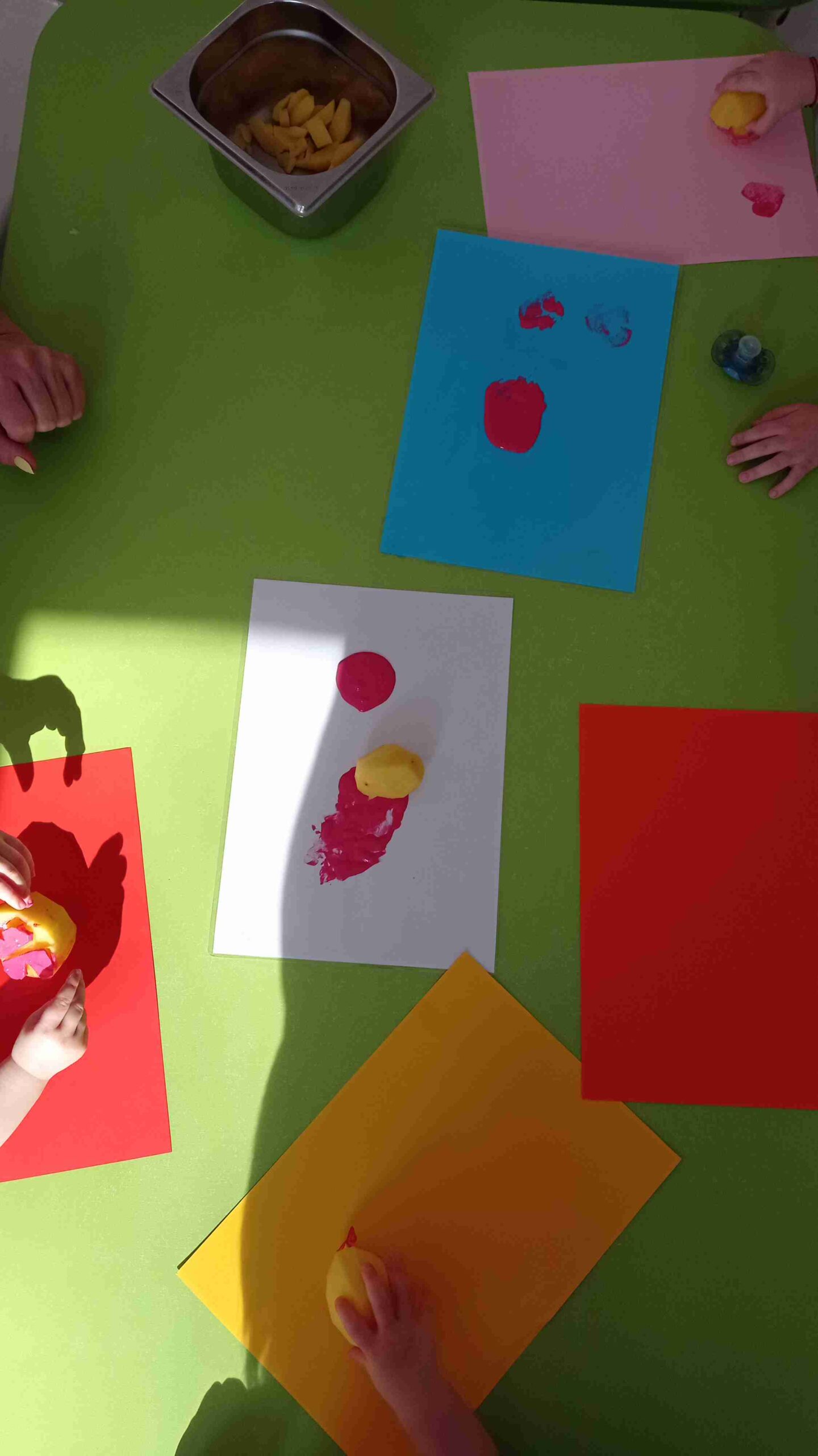 Dzieci brały udział w zajęciach plastycznych tworząc m.in ziemniaczane wzory, stemplując farbami przy użyciu ziemniaków i pędzelków