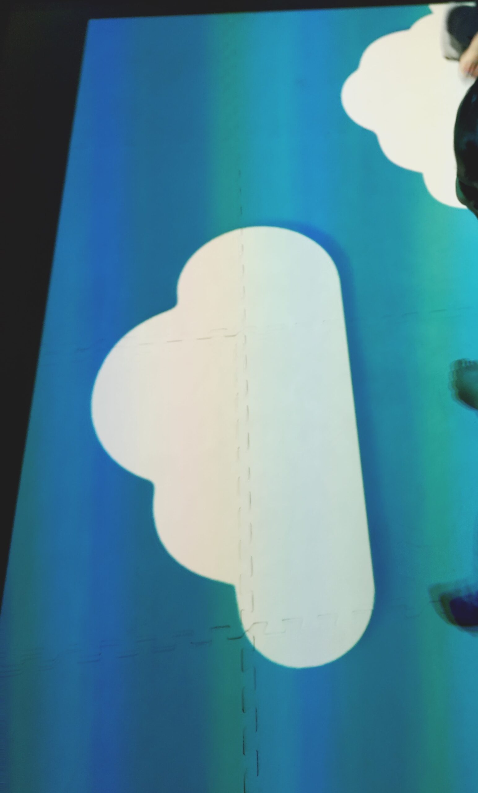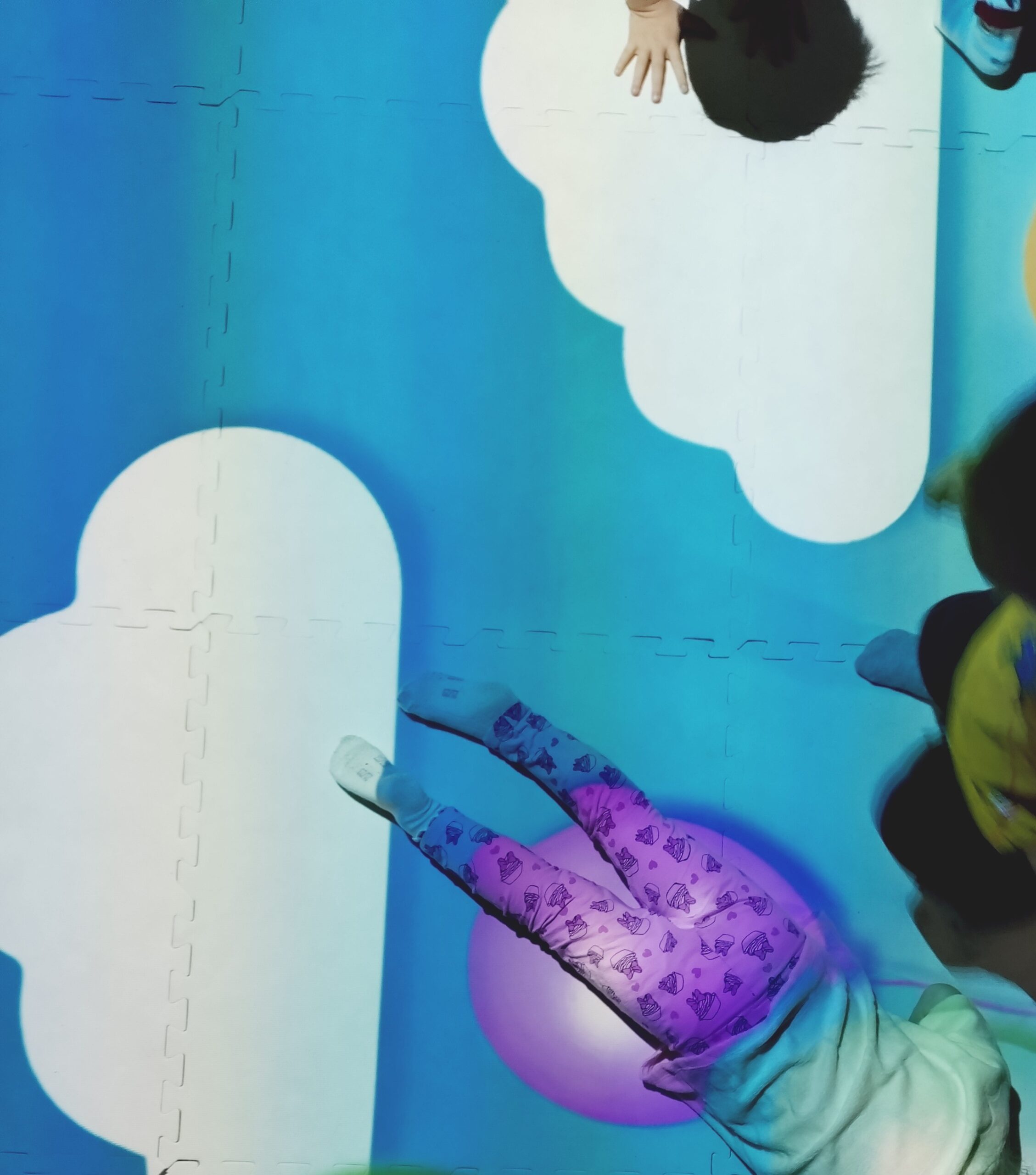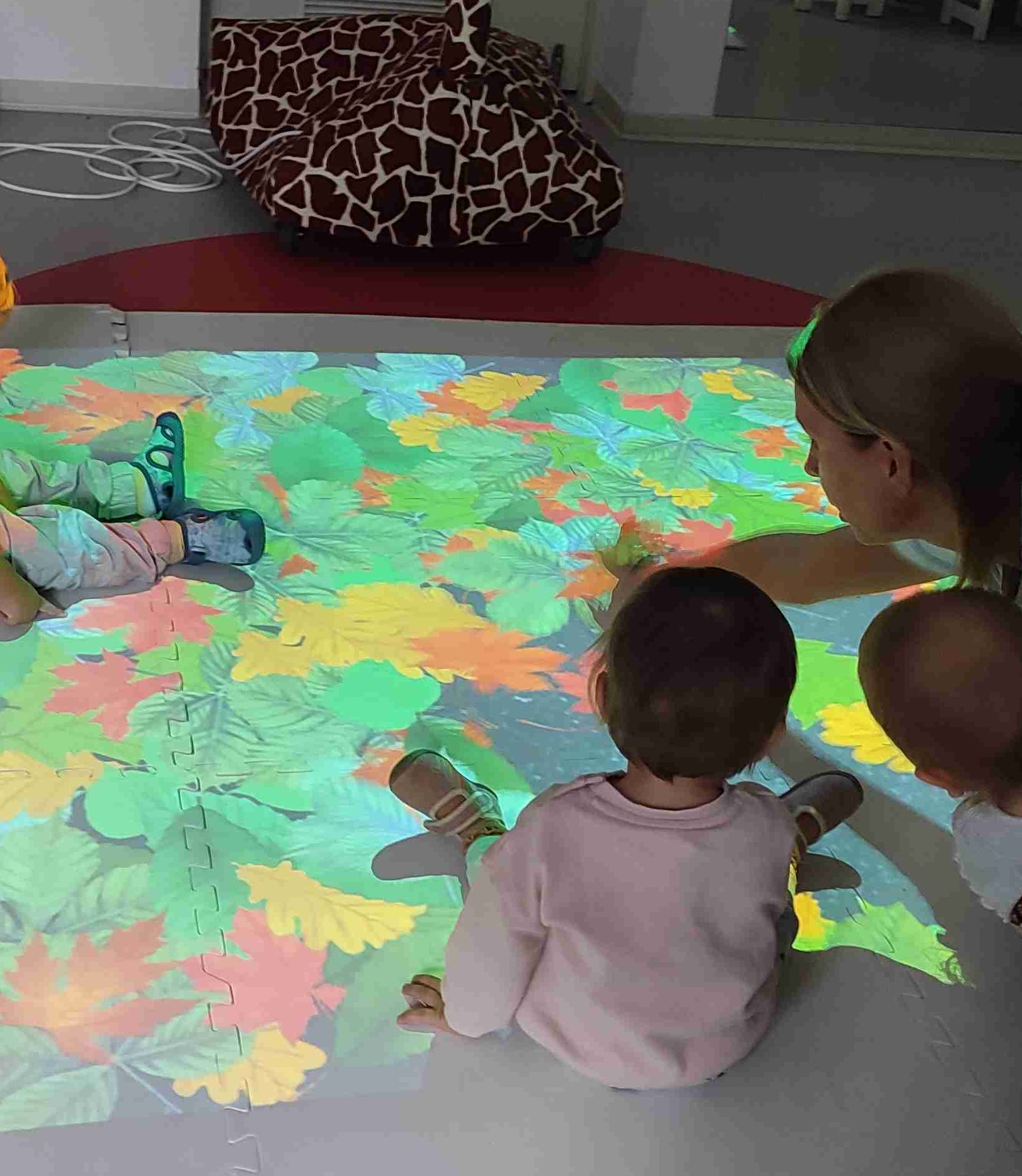 W naszym żłobeczku nasi podopieczni doskonale bawią się w sali projekcyjnej, gdzie jest magiczny dywan. Dzieci łączą tam zabawę z nauką, co wpływa na ich rozwój motoryki, koordynacji wzrokowo – ruchowej, spostrzegawczości i szybkości.