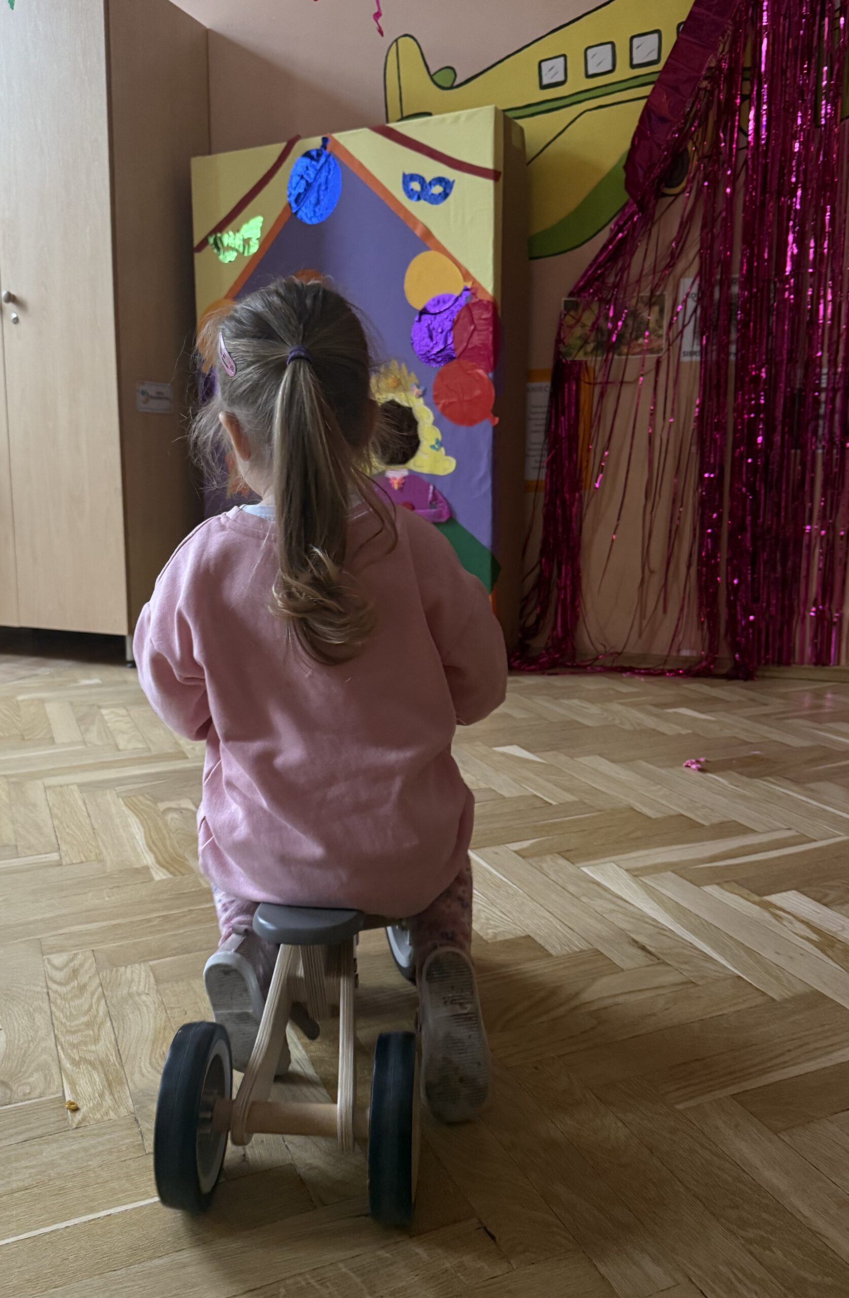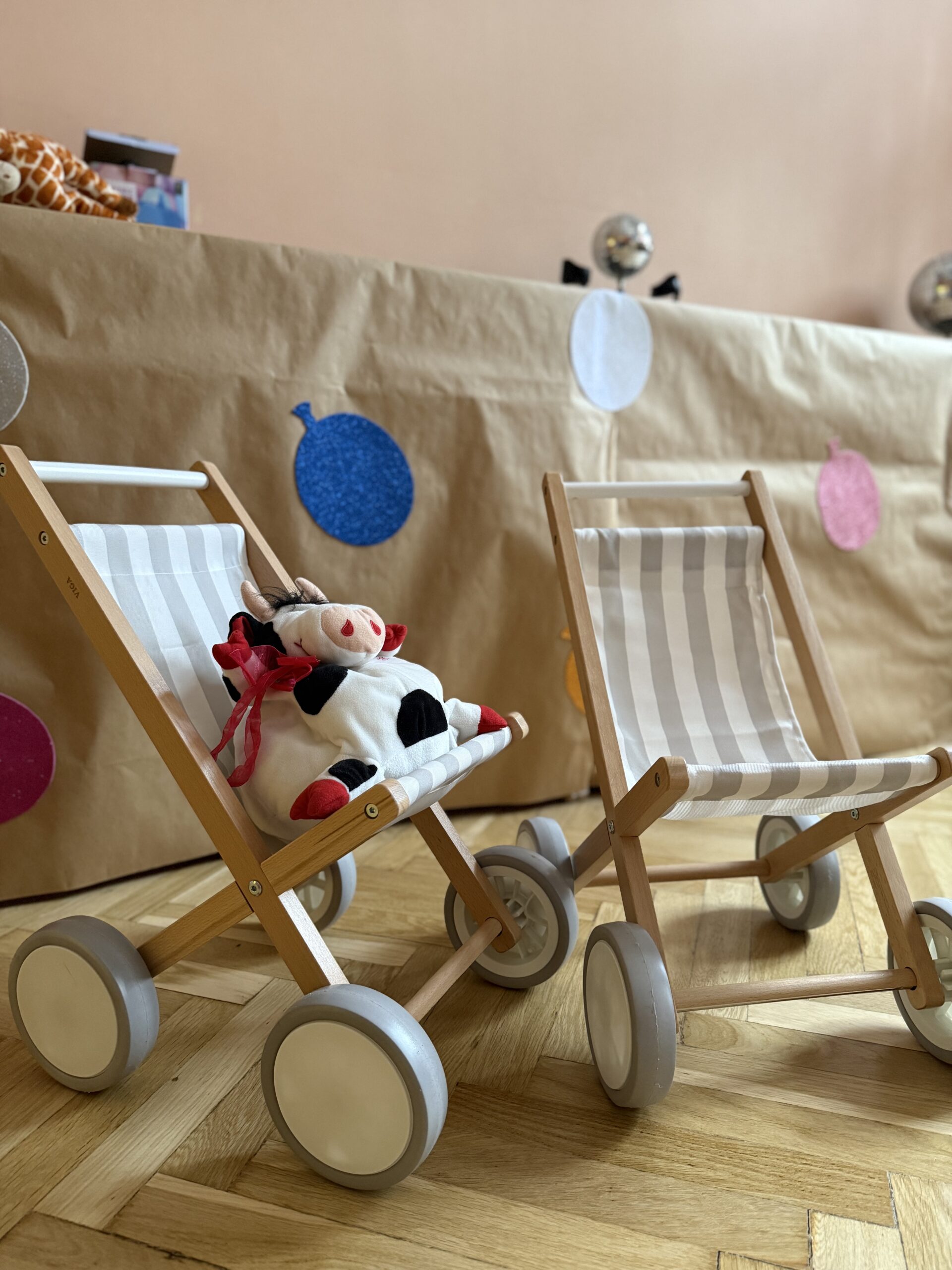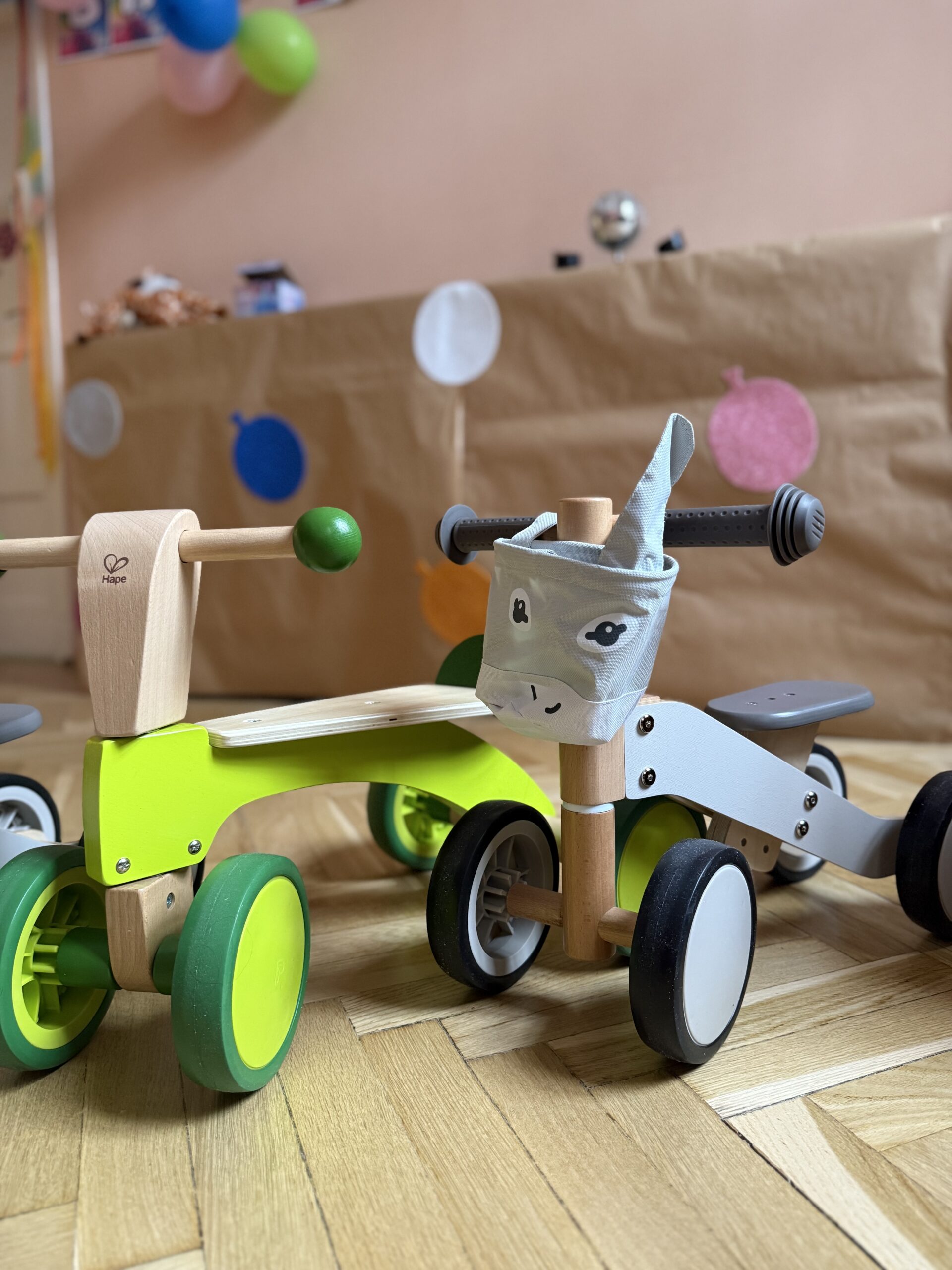 - Drewniane jeździki – wspierające rozwój motoryki dużej i naukę równowagi.