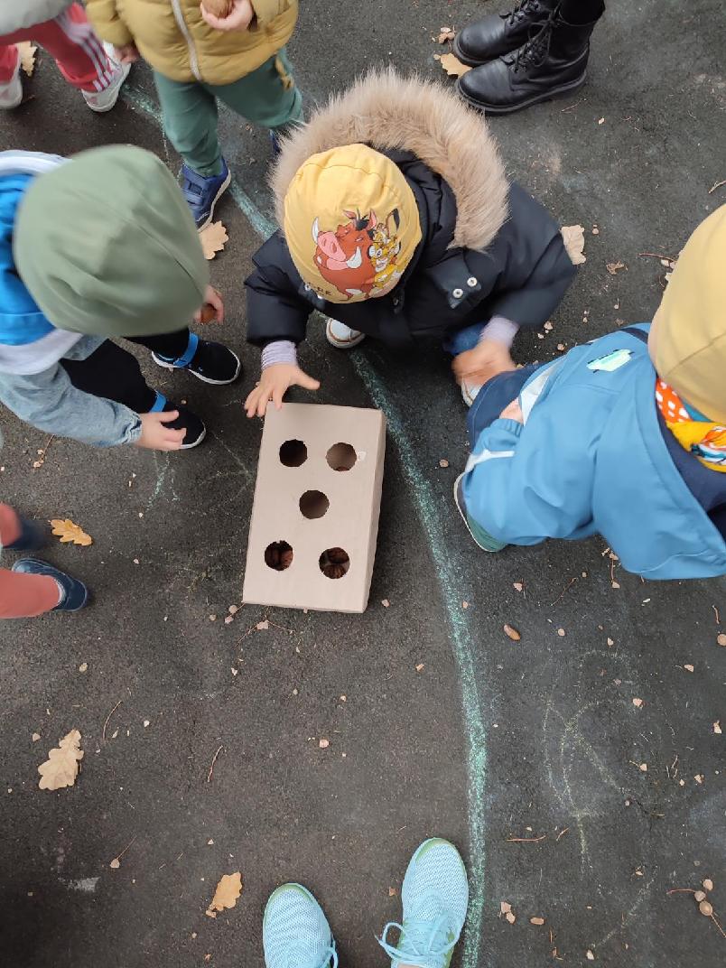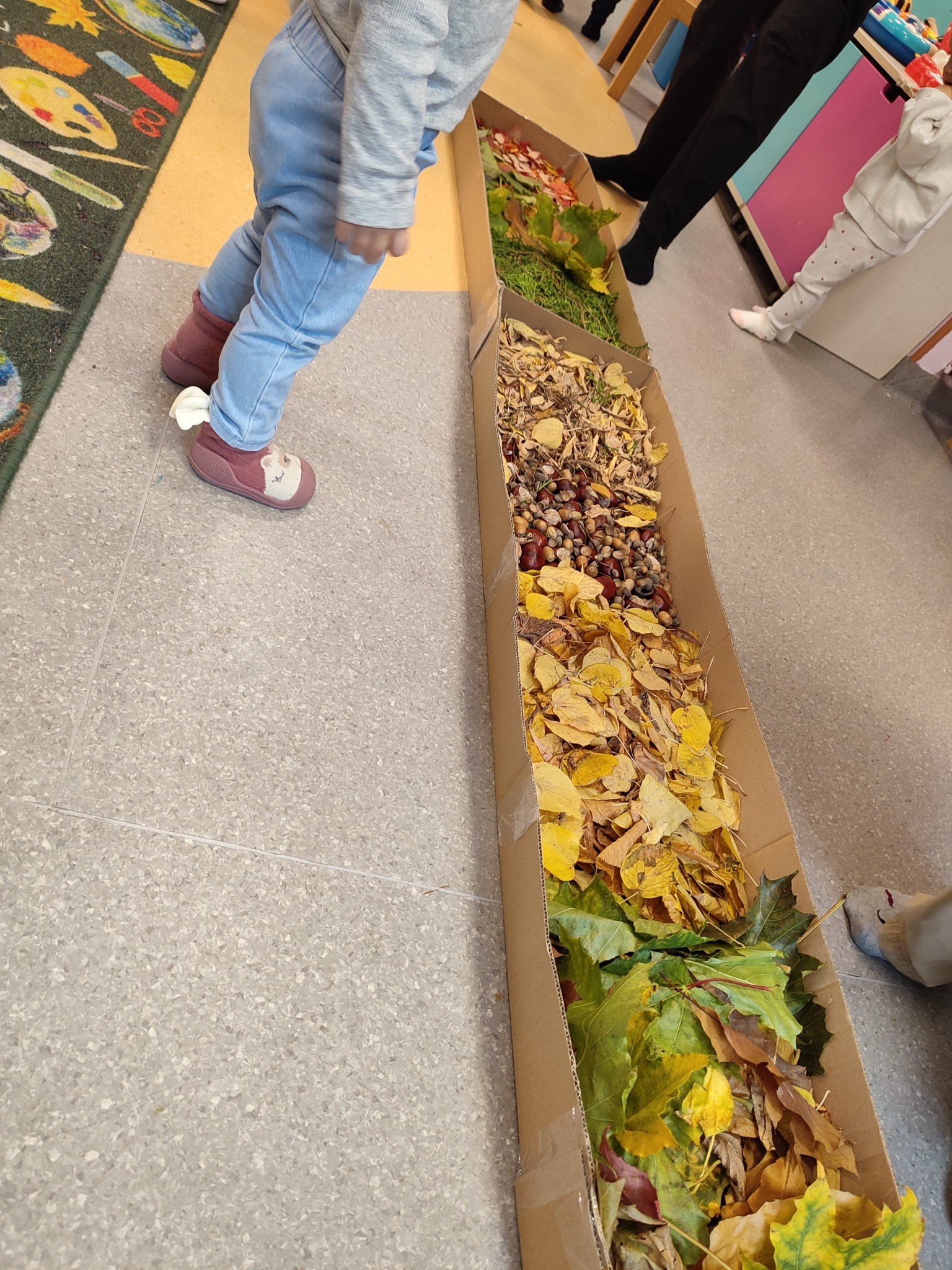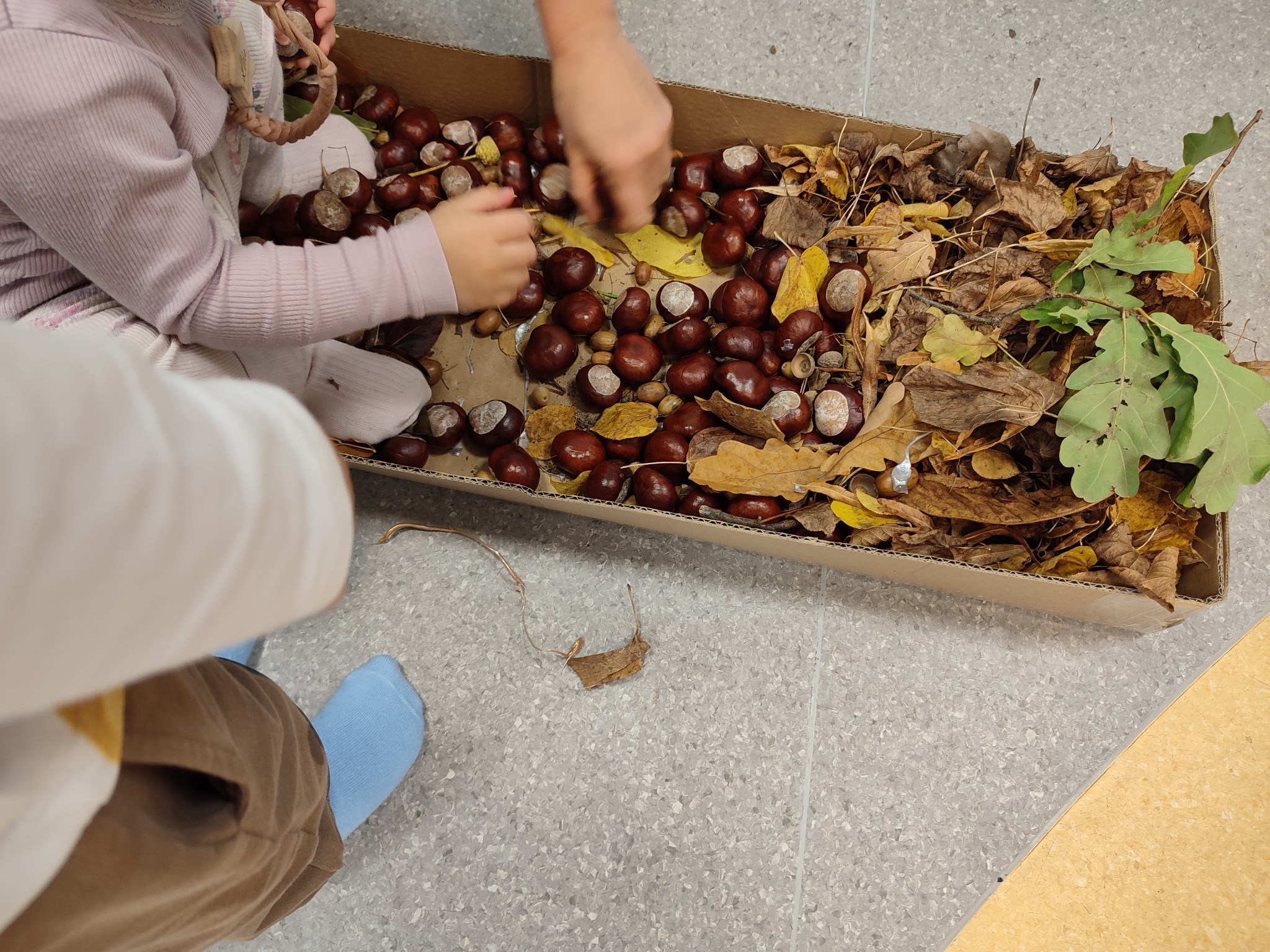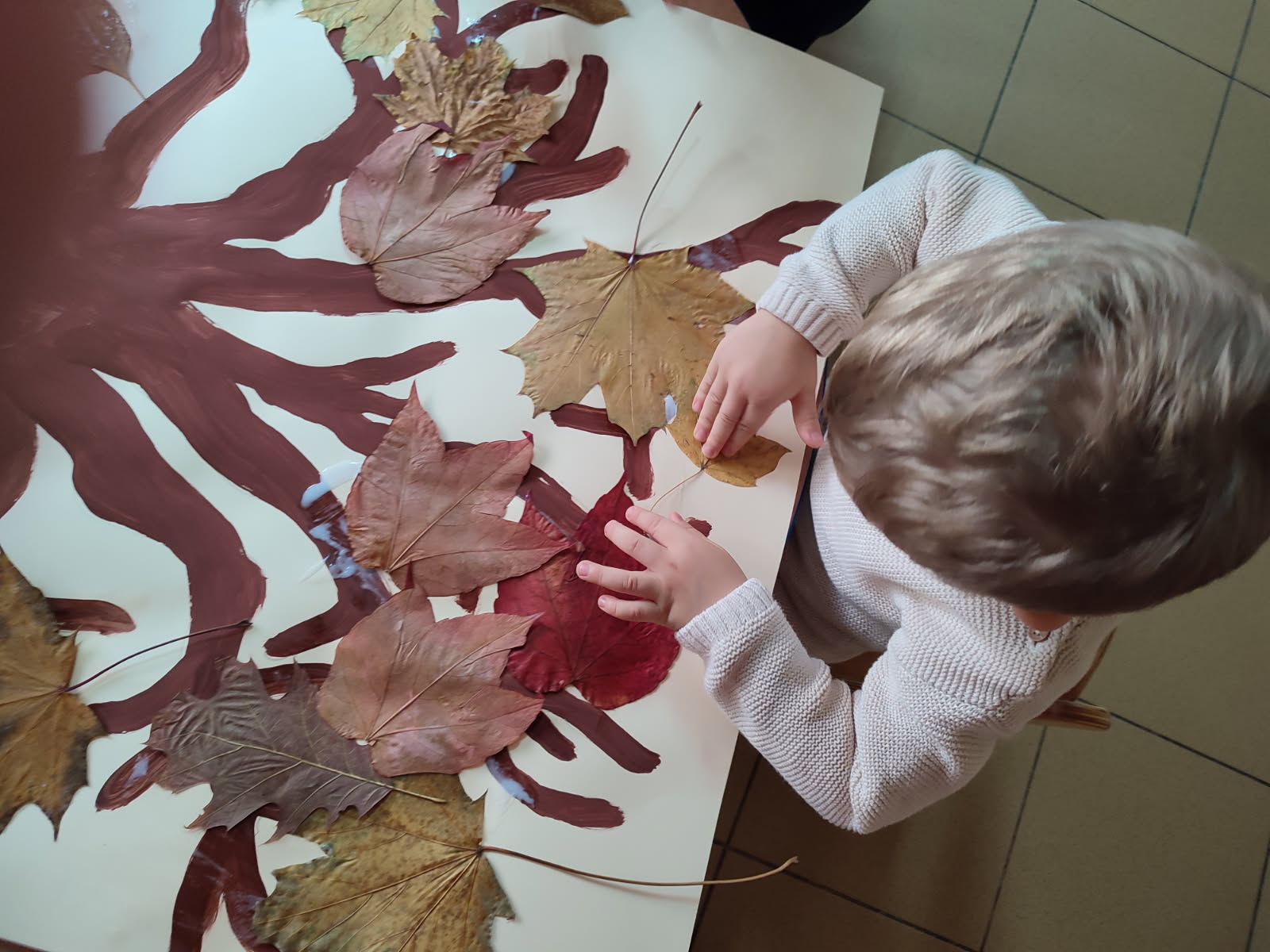 Nie zabrakło również zabaw sensorycznych — dzieci z radością dotykały, przesypywały i układały kasztany, żołędzie oraz kolorowe liście. Takie zajęcia rozwijały ich zmysły, wyobraźnię i motorykę małą, a przy tym dostarczały mnóstwo uśmiechu i radości.