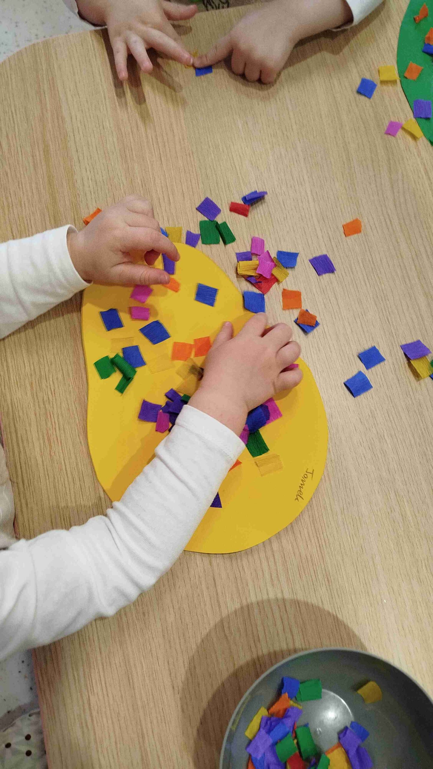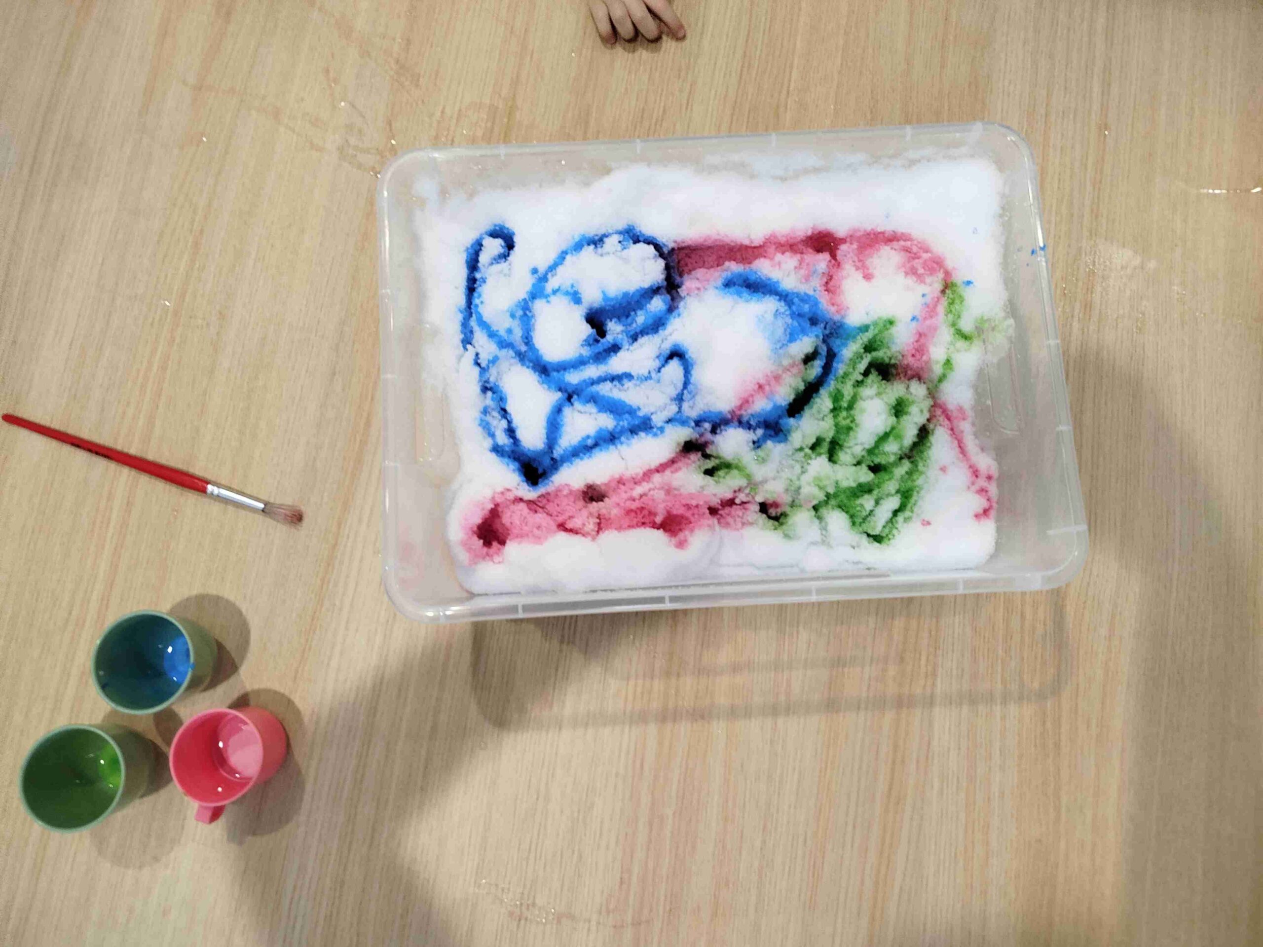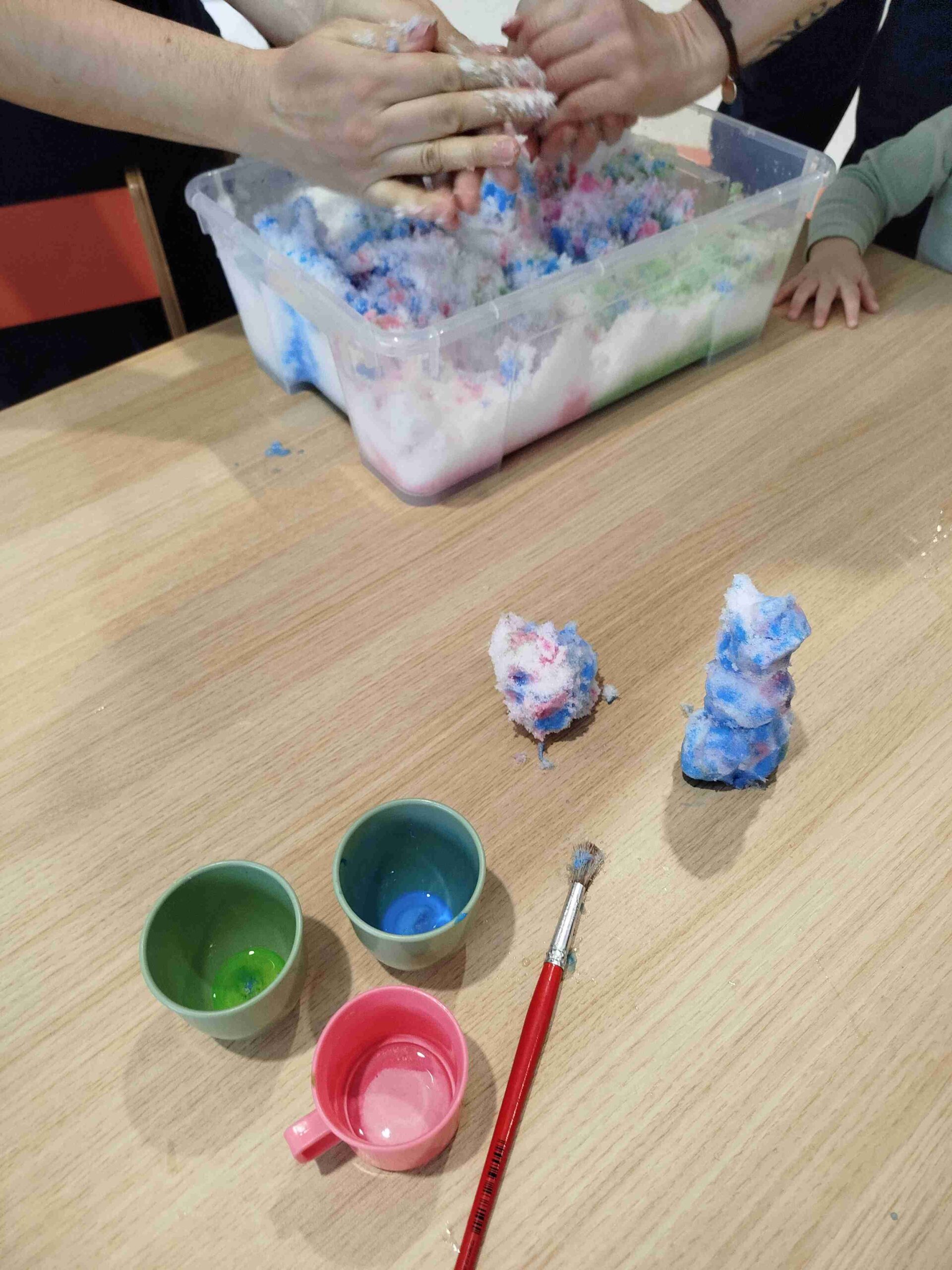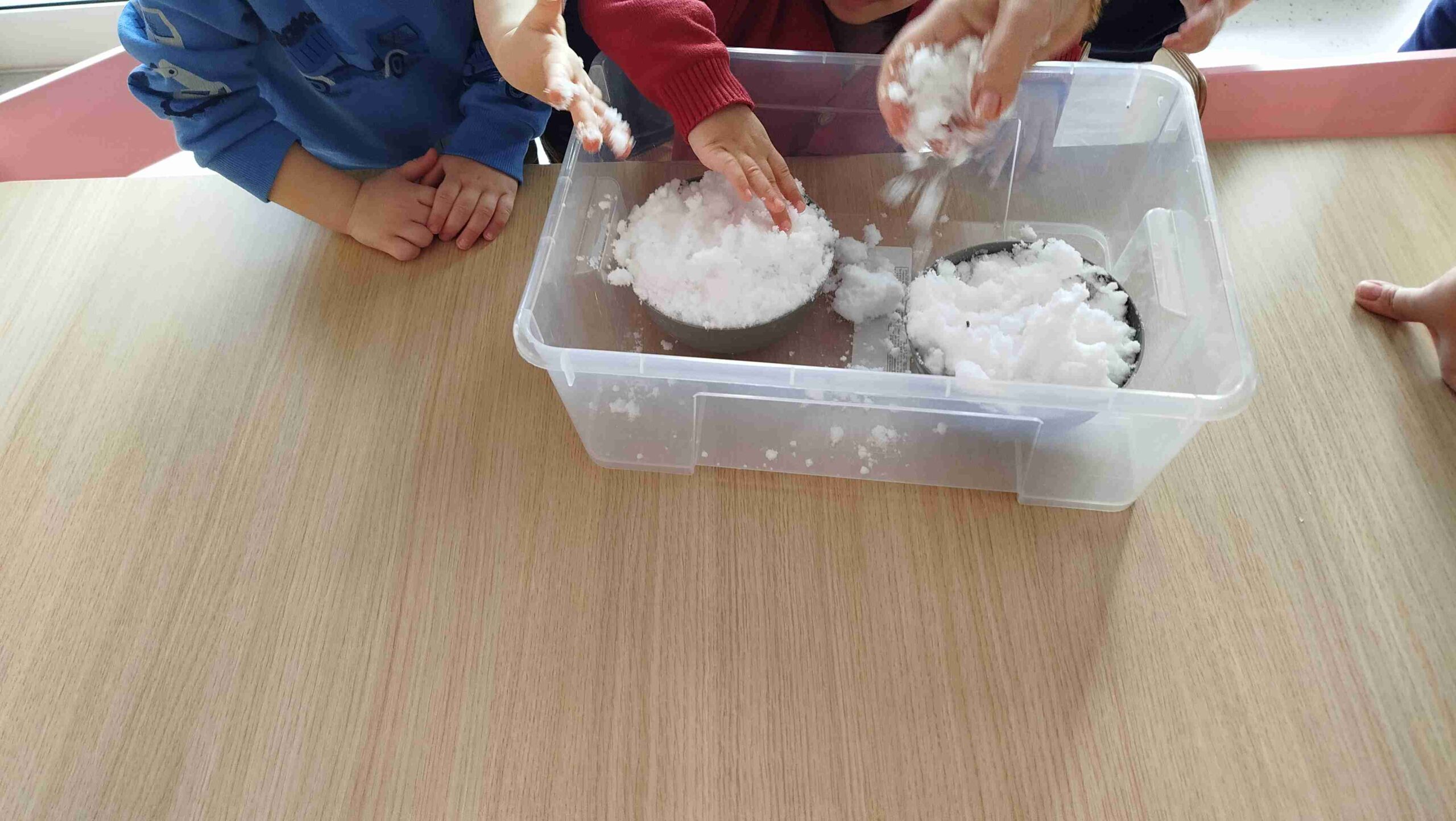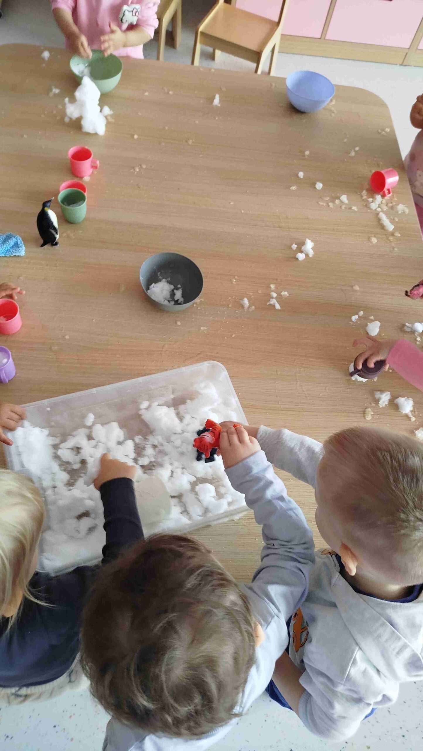 Nie zabrakło również zabaw sensorycznych – kolorowy lód wzbudził ogromną ciekawość i zachęcał do eksperymentowania, dotykania i odkrywania. Tworzyliśmy zimowe prace plastyczne, rozwijając kreatywność i sprawność manualną najmłodszych.
